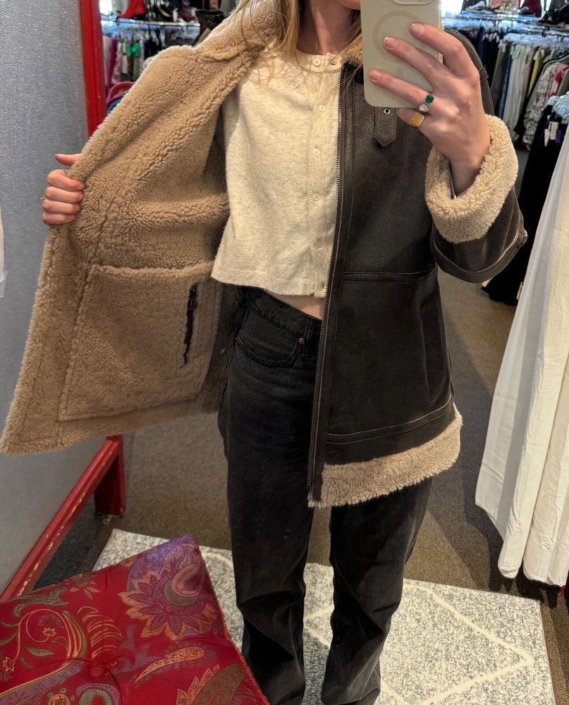 This coat is absolutely stunning—luxurious real leather and cozy shearling make it a winter essential. The reversible design is genius, and the taupe/brown shade is so versatile. Incredibly well-made, warm, and looks high-end. Got it as a gift but it’s too nice not to share!