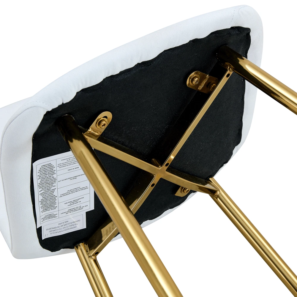 ✨ Key Features That Stand Out Timeless White & Gold Aesthetic : Crisp white PU leather seats pair seamlessly with glossy golden metal legs, creating a luxurious visual contrast that complements any interior style—from modern minimalist to industrial chic and traditional decor. It’s a classic color combo that never goes out of fashion! Integrated Molding Structure : One-piece backrest and seat cushion design delivers a sleek, smooth appearance while significantly boosting stability. No disjointed parts—just a cohesive look and reliable support. Cross Reinforcement for Maximum Durability : Hidden cross-bracing under the seat enhances structural integrity, upgrading load-bearing capacity to ensure long-lasting use for years to come. Integral Metal Leg Architecture : Solid one-piece metal legs eliminate excessive splicing, offering unmatched stability. The radiant golden finish adds a touch of opulence that elevates any space. Premium Comfort : High-resilience PU leather upholstery provides a soft, supportive seating experience—perfect for long meals or gatherings with friends and family. Effortless Assembly : Each set includes detailed, easy-to-follow instructions. Most users can assemble a chair in just 15-20 minutes—no professional tools needed! 📐 Product Specifications Item Details Assembled Dimensions (L×W×H) 17.00 × 15.30 × 34.50 inches Product Weight (per chair) 8.38 lbs Package Dimensions 29.53 × 25.20 × 18.70 inches Package Weight 44.09 lbs Material Premium Metal & PU Leather Color White + Gold 🛡️ Our Commitment to You We stand behind the quality of our products! Enjoy 1-Year Quality Warranty against manufacturing defects—we’ll repair or replace any faulty parts free of charge. Plus, take advantage of our 30-Day Free Return & Exchange Policy —if you’re not completely satisfied with your chairs, simply return them for a full refund or exchange, no questions asked. Note: Due to differences in monitor settings and lighting, slight color variations between the product and images are normal and not considered a defect. Perfect for dining rooms, kitchens, cafes, or home offices—this chair set brings luxury and practicality to any space. Add to cart today and transform your interior!