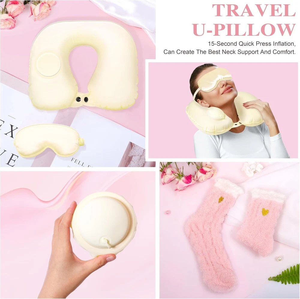 Looking for a very thoughtful birthday gift? Surprise your loved ones with this luxury birthday gift basket, specially curated for women. This gift set includes high-quality handmade gifts, making it the perfect birthday gift for mom, sister, best friend, girlfriend, or any special lady in your life. Show your care and love with this unique and unforgettable gift box, filled with quality items like a luxurious facecloth blanket, travel neck pillow, glass, aromatherapy candles, bath bombs, soft socks, handmade soaps, silk eye ma.s.ks, portable mirrors, and 3D birthday greeting cards. Each item in this thoughtful gift set is carefully selected to create a relaxing and luxurious experience that she will cherish. Add high-end touches to her birthday celebrations with this luxury ladies birthday gift set. This set includes luxurious and practical gifts like a portable neck pillow, plush blanket, soy wax candles, cozy socks, and a beautiful 3D birthday card. Surprise her with a sense of grandeur on her special day. Celebrate all the amazing women in your life with this birthday gift idea. Whether it's for your mom, wife, girlfriend, sister, or coworker, this gift set is the perfect way to express your love and appreciation on her special day. Choose from birthday basket gifts, cozy gift sets, birthday gift boxes, or womens gifts to make her day memorable Make her travels more comfortable with the ultralight inflatable travel pillow in this gift basket. This neck pillow provides superior support to reduce strain on the neck and shoulders, ensuring comfort wherever she goes. Made with a built-in air pump, this pillow is easy to inflate and adjust for the perfect support. Also included is a luxury plush flannel blanket for warmth and coziness during her journey. Travel-Friendly & Cozy Birthday Gifts for Women: Experience comfort on-the-go with the ultralight inflatable travel pillow and wrap up in our luxury plush flannel blanket. These practical yet luxurious items make our birthday gift basket for women a perfect blend of relaxation and portability.