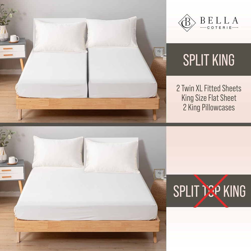 Store New Arrivals Add to Favorite View Feedback Contact Luxury Bamboo Split King Size Sheet Set | 100% Organically Grown Bamboo Viscose | Ultra Soft | Cooling for Hot Sleepers | 18" Deep Pocket [Ivory] Description Style Luxury Bedding Weave Type Sateen Pattern Solid Country of Origin China Theme Winter Number of Pieces 5 Unit Count 1 Count Pillowcase Quantity 2 Material Organically Grown | Viscose Made From Bamboo Item Display Dimensions 112 x 108 inches Age Range (Description) Adult Seasons Winter, Summer, Fall, Spring Package Dimensions 13.89 x 10.31 x 3.98 inches Closure Type Envelope Item Weight 14.4 ounces Special Feature Cooling, 18" Extra Deep Pocket, Hypoallergenic, Sateen Weave, Moisture Wicking Color Ivory Thread Count 400 Included Components 2 Pillowcases, 2- 18" Extra Deep Pocket Fitted Sheets, Flat Sheet Product Care Instructions Machine Wash, Tumble Dry Size Split King RECHARGE YOUR SOUL- Embrace yourself in the luxury of 100% viscose made from bamboo sheets and you will wake up feeling renewed and refreshed. Lightweight and silky, hypoallergenic and moisture-wicking, these sheets keep you cool in summer and warm in winter. REDEFINE YOUR LIFESTYLE- With a 400 thread count, the superior quality of these 100% viscose derived from bamboo sheets are a dream to sleep on, getting softer with every wash. The 18" extra deep pocket fitted sheet will fit even the most plush pillow top mattresses. RENEW YOUR SLEEP - You can rest well in luxury bedding knowing that your sheets have been tested and certified to be free of over 100 harmful chemicals with the OEKO-TEX 100 certification. REINVIGORATE YOUR RELATIONSHIP - Enhance every part of your relationship as you cozy up with your loved one and enjoy the silky, soft, woven bliss of 100% viscose made from bamboo. ADD TO CART WITH CONFIDENCE in our 100% Customer Satisfaction Guarantee! Product Description Slip Into Luxurious Comfort With 100% Bamboo Viscose Bedding The video showcases the product in use. The video guides you through product setup. The video compares multiple products. The video shows the product being unpacked. How should I care for my Bella Coterie sheets to maintain their quality and durability? Simply wash and dry. Bella Coterie bamboo sheets are designed with durability in mind to resist fading and pilling. Are Bella Coterie sheets designed for a secure fit? From deep pockets that ensure a perfect fit, to non-slip straps that keep everything in place - Bella Coterie sheets are thoughtfully crafted for comfort and function. Are these sheets made from sustainable materials? Our 100% organically grown bamboo viscose sheets are OEKO-TEX Standard 100 certified, meaning every component has been tested for over 100 harmful chemicals. Rest easy knowing you're wrapped in sheets that are free from toxins and pesticides. Why choose Bella Coterie bamboo viscose sheets over cotton or synthetic? Bamboo is naturally cooling to reduce night sweats, hypoallergenic for sensitive skin, and is moisture wicking to keep your sheets dry and free of allergens.. Are Bella Coterie Sheets soft to the touch and breathable? Say goodbye to rough and scratchy sheets! Organically grown bamboo viscose offers unparalleled silky softness without synthetic fibers that can irritate skin. Experience cooling comfort - naturally breathable for temperature control. Bella Coterie Luxury Bedding Add to Cart Add to Cart Add to Cart Customer Reviews 4.4 out of 5 stars 3,685 4.3 out of 5 stars 97 4.5 out of 5 stars 422 4.5 out of 5 stars 287 Price $129.99 $ 129 . 99 $129.99 $ 129 . 99 $29.74 $ 29 . 74 — Material 100% Viscose from Bamboo 100% Viscose from Bamboo 100% Viscose from Bamboo 100% Pure 6A Mulberry Silk Secure Fit 18" Extra Deep Pockets 8 Corner Ties & Button Closure Envelope Sham Zipper Closure Fabric Feel Silky Smooth & Cool to Touch Silky Smooth & Cool to Touch Silky Smooth & Cool to Touch Ultra Soft & Breathable Temperature Regulating Breathable & Cooling Breathable & Cooling Breathable & Cooling Cozy & Cool Designer Color Collection 16+ Colors Available 14+ Colors Available 16+ Colors Available 10+ Colors Available Machine Washable ✔ ✔ ✔ ✔ Anti-Pilling / Anti-Fading ✔ ✔ ✔ ✔ OEKO TEX Certified ✔ ✔ ✔ ✘ ABOUT US We offer the best prices around on high quality products. Our E-store includes media such as books, movies, music and games while offering electronics, toys, sporting apparel, clothing, tools, general home, garden items and more. SHIPPING We are always working hard to ensure your package arrives as soon as possible. Please understand that some factors like weather, high postal traffic, and the performance of shipping companies are outside of our control. We offer free shipping to the lower 48 states and ship within 2 business days of payment, usually sooner. We do not accept P.O. Boxes. Please provide a physical address. For shipping outside of the continental USA, we only use eBay's Global Shipping Program.The item is shipped to KY and then sent to the rest of the world. International customers are responsible for all duties and taxes. Continue to check out in order to calculate costs for shipping the item to your country. Messages regarding eBay's Global Shipping Program MUST be directed at eBay EXCLUSIVELY. RETURNS We offer a 30-Day Return Policy on items which you are not completely satisfied with. You have the option for a full-refund or an exchange of the item. No returns are available on items shipped outside of the USA. PAYMENT We accept PayPal. CONTACT US This page content is yet to come Please ad us to your favorite seller and visit again later Thank You CUSTOMER SATISFACTION We try our very best to make sure every customer is completely satisfied. If there's a problem, message us! We're happy to help.