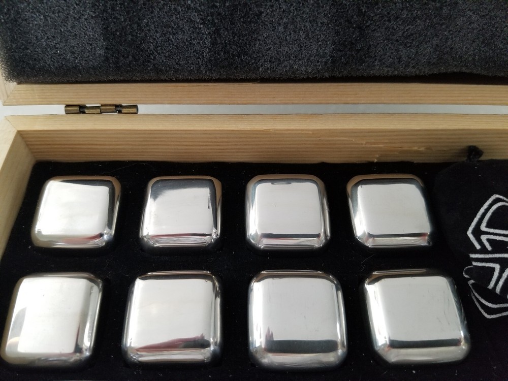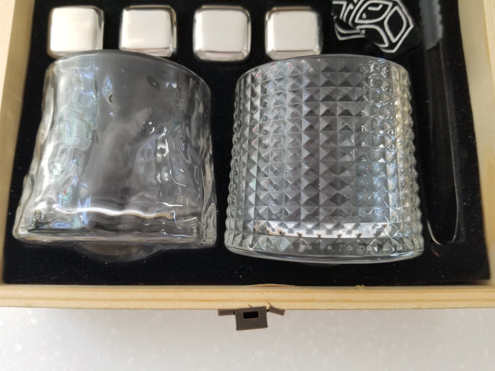Elevate your whiskey drinking experience with this premium set of glass whiskey glasses and chilling stones. The set comes in a wooden hinged box and includes 2 glasses and tongs. The square shape of the stones ensures that they are easy to handle and store, while the stainless steel material guarantees durability. With 8 stones in the pack, you'll have enough to keep your drink cool without diluting it. Great Gift. Brand New. Please view photos.