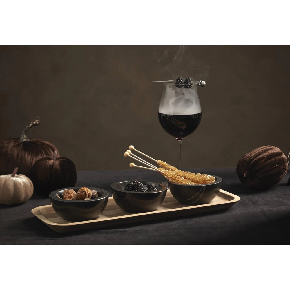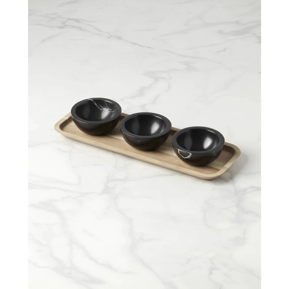 Simple meets sublime in these LX Collective dip bowls and serving tray. Juxtaposing modern marble bowls with an earthier wooden tray, the set comes together with a timeless appeal you'll appreciate for all your events.At , we strive to make the daily moments in your life a bit more special. Inspired by heritage and designed for now, we bring a rich history of craftsmanship to modern day life. We’ve been a part of homes for over 130 years. Each time you buy , you are buying a versatile and timeless piece crafted with our century-long commitment to quality, artistry and beauty. Whether you’re gathering the family for dinner, grabbing a midnight snack for yourself in front of the TV or having friends over, is for real moments that last on products that are meant for living. Materials: marble and wood Hand wash Includes (1) wooden serving tray and (3) marble dip bowls Tray measures 15"L x 5"D x 0.75"H; 4-oz bowl capacity Imported Promise
