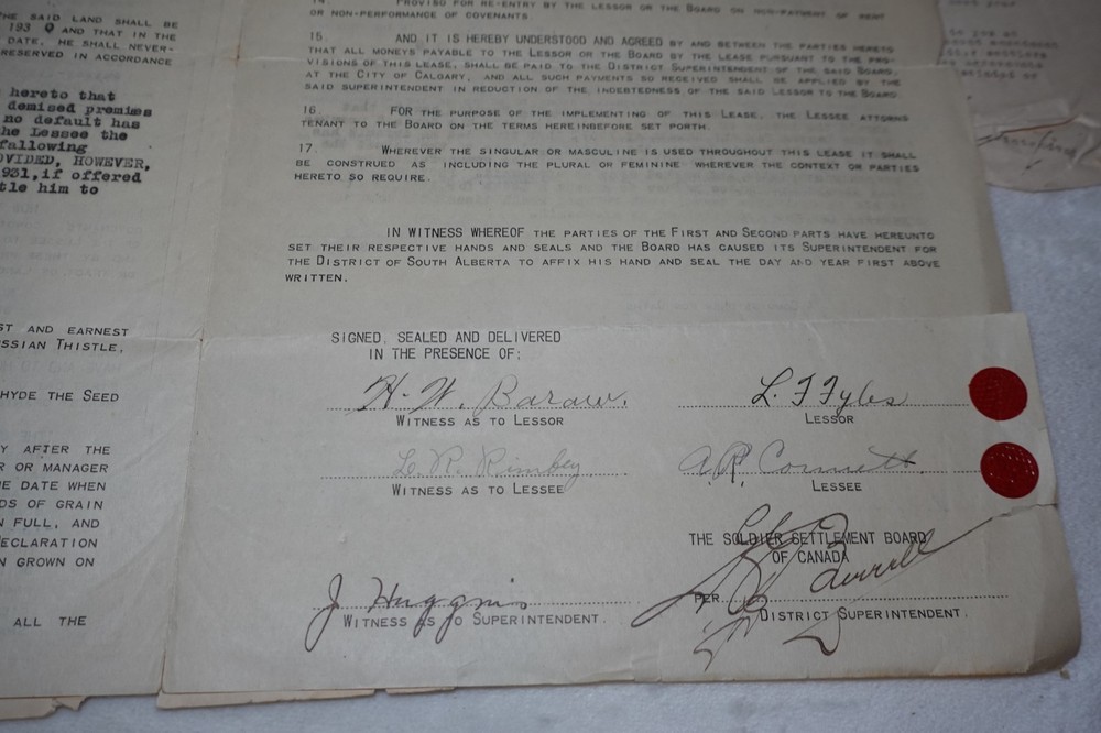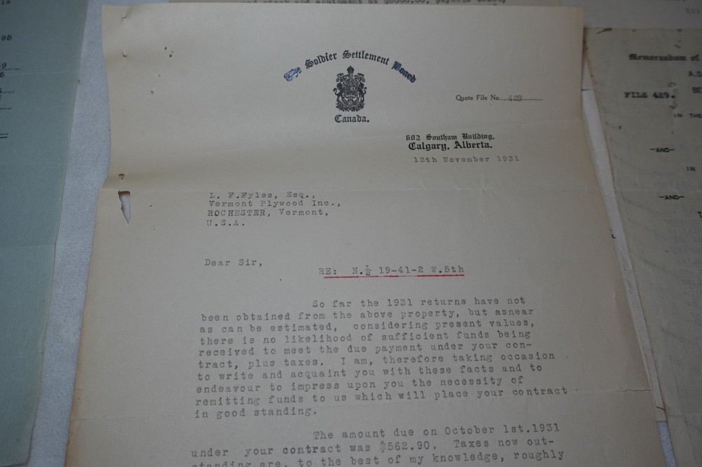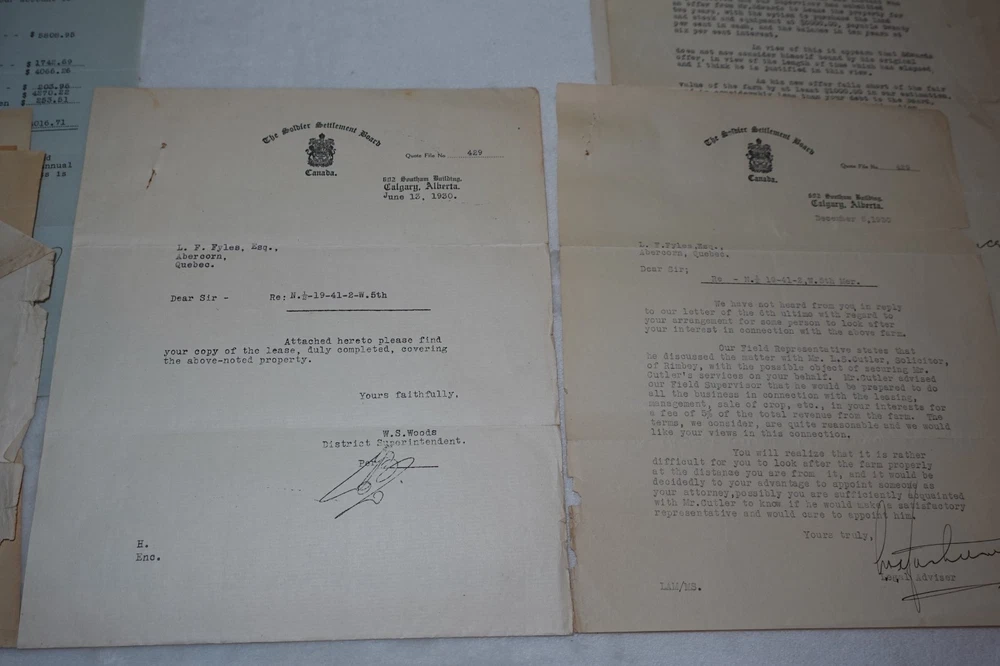 Lyndon F. Fyles Canada Soldier Settlement Board 1928-35 Abercorn Que Ephemera Papers Lot Papers related to Lyndon F. Fyles of Abercorn, Quebec. Fyles also appeared to have connections to Vermont. Years range from 1928 to 1935. Other cities mentioned on the papers are Calgary, Alberta, Rochester, Vermont, and Rimbey, Alberta. Fyles was born in 1891 and died in 1969. There are approximately 48 items (pages) in this lot. Pages range in size from 3 3/8" x 8" to 8" x 13". Documents mention the Soldier Settlement Board of Canada (Fyles was a World War I veteran), property, finances, and other topics. Included are a couple handwritten notes and letters. Some documents appear to be copies. Items are in weathered condition with heavy tearing, edge chipping, holes, folds, creasing, fading, dinged edges and corners, turned corners, staining, age discoloration and marks. Some documents have considerable tearing. Documents also have holes where staples or pins were removed. A couple of pages are stuck together. There is writing on the reverse side of documents, mainly arithmetic or notes. Please see photos for more information on condition and ask any questions you may have.