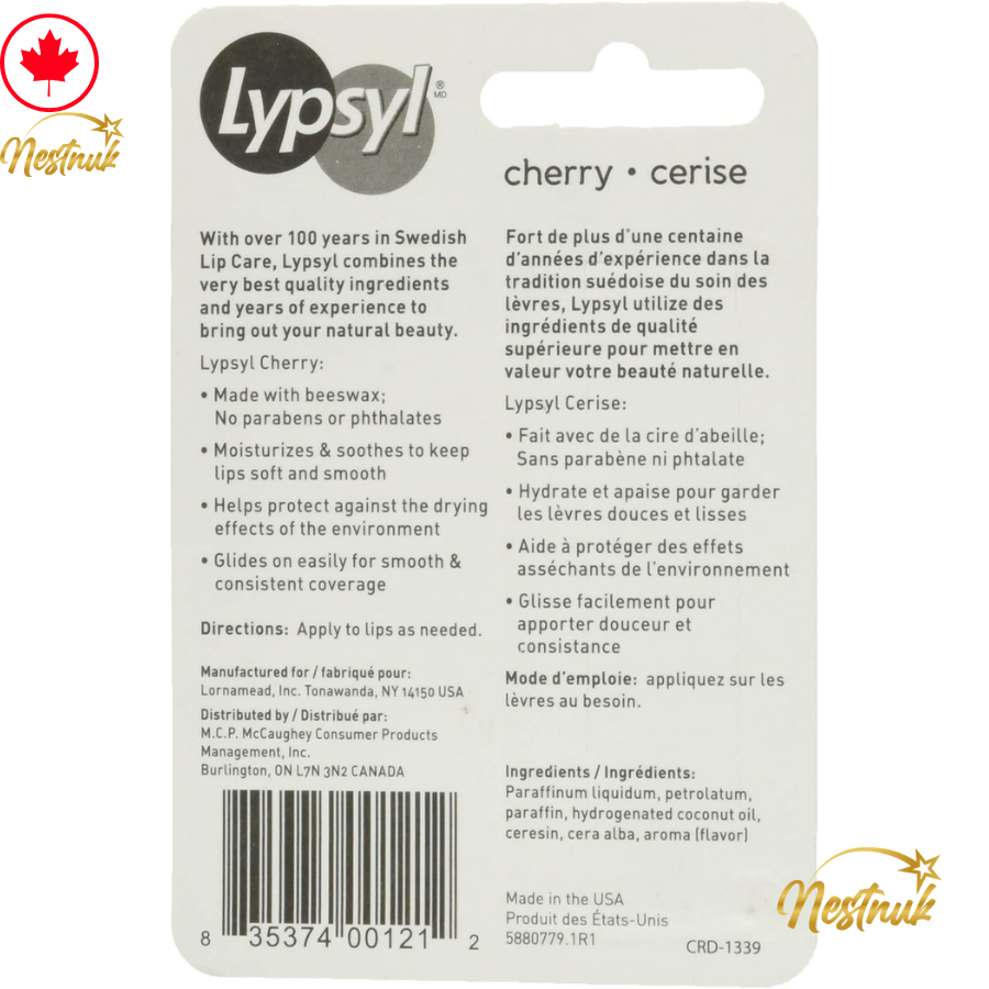 UPC: Does not Apply Size: 4.2g gtin13: Does not Apply Type: Lip Balm Department: Unisex Brand: Lypsyl Color: Red Formulation: Balm Country/Region of Manufacture: Canada Scent: Cherry Main Purpose: Chapped Lips, Cracked Lips, Dry Lips