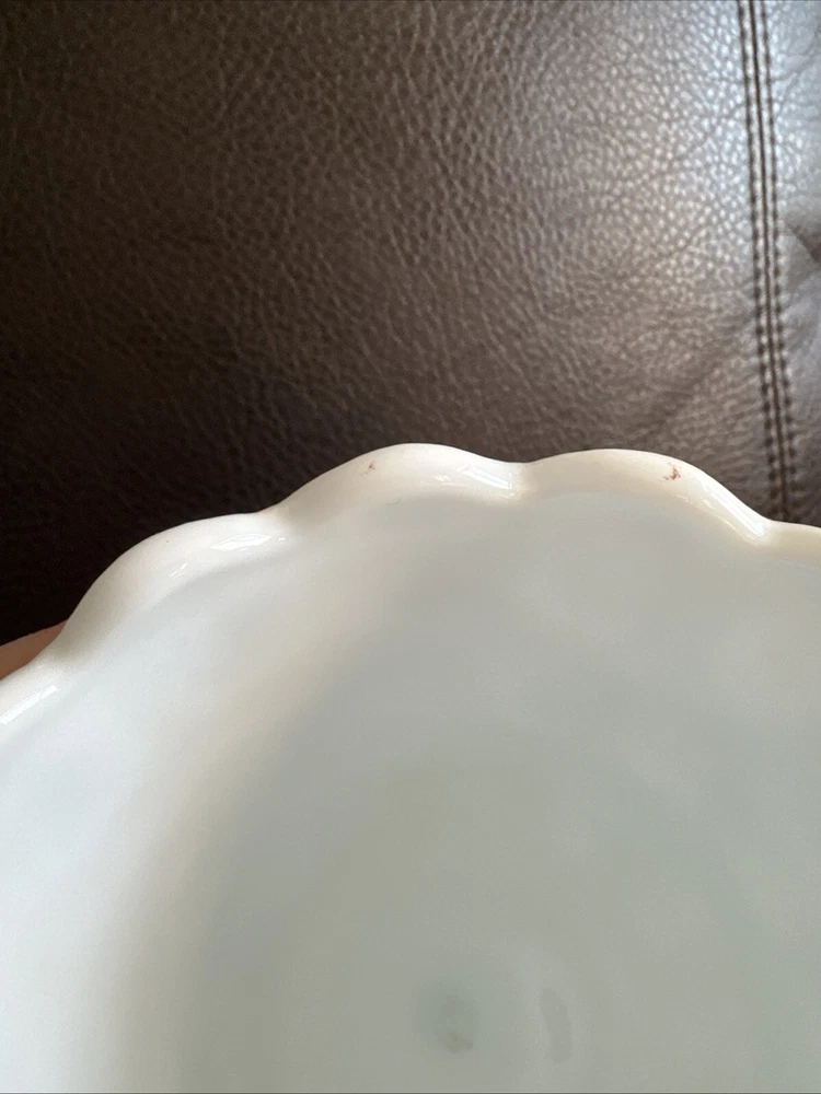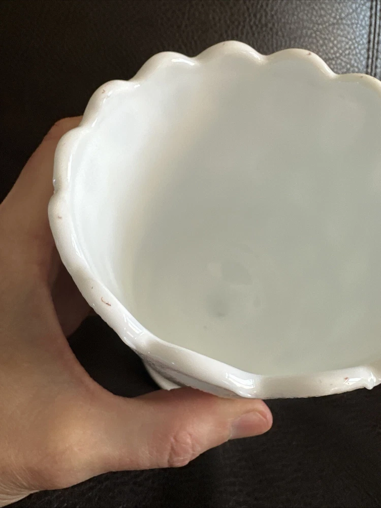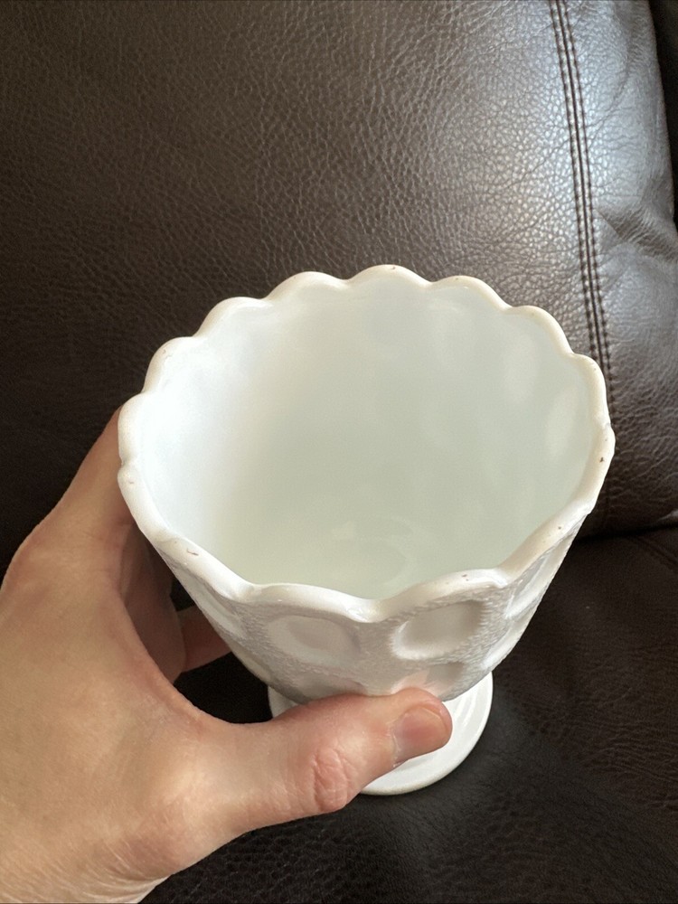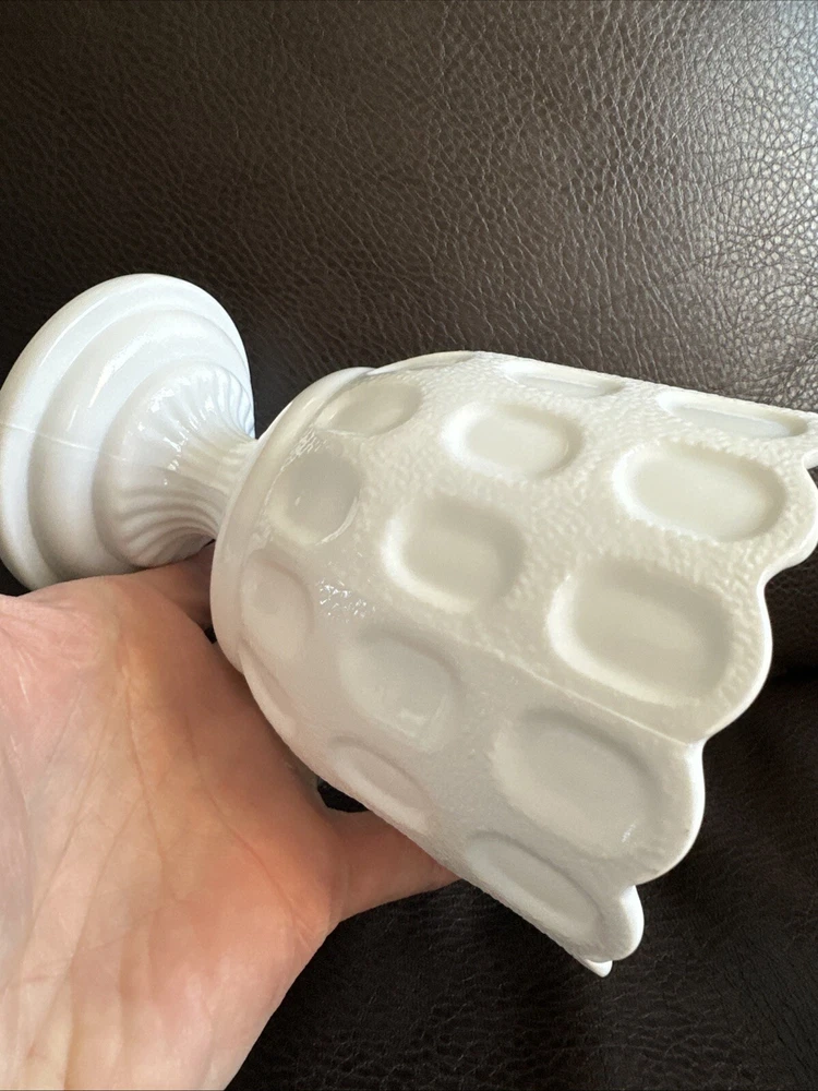 This is a vintage M Brody white milk glass vase, compote, candy bowl, or planter. It features a thumbprint design, scalloped rim, and pedestal footed base. The item is round with a diameter of 4.5" and a height of 6". Produced in the mid-20th century in America, this versatile piece has a glossy finish and a thumbprint solid white pattern. It is an original piece with an impressed backstamp. Good used condition, normal wear, no chips or cracks, see pics.