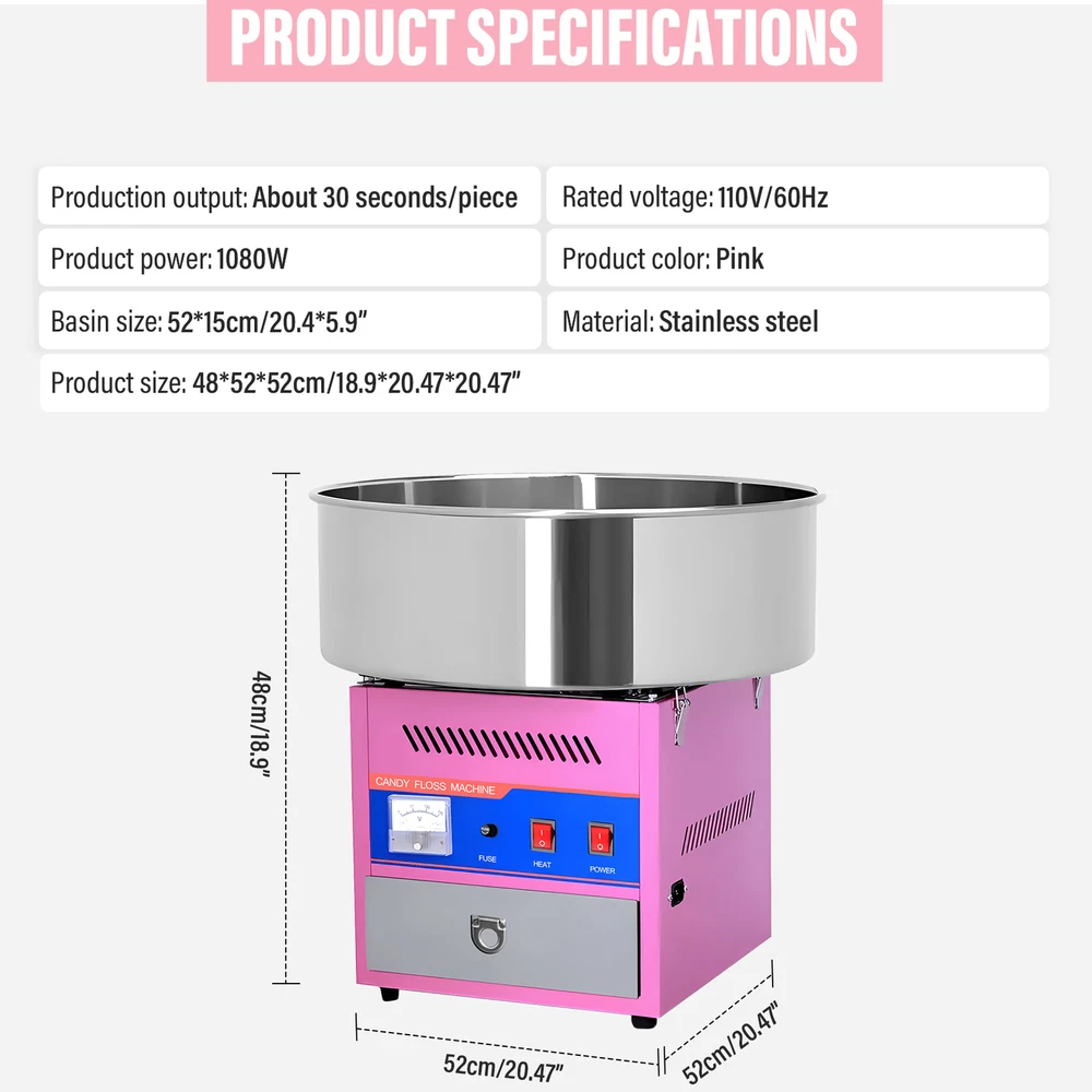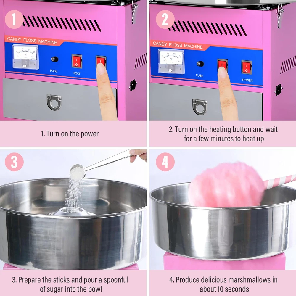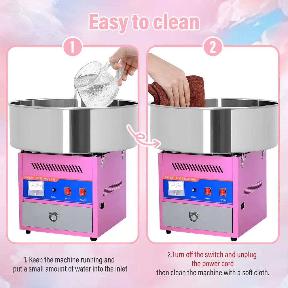 Store category Sign Up Now ! You may also like Product Description Optimal Organization: This cotton candy machine commercial is designed with a spacious bowl, allowing you to make large amounts of cotton candy at once. It includes 3 storage drawers, a sugar scoop, and an extra motor driven belt built-in drawer for accessories and supplies, providing easy access and organization. Fluffy Goodness Guaranteed: This cotton candy machine ensures fluffy goodness every time with its pressure-free heating system that heats the floss at the optimal temperature. Fast and Fun: Simply turn on the power, pour the sugar into the rotating head, set the temperature as desired, wait 2-3 minutes to warm up, and use the skewers to make fluffy cotton candy in minutes. Easy to operate and enjoy. Ideal Choice: Tired of waiting in long lines for cotton candy? Our commercial cotton candy machine is your ideal convenience. Perfect for birthday parties or wedding receptions, it's lightweight and compact, easily mountable on any desktop. The perfect gift for cotton candy lovers. Safety Feature: A safety latch prevents the machine from leaving the bowl open while it is running, locking securely and ensuring a smooth and quick operation. Our machine uses skewers to ensure your marshmallows are heated evenly, and prevents the machine from leaving the bowl open, allowing for safe and stress-free use. Specification: Easy to use: Turn on the machine and wait a few minutes for it to heat up, pour in the marshmallows and start spinning them! Convenient: Includes 3 storage compartment storage drawers, sugar scoop and extra motor drive belt! Power switch, heat controller and voltmeter are located on the front panel. Caution: Machine is equipped with safety devices to prevent injury. It will not open unless the bowl is properly secured. Voltage: 110v Product color: Pink Production output: Approx. 30 seconds/pc Sugar bowl material: Stainless steel Product power: 1080w Packing list: Cotton Candy Machine X1 Payment Delivery details Terms of sales About us Feedback & DSRs Payment Before you palce an order, please kindly make sure that you have a paypal account. We accept PAYPAL payment only. Payment should be completed within 2 days after auction closed, or unpaid dispute will be filed for an closing auction. An unpaid case will be filled after 4 days. Delivery details We ship to your eBay address. Each package will be shipped to US by UPS Regular Parcel with tracking number. Please check your shipping address carefully before checkout, it can't be changed if order completed. All items will be shipped within 1-2 business day upon receipt of payment.Orders placed on weekend will be shipped within 3 days. If you do not receive your item in 7-10 business days.please contact us immediately for further assistance. We will be responsible for any damages or losses incurred in the shipping process. About us We maintain high standards of excellence FIVE STAR and strive for 100% customer satisfaction! Positive Feedback is very important to us. We hope that you contact us immediately Before you give us neutral or negative feedback, so that we can satisfactorily address your concerns. We promise to offer the lowest price and high quality produce. Our working time: From Monday to Friday(9:30 am to 18:00pm), we don't working on holidays ,hope you can understand and know that , thank you. Please always talk to us via ebay Message. We appreciate your business and look forward to growing our e-Bay sales with satisfied customers. Feedback Contact us If you have any questions, please feel free to contact with us by ebay Message during our business hours ( 9:30a.m. to 5:30 p.m.), or email us through eBay, we will try our best to help you to resolve it. For any presale or after-sale questions,please do feel free to email us! Due to the time difference, each email will be replied within 1 working day,and weekend will be delayed a bit. Feedback