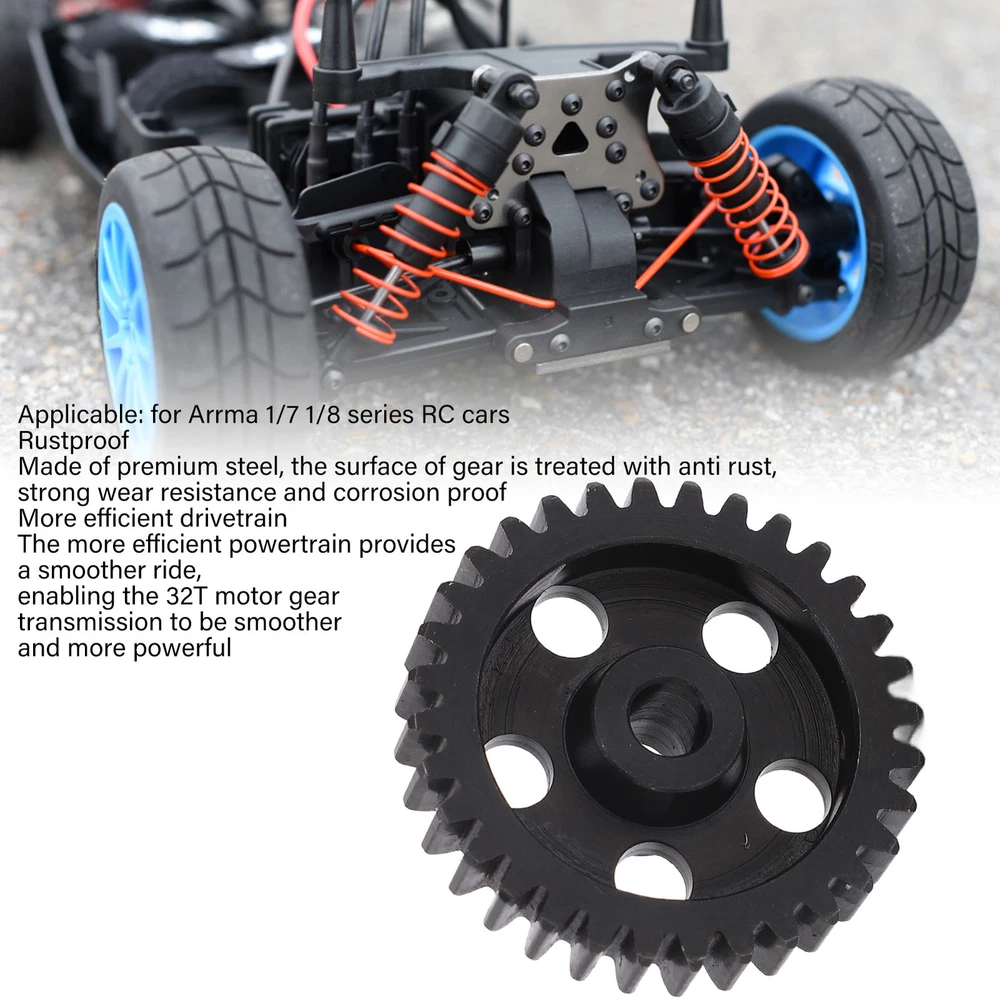 Feature: 1. Applicable : This motor pinion is suitable for Arrma 1/7 1/8 series RC cars, ideal replacement for old or damaged originals. 2. Anti Rust: Made of premium steel material, the of the gear is treated with anti rust, which has strong wear resistance, corrosion proof, good performance and long service life. 3. More Efficient Drivetrain: The more efficient drivetrain provides a smoother ride, making the 32T motor gear transmission smoother and more powerful. 4. Precise Machining: Precise machining, good machining makes the gears roll smoothly, with fixed screw holes, easy installation, simple , and machine screws are provided in the package. 5. Improved Gear Mesh: Provides improved gear mesh, great spares, the gears provide overdrive for the axles to make your RC car perform better. Specification: Item Type: RC Motor Pinion Gear Material: Steel Gross Weight: 29g / 1.0oz Type: RC Accessories Color: Black Teeth: 32T Gear Diameter: Approx.34mm / 1.3in Gear Width: Approx.11mm / 0.4in Metric Spacing: M1.0 Gear Aperture: Approx.5mm / 0.2in Applicable: for Arrma 1/7 1/8 series RC cars Suitable: for 5mm diameter shaft Package List: 1 x 32T Motor Gear 2 x Machine Screw 1 x Wrench Note: 1. Due to manual measurement, please allow 1‑3mm error, thank you! 2. Due to the difference between different monitors, the picture may not reflect the actual color of the item. 1. Our listing price includes the value of goods,packaging cost,and export taxes,not including international duties. 2. duties,taxes,and charges are not included in the item price or shipping fee. 3. T he duties are buyers' responsibility .Please check with your country's customs office determine what these additional costs will be prior to your purchase. 4. All disputes arising from the duties will be submitted to ebay for solution. 1. Any questions, pls. contact us via ebay message or email us. We will reply your message within 48 hours. If you do not receive our reply within 48 hours, pls. post a message again because sometimes our message system may block some emails. 2. If you are satisfied with our service, pls. kindly leave us a positive feedback and give us the Detailed Seller Rating with all " 5 " in very area 3. Our aim is to provide Level Customer Service, your recognition will encourage us greatly and serve you better. We strive to keep all our customers satisfy. We will do our up most to exceed your expectations in customer service, communication and dispatching of your orders. On Jan 9, 2025 at 10:00:36 PST, seller added the following information: