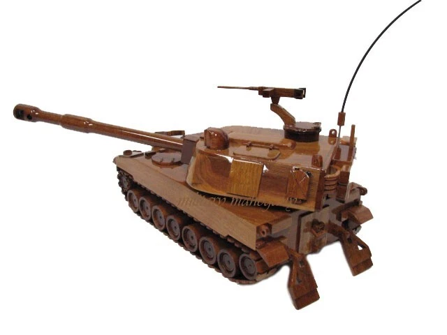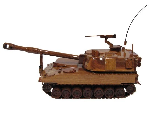 Military Mahogany is proud to announce the release of our newest addition to the field artillery family, the M109A4 Paladin. This handcrafted mahogany wood tank model is an extremely beautiful replica of the M109A6 Paladin tank and comes loaded with some amazing features and details. For starters this model features a main gun support that can be stowed up or down, fire support plates in rear that stow up for travel and lock down for blast support, turret rotates 360 degrees as does the commanders 50 cal. This model is huge weighing close to 5lbs, is 17" in length, 6" wide and 7" in height . Dimensions: 17" Length 7.5" Width 6" Height