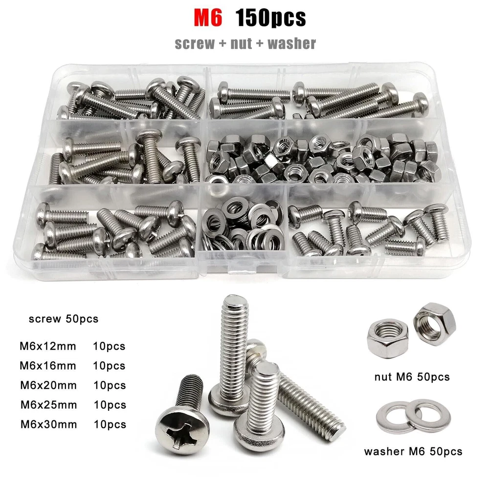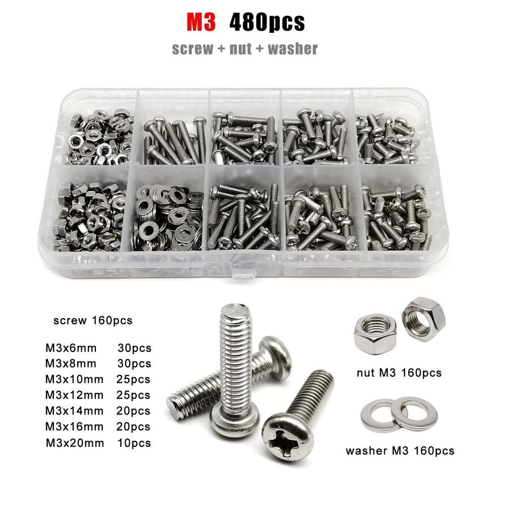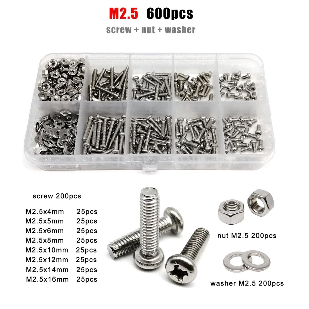 Material 304 (A2-70) stainless steel Box include M1.6 : total 1200pcs + 2pcs screw driver (free) screw 400pcs + nut 400pcs + washer 400pcs + driver 2pcs M2 : total 660pcs + 2pcs screw driver (free) screw 220pcs + nut 220pcs + washer 220pcs + driver 2pcs M2.5 : total 600pcs + 1pc screw driver (free) screw 200pcs + nut 200pcs + washer 200pcs + driver 1pc M3 : total 480pcs + 1pc screw driver (free) screw 160pcs + nut 160pcs + washer 160pcs + driver 1pc M4 : total 360pcs + 1pc screw driver (free) screw 120pcs + nut 120pcs + washer 120pcs + driver 1pc M5 : total 240pcs + 1pc screw driver (free) screw 80pcs + nut 80pcs + washer 80pcs + driver 1pc M6: total 150pcs + 1pc screw driver (free) screw 50pcs + nut 50pcs + washer 50pcs + driver 1pc M8 : total 75pcs + 1pc screw driver (free) screw 25pcs + nut 25pcs + washer 25pcs + driver 1pc On Jan 9, 2026 at 03:51:13 PST, seller added the following information:
