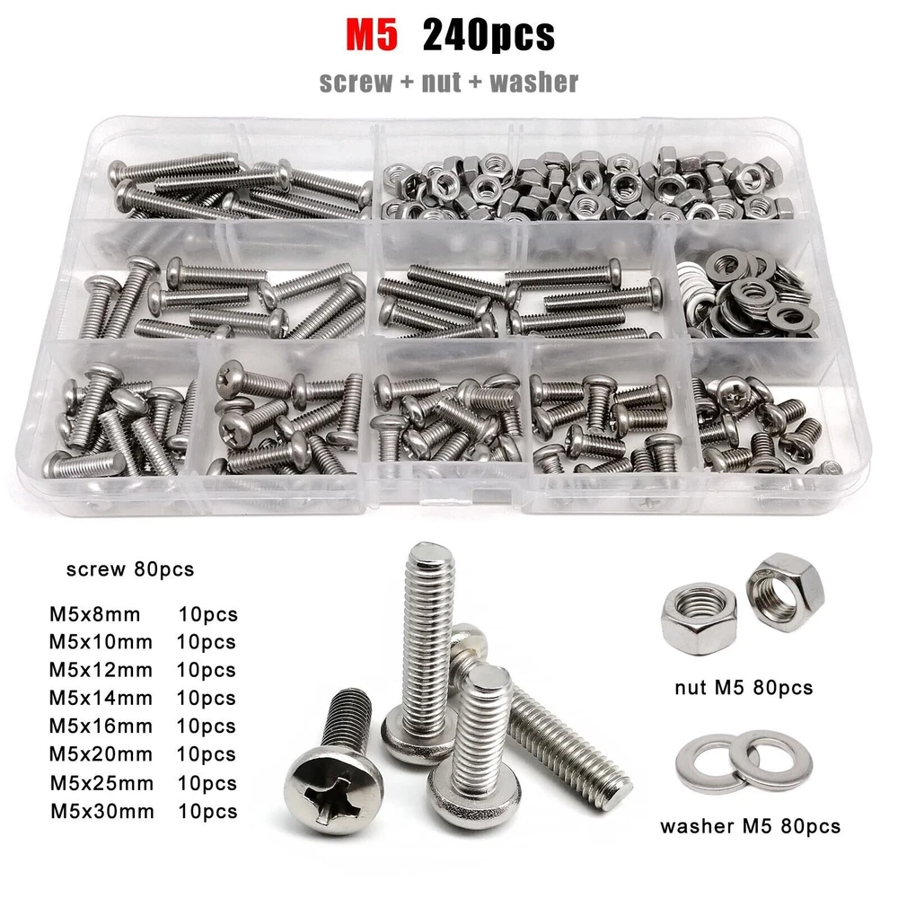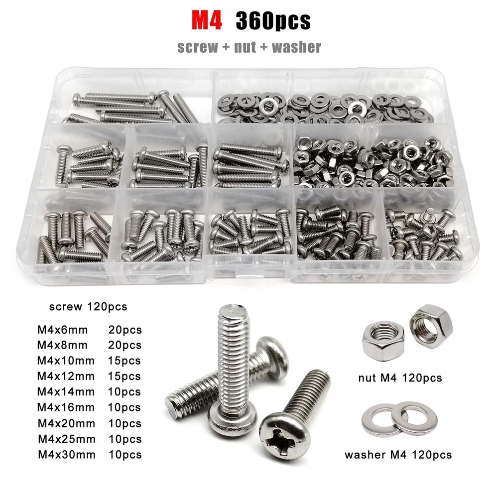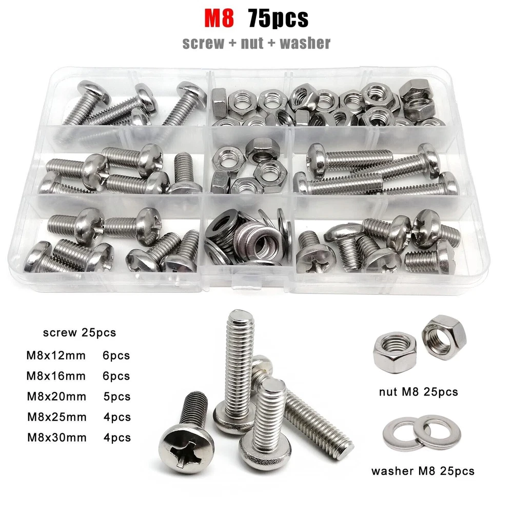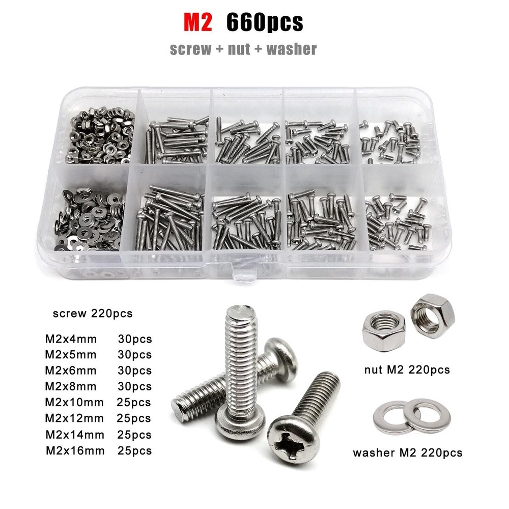 Material 304 (A2-70) stainless steel Box include M1.6 : total 1200pcs + 2pcs screw driver (free) screw 400pcs + nut 400pcs + washer 400pcs + driver 2pcs M2 : total 660pcs + 2pcs screw driver (free) screw 220pcs + nut 220pcs + washer 220pcs + driver 2pcs M2.5 : total 600pcs + 1pc screw driver (free) screw 200pcs + nut 200pcs + washer 200pcs + driver 1pc M3 : total 480pcs + 1pc screw driver (free) screw 160pcs + nut 160pcs + washer 160pcs + driver 1pc M4 : total 360pcs + 1pc screw driver (free) screw 120pcs + nut 120pcs + washer 120pcs + driver 1pc M5 : total 240pcs + 1pc screw driver (free) screw 80pcs + nut 80pcs + washer 80pcs + driver 1pc M6: total 150pcs + 1pc screw driver (free) screw 50pcs + nut 50pcs + washer 50pcs + driver 1pc M8 : total 75pcs + 1pc screw driver (free) screw 25pcs + nut 25pcs + washer 25pcs + driver 1pc On Jan 9, 2026 at 03:51:13 PST, seller added the following information: