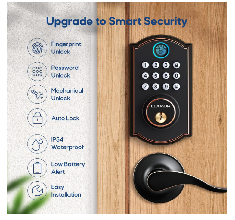 Advanced Fingerprint Unlock: Equipped with cutting-edge biometric recognition, our smart door lock identifies fingerprints in 0.3 seconds and unlocks in 1 second with a 99.99% accuracy rate, ensuring fast and reliable access. 3-in-1 Keyless Unlock: Our fingerprint door lock with 2 Lever handles supports up to 100 fingerprints and 50 PIN codes, perfect for large families or shared spaces. It includes 2 backup keys for emergencies, and no app or Wi-Fi is needed—your finger is the key to unlocking. Auto Lock & One-Touch Locking: The automatic locking feature secures your door 5–30 seconds after unlocking, ensuring safety even if you're distracted. One-touch locking adds convenience for quick and secure closure. Durable & Long-Lasting: Built with a robust aluminum alloy, IP54 waterproofing, and a durable lock cylinder, the front door handle sets includes a low-battery LED indicator and emergency USB Type-C power supply, offering lasting reliability and protection. Easy to Install: Install in minutes with a basic screwdriver. The adjustable design fits most door frames, with a center distance range of 2-3/8" (60mm) to 2-3/4" (70mm) for seamless integration.