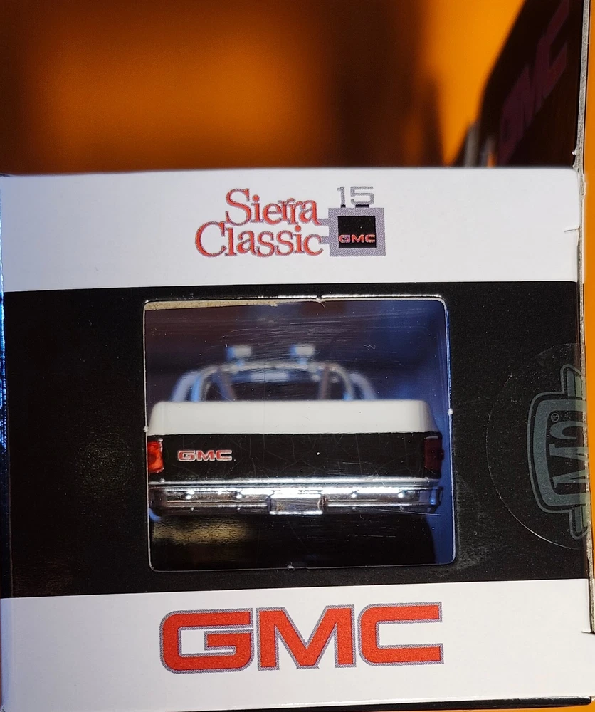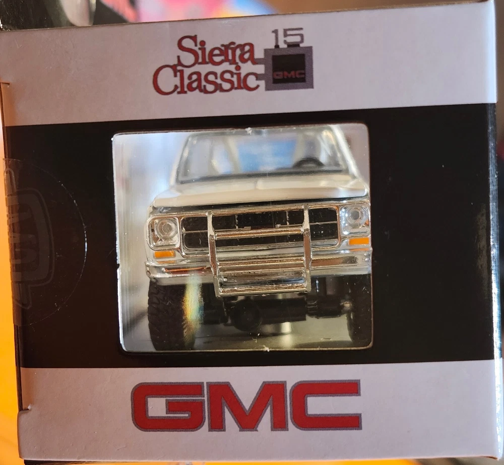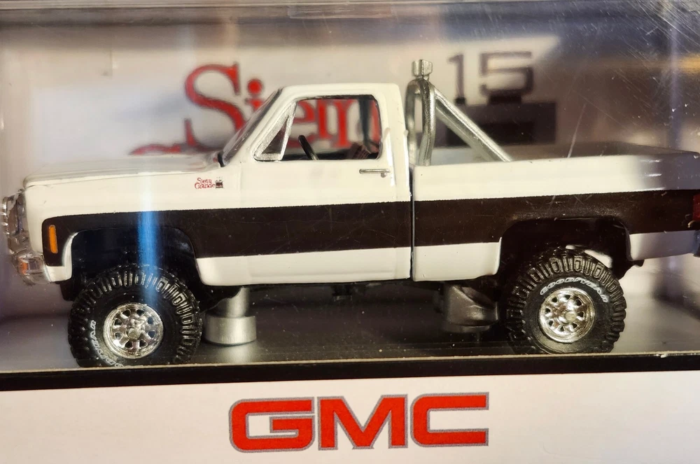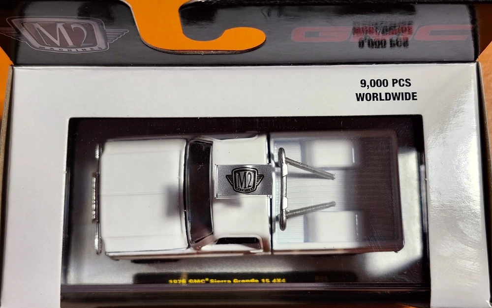 The product is an M2 Machines 1:64 scale diecast model of a 1976 GMC Sierra Grande 15 Square Body 4X4 pickup truck in white and black color. The model is sealed with opening hood! Fast shipping!