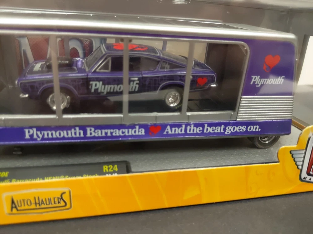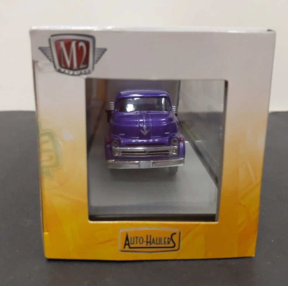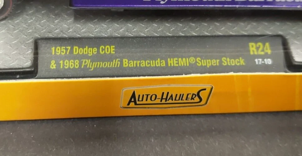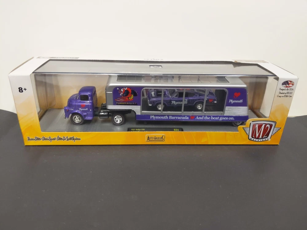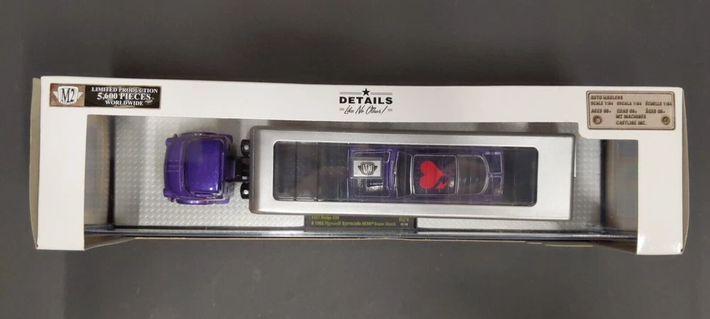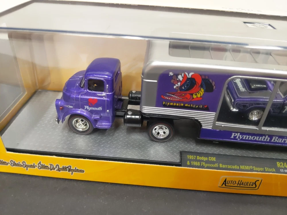 M2 Machines 1/64 Auto Haulers 1957 Dodge COE 1968 Plymouth Barracuda HEMI Super Stock Limited 5600 Pieces R24 17-10 Condition: Item is in fair condition. Photos are of the actual item. The box has a little wear and tear on side. The box design exposes the acrylic case, and therefore may have faint scuff/scratches from handling. This item has a faint scuff line on the top of the case.