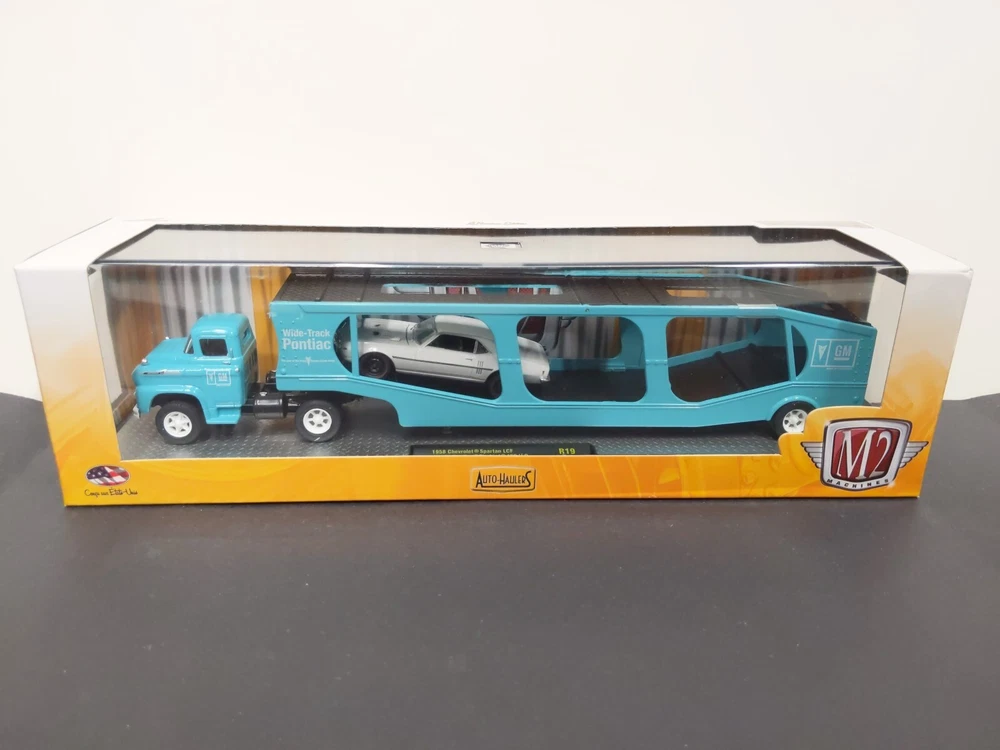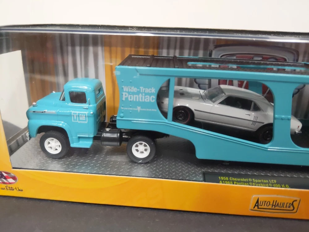 M2 Machines 1/64 'Auto Haulers' 1958 Chevrolet Spartan LCF 1968 Pontiac Firebird 400 H.O. Premium Edition R19 16-05 Condition: Item is in fair condition. Photos are of the actual item. The box design exposes the acrylic case, and therefore may have faint scuff/scratches from handling. This item has some faint scuff marks, but has visible light blue mark (paint?) on the inside of display front (see last photo).