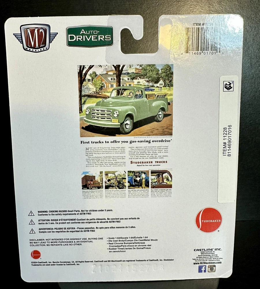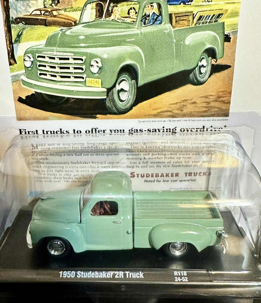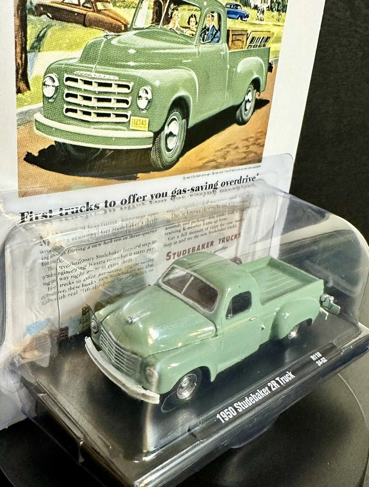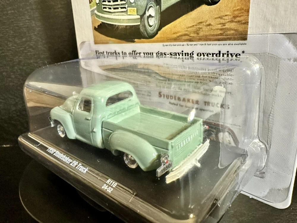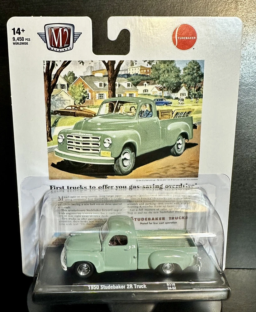 This M2 Machines diecast model is a 1950 Studebaker 2R truck in vintage style, part of the Auto Drivers series. The green truck is in 1:64 scale and comes with a case, making it a limited edition with only 9,450 pieces produced. It is recommended for all ages and features an unopened box, perfect for collectors or enthusiasts of 50s-themed vehicles. The Studebaker Trucks model is a detailed representation of the classic vehicle, a must-have for fans of vintage trucks.