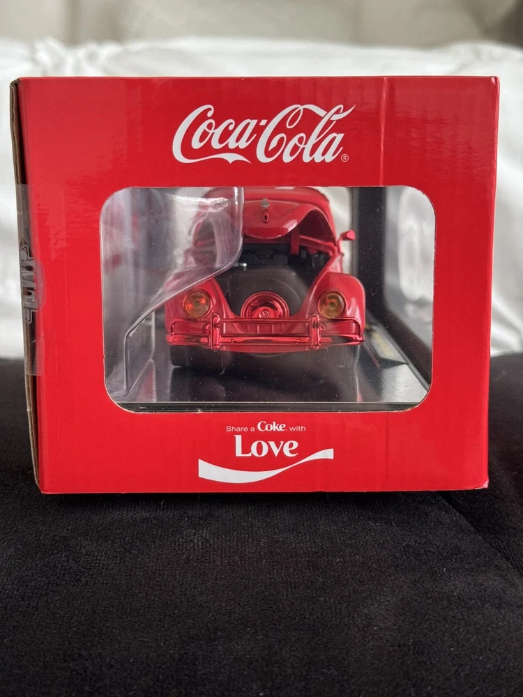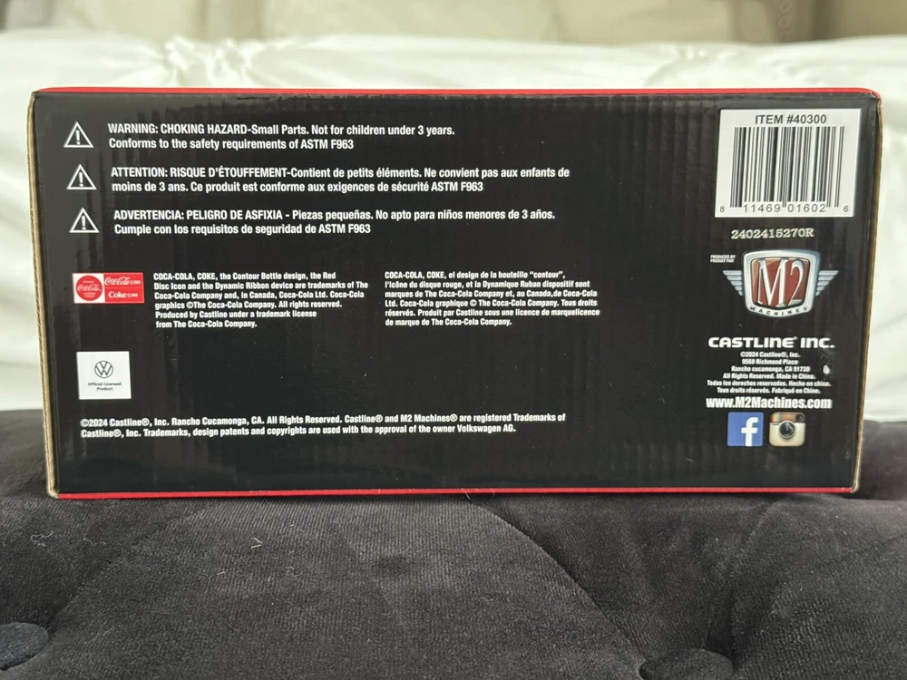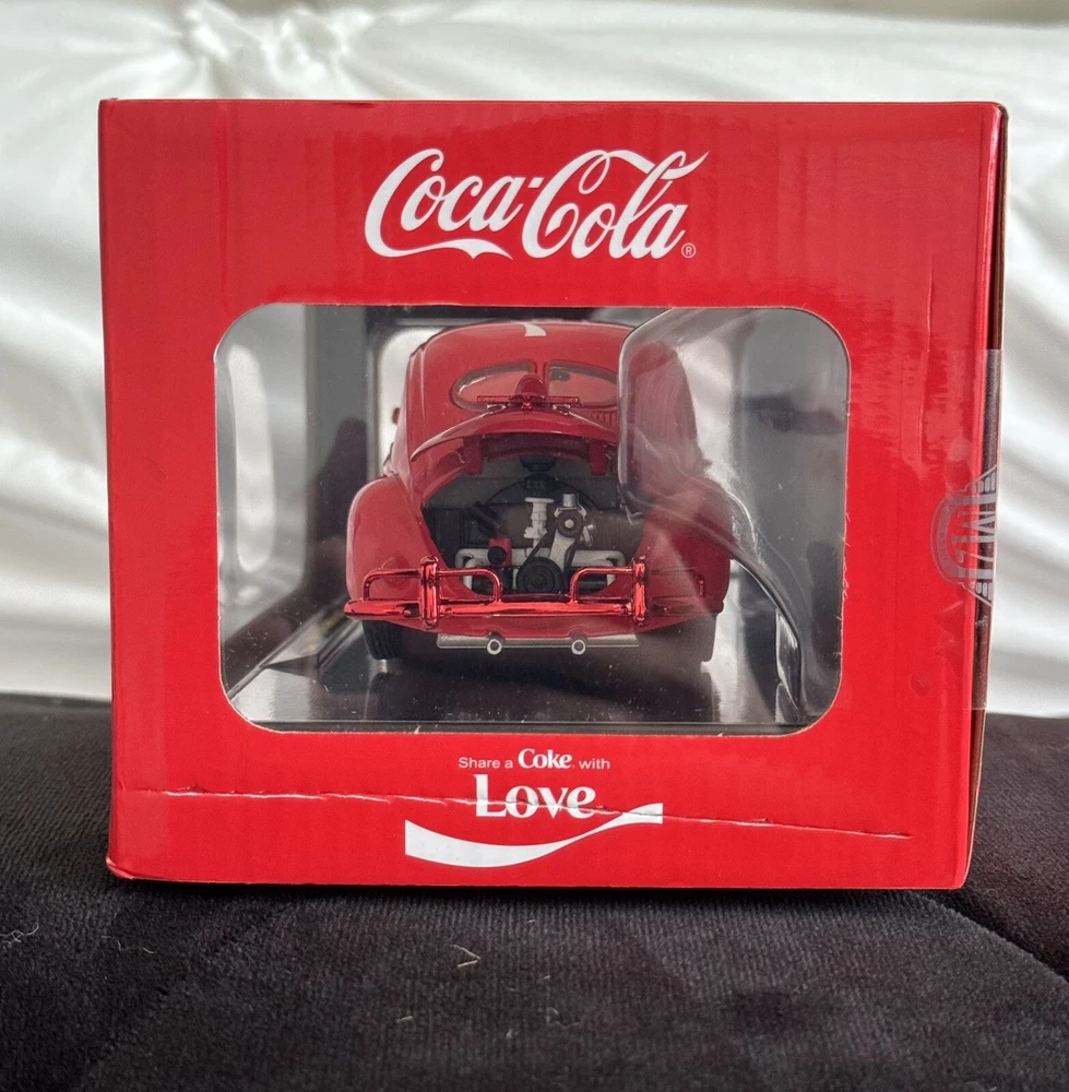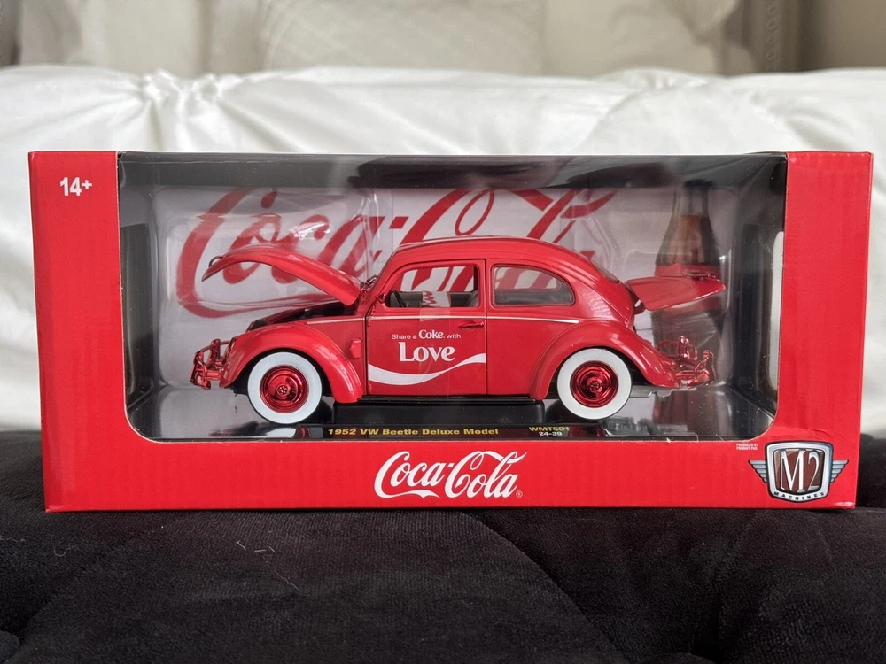 The M2 Machines 1/24 1952 VW Beetle Deluxe Model is a red diecast car featuring a Coca-Cola theme. This special edition model is part of the M2 Machines Holiday 2024 series and is a limited edition advertising specimen with a chase feature. It comes with a stand and is a 1:24 scale replica of the 1952 VW Beetle Deluxe Model, making it a collectible piece for both boys and girls who are Coca-Cola enthusiasts. Please see pictures for condition. Has damage on lower part of box right side, see picture of engine side. See pictures for reference. Everything ships in box and with bubble wrap to ensure safe delivery.