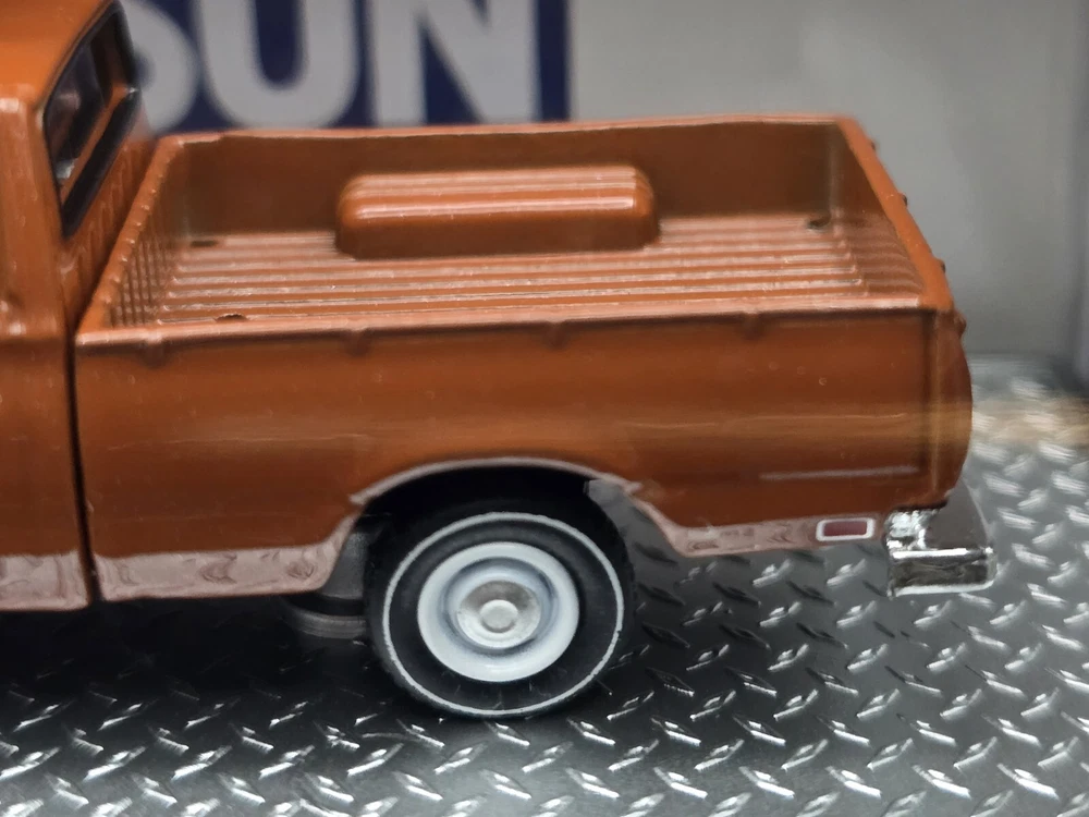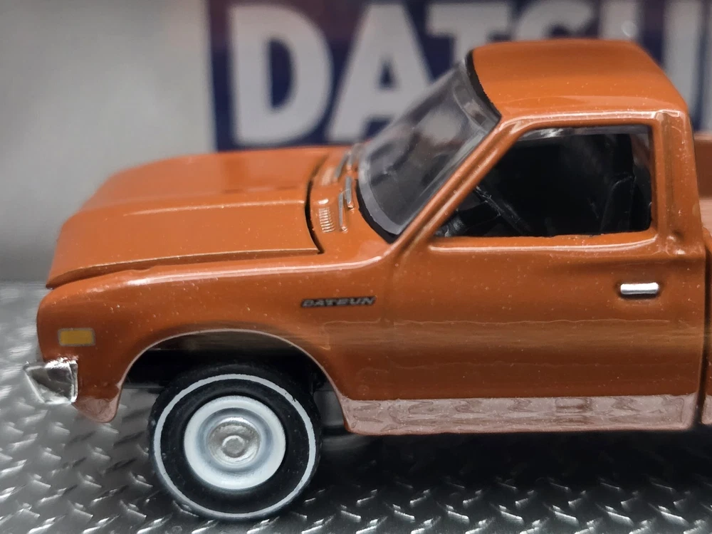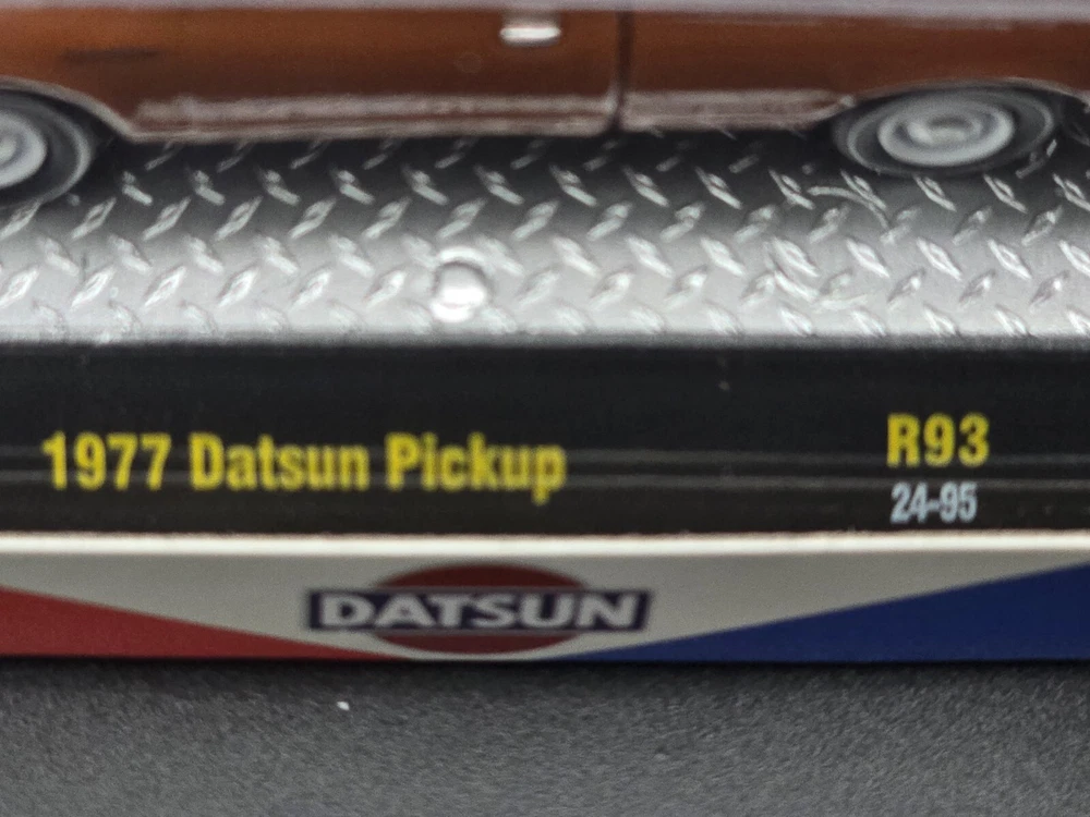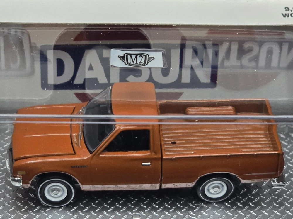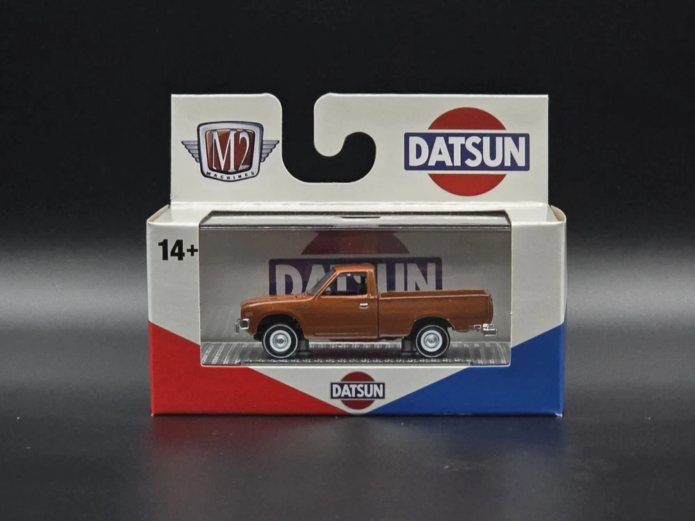 This is a 1:64 scale M2 Machines diecast model of a 1977 Datsun Pickup truck in brown. Part of the R93 series, it comes with a case, stand, and is unopened. It is a limited edition release for 2024, featuring the Datsun theme and belonging to the Datsun character family.