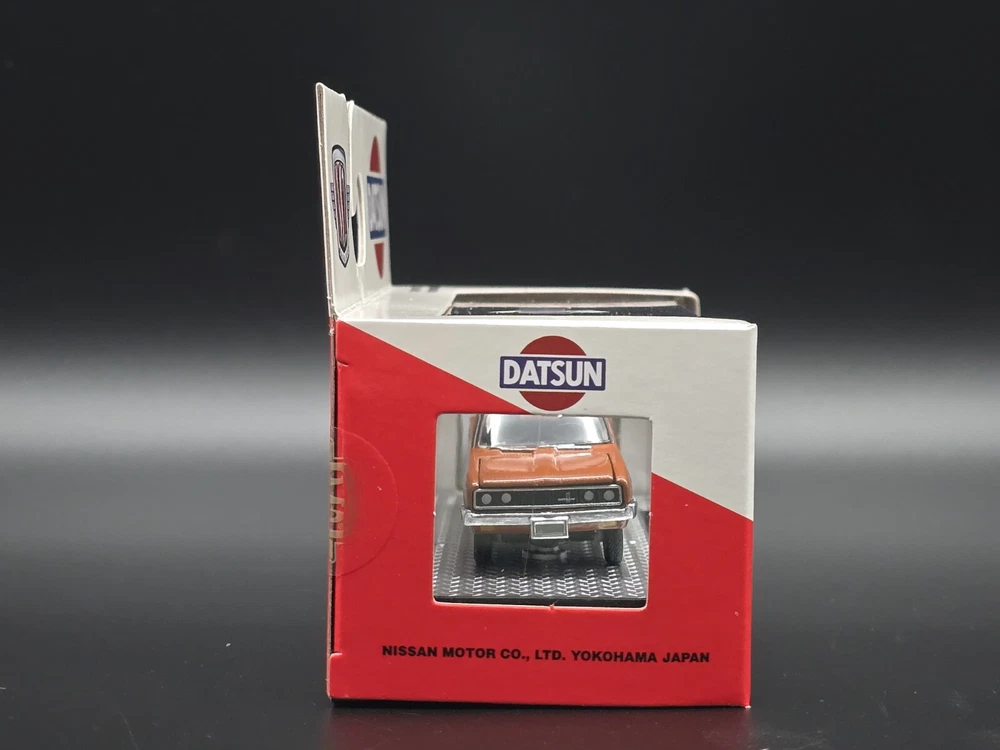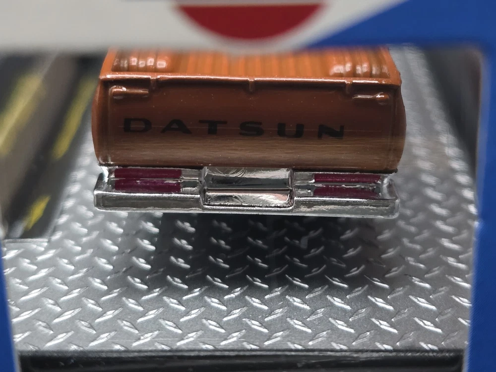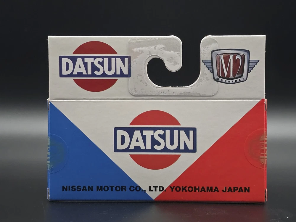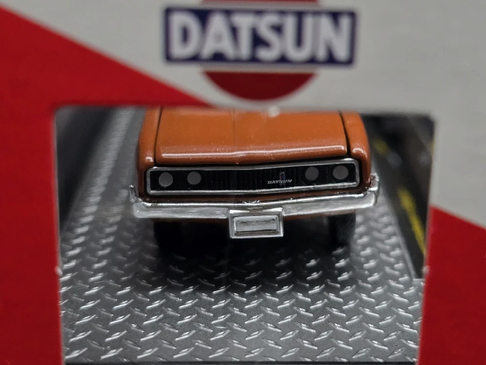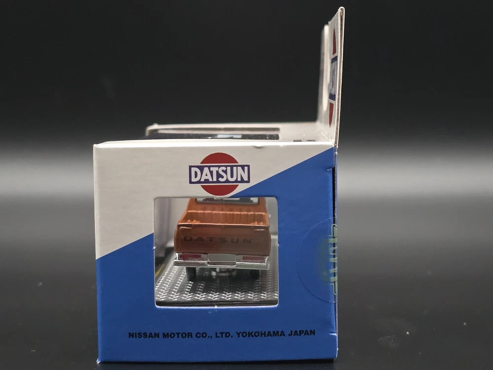 This is a 1:64 scale M2 Machines diecast model of a 1977 Datsun Pickup truck in brown. Part of the R93 series, it comes with a case, stand, and is unopened. It is a limited edition release for 2024, featuring the Datsun theme and belonging to the Datsun character family.