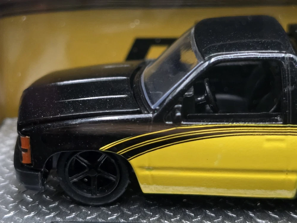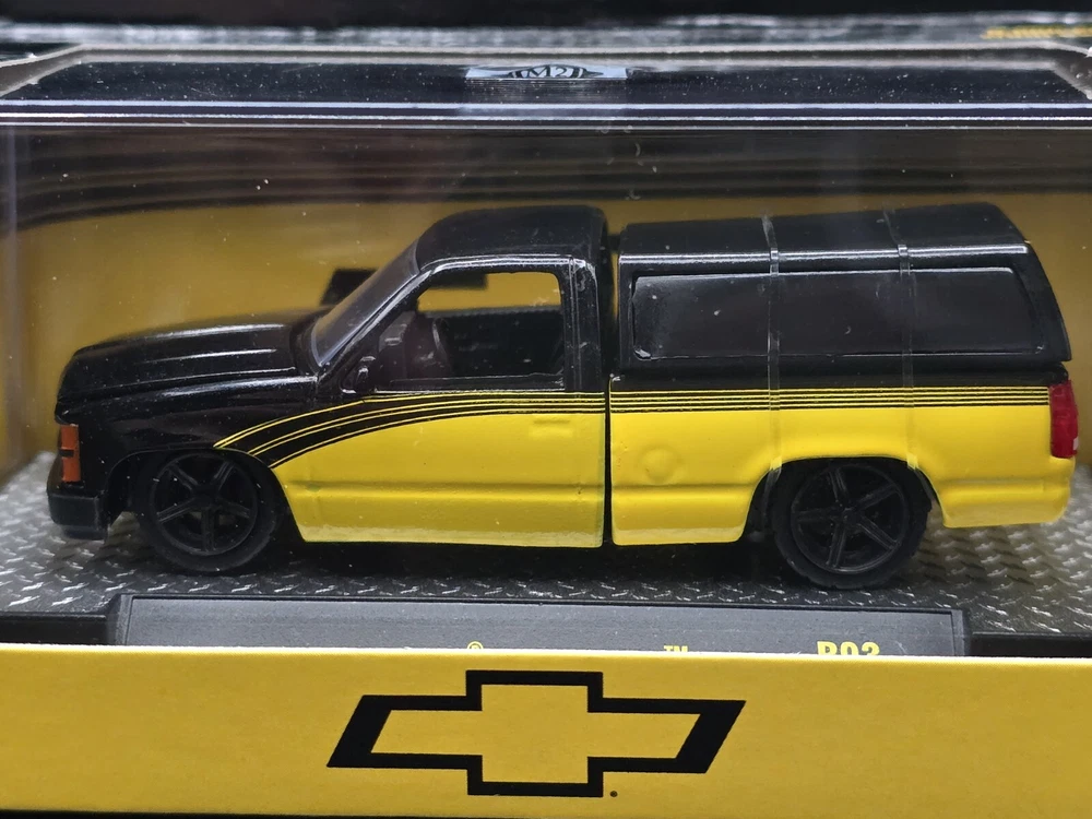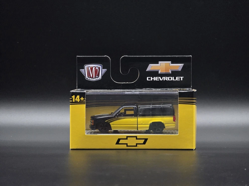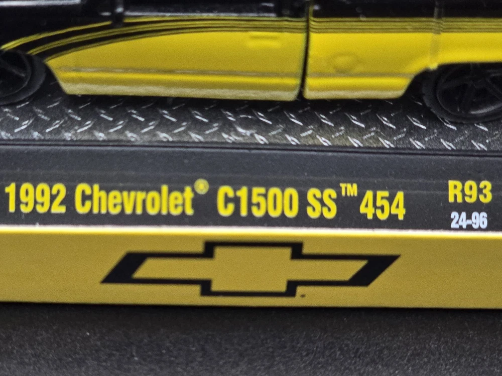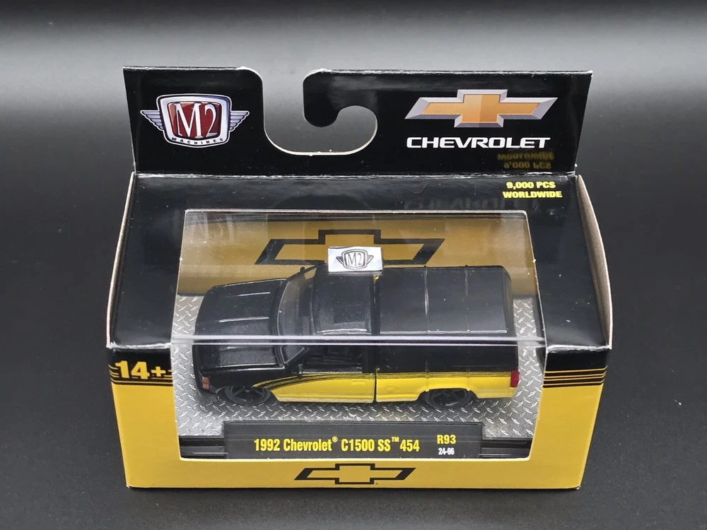 This is a 1:64 scale diecast model of a 1992 Chevrolet C1500 SS 454 truck by M2 Machines. Part of the Auto-Trucks R93 series, it features multi-color paint and comes with a case, stand, and unopened box. This limited edition collectible has a Chevrolet theme and is not autographed.