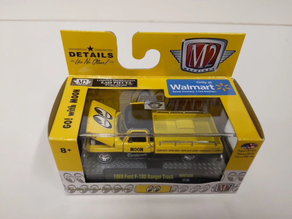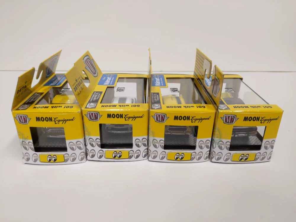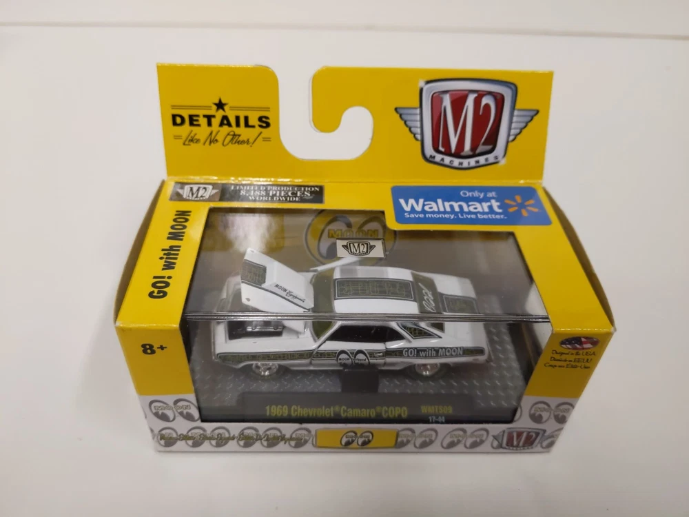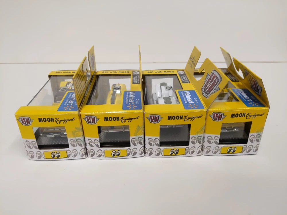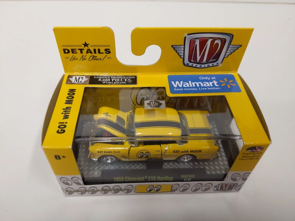 M2 Machines 1/64 Go! With MOON - Walmart exclusives Lot of 4 includes the following models: 1969 Chevrolet Camaro COPO WMTS09 17-44 1958 Chevrolet Apache Fleetside WMTS09 17-49 1955 Chevrolet 210 Hardtop WMTS09 17-47 1969 Ford F-100 Ranger Truck WMTS09 17-45 Each has limited production of 8,188 pieces worldwide. These are in good unopened condition. Photos are of the actual items, please see photos to assess condition.