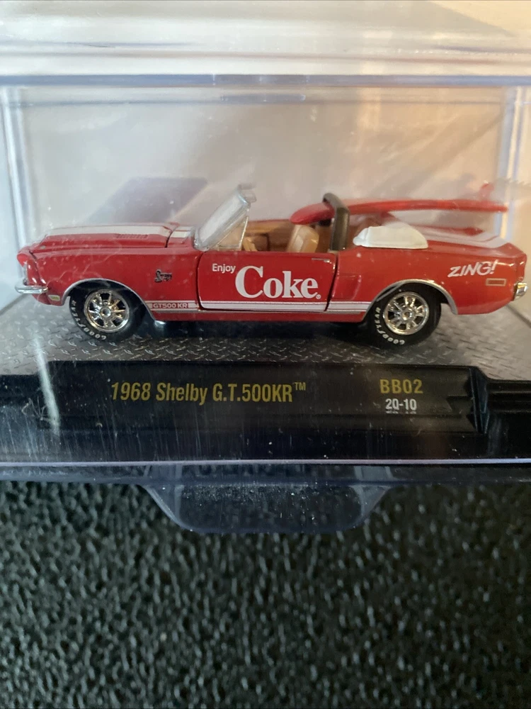 The M2 Machines 1/64 Scale 1968 Shelby GT500KR in Coke red is a limited edition diecast model released in 2020 as part of the Coca-Cola series. This Ford Mustang Shelby GT350 features a vibrant red color scheme and comes unopened in its original box, making it a sought-after collectible for diecast car enthusiasts. The detailed 1:64 scale replica of the iconic 1968 vehicle showcases the classic design of the Shelby GT350 with branding from the popular Coca-Cola theme.