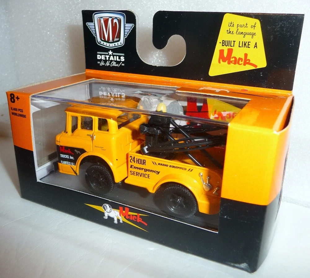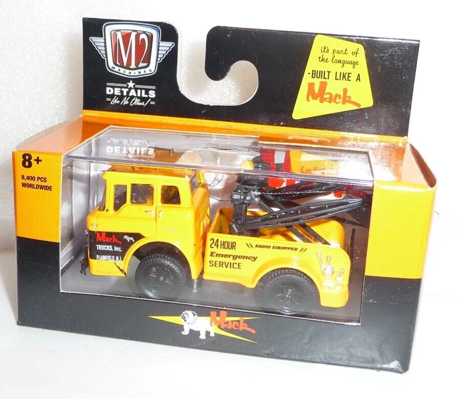M2 Machines 1957 Mack Model Tow Truck 1:64 Diecast. Car is new in package. Box has light edge and corner wear. Includes an acrylic display case.
