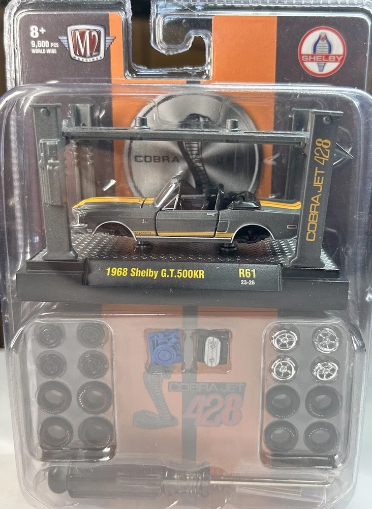 This limited edition M2 Machines model kit features a iconic 1968 Shelby GT 500KR Mustang in a striking gray color. With only 9,600 pieces worldwide, this diecast model is a rare find for any car enthusiast. The kit includes rubber tires, chrome bumpers, and comes with a stand for display. The 1:64 scale model is recommended for ages 8 and up, and is perfect for both boys and girls. This convertable car is part of the Ford Performance series and is a great addition to any collection. The model kit is unopened and comes in its original box. Don't miss your chance to own this rare and highly sought after M2 Machines model.