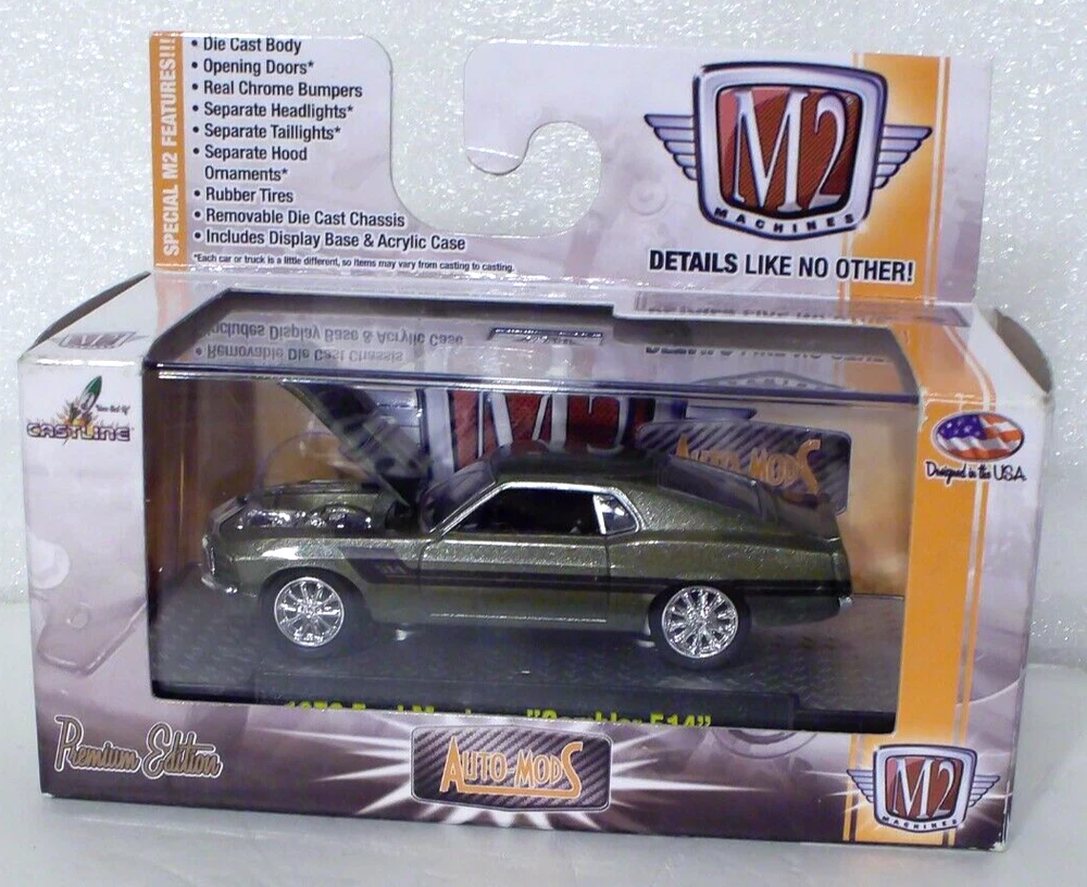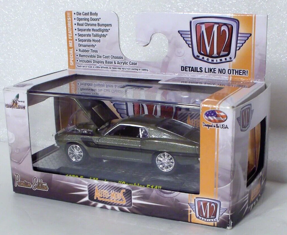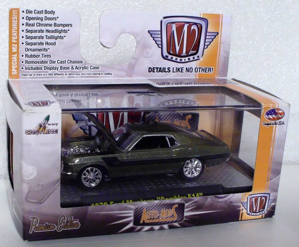 M2 Machines 1970 Ford Mustang Gambler 514 1:64 Diecast. Car is new in factory package. Seal on box has been opened on the right side. Box has light edge and corner wear. Includes an acrylic display case.