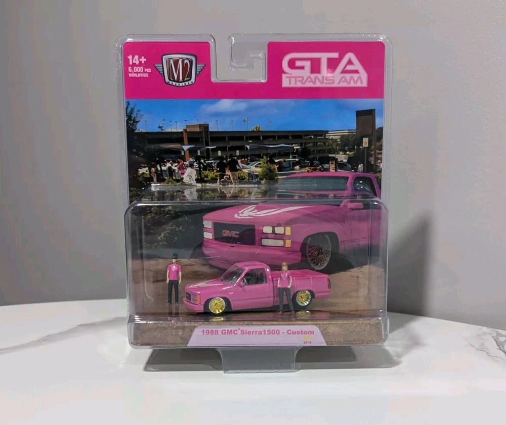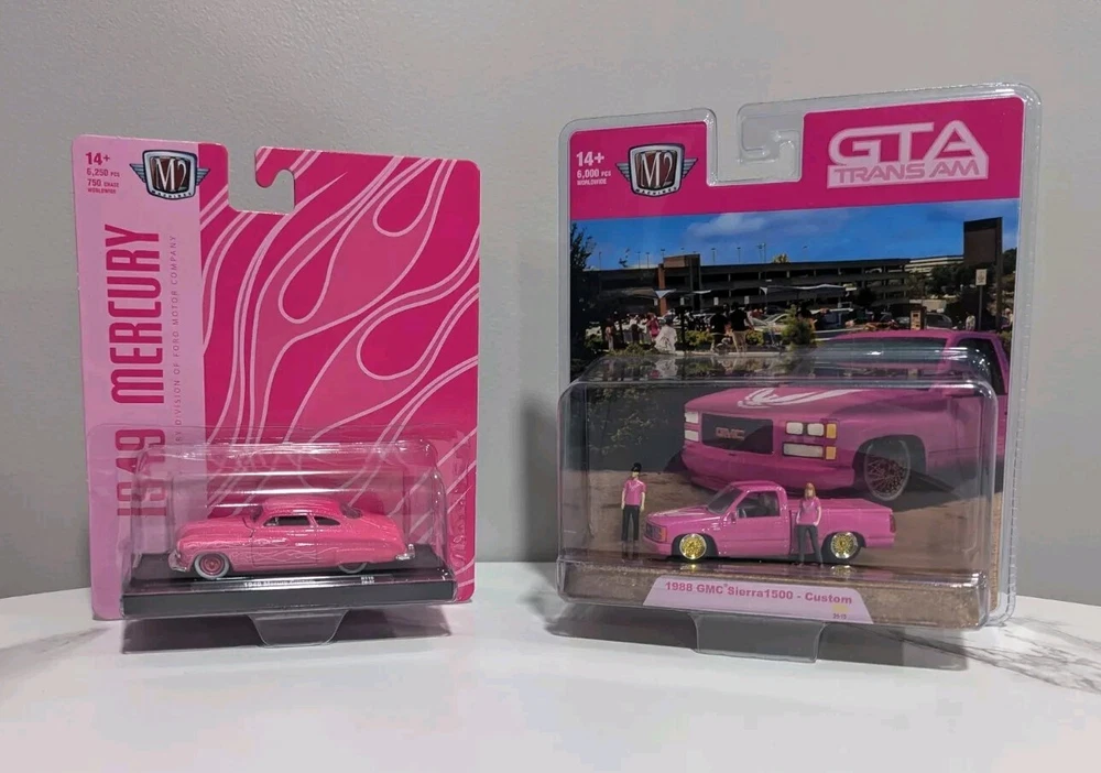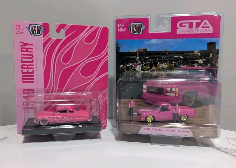 M2 Machines 1988 GMC Sierra 1500 Custom GTA Trans AM + 1949 Mercury Custom PINK Lot You will receive both M2 Machines pink diecast cars shown in the photos above. They are NEW and unopened. Packaging is in very nice condition but may have very minor imperfections/scratches. The Mercury Custom has a spelling error at the base of the car. Please see the provided photos for more condition details. Ships with care. Will be well protected in a sturdy box. These M2 Machines cars in pink are limited edition, unopened box collectibles. The vehicles are made of high quality diecast material and have a 1:64 scale. A truly unique addition to any collection. Thanks for looking!