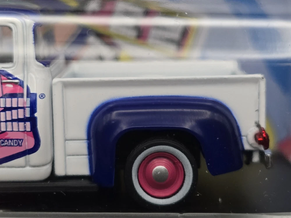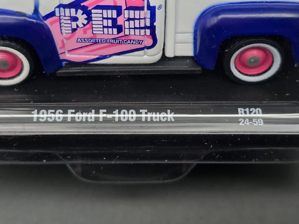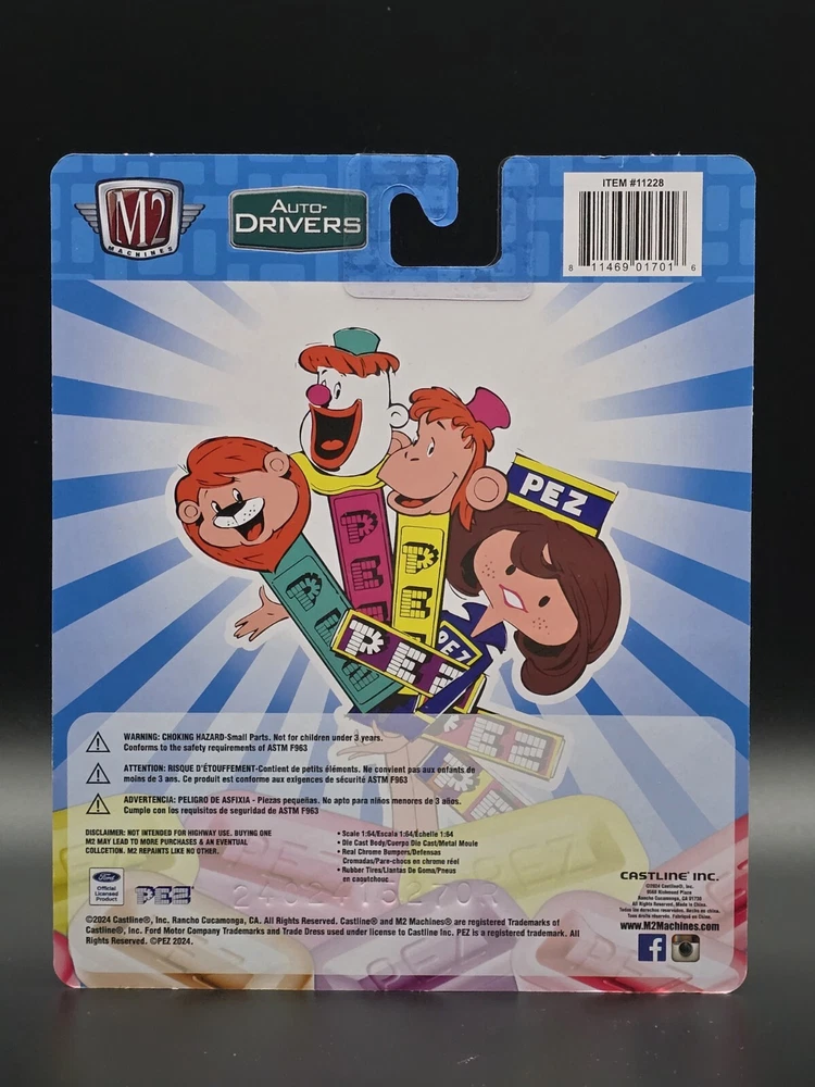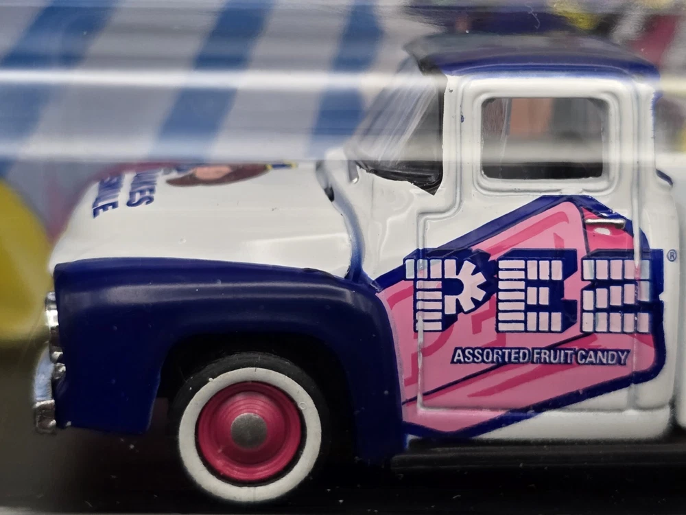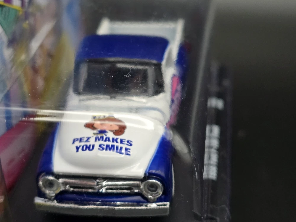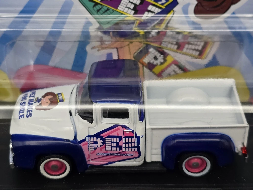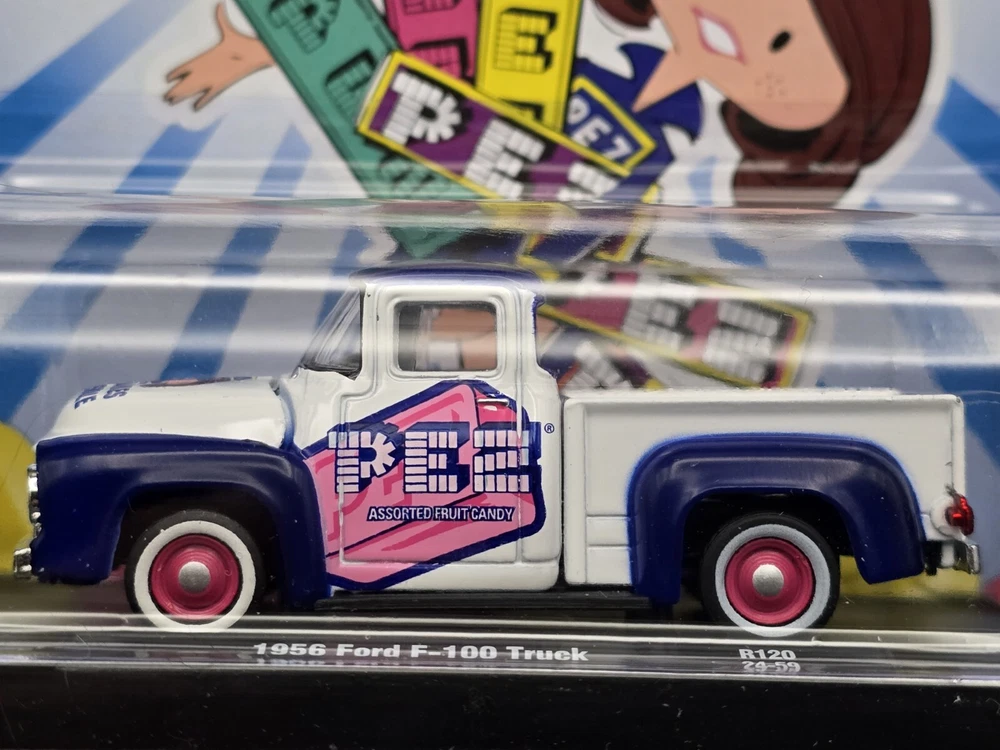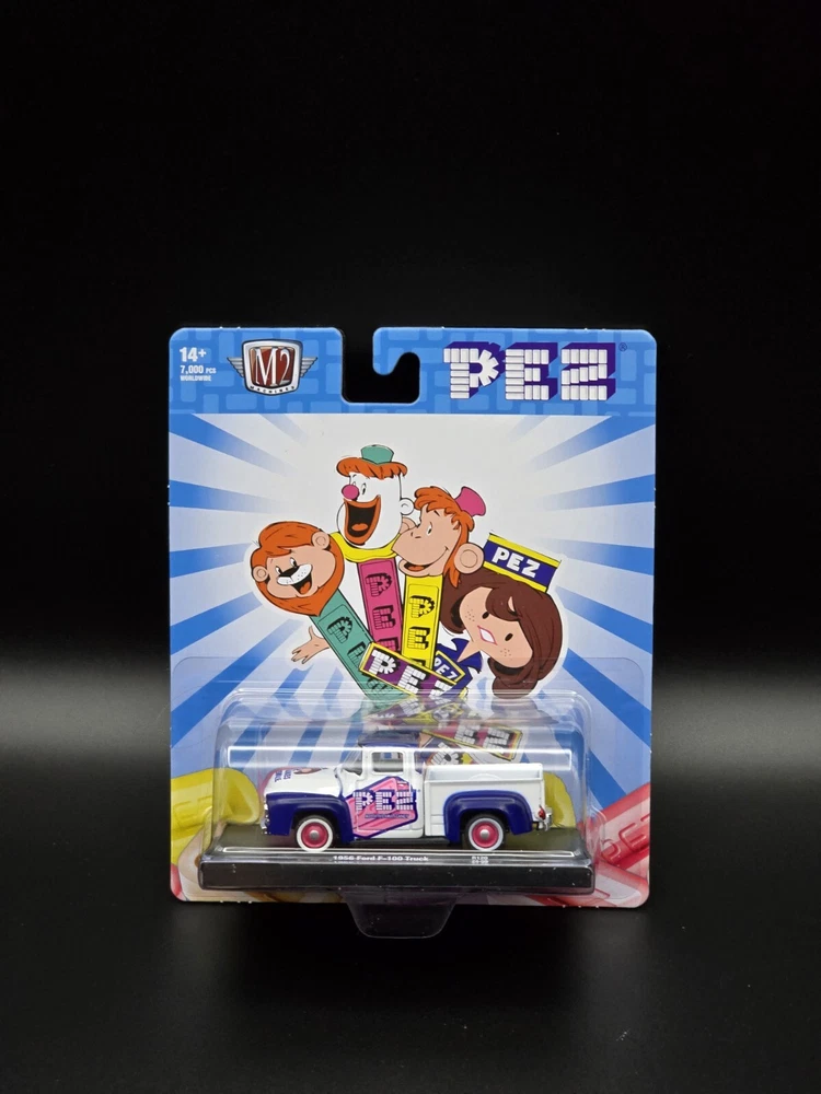 This is a M2 Machines diecast model of a 1957 Ford F-100 truck in 1:64 scale from the Hot Wheels Marvel series. The truck features a Pez Candy theme and comes in a multi-color design. It is part of the Auto Drivers collection and is unopened in its original box. This collectible item is recommended for ages 14 and up.