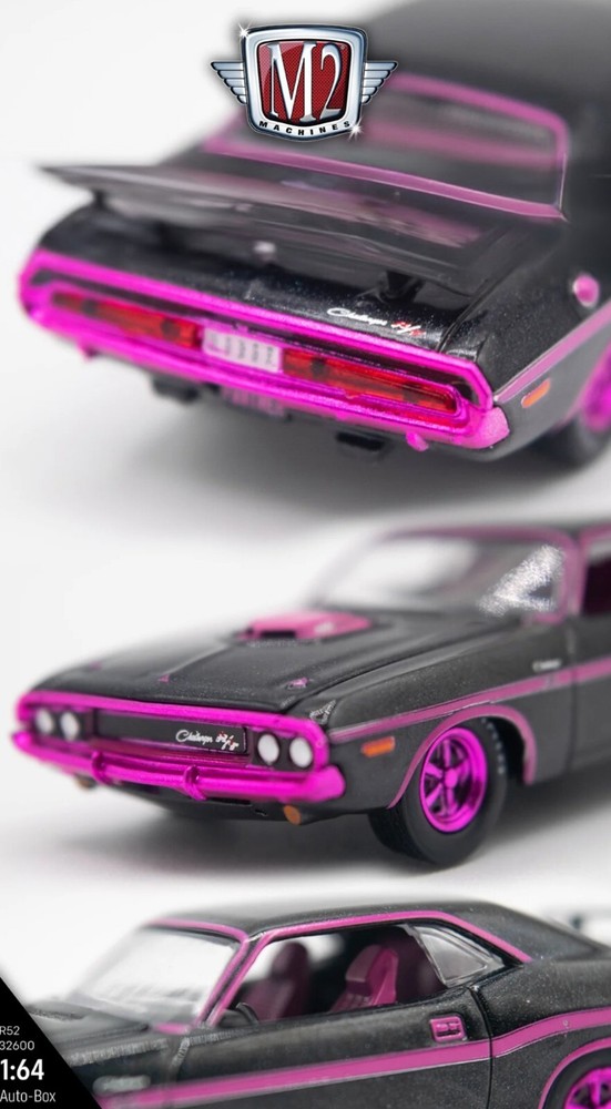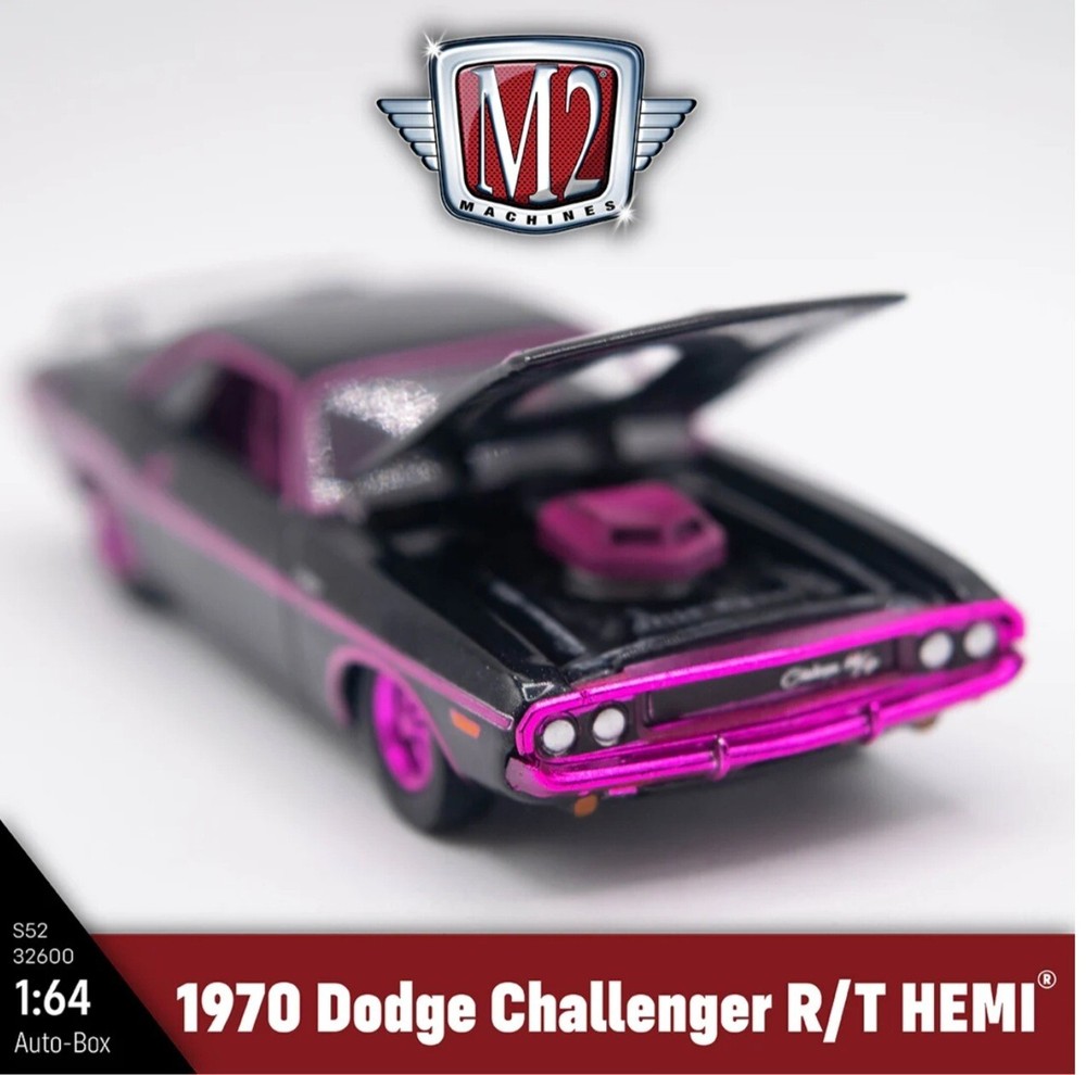 This M2 Machines Auto Club box #19 features a stunning pink chrome 1970 Dodge Challenger R/T HEMI car. This 1:64 scale diecast model is perfect for both boys and girls who love collecting special and limited edition cars. The model comes with a case and stand, and is unopened in its original box. With its chase feature and being part of the Auto Club series, this Dodge Challenger R/T HEMI model is a must-have for any car enthusiast or collector. Made in China, this model is in hand and ready to be added to your collection.