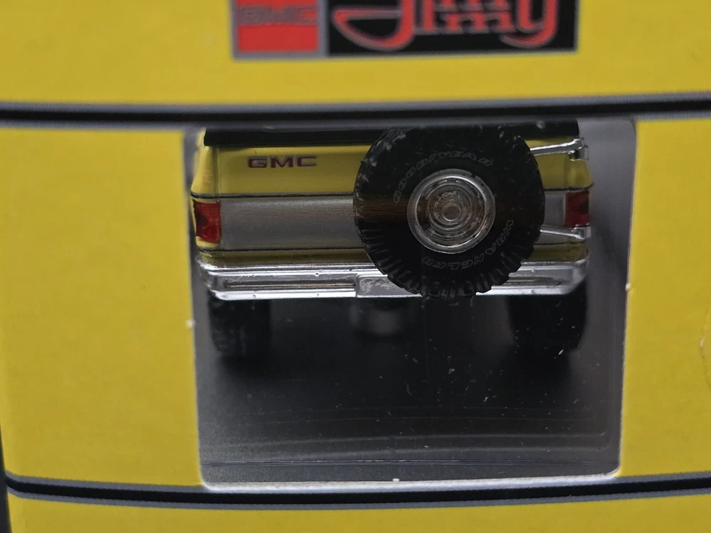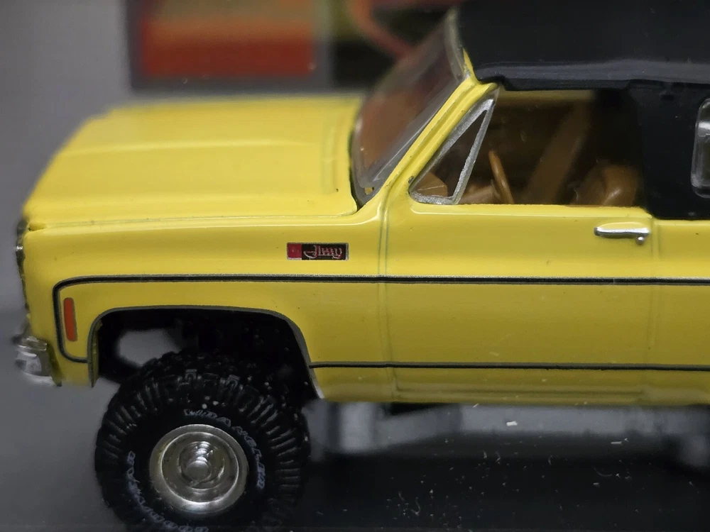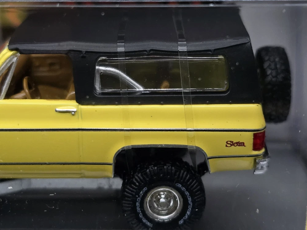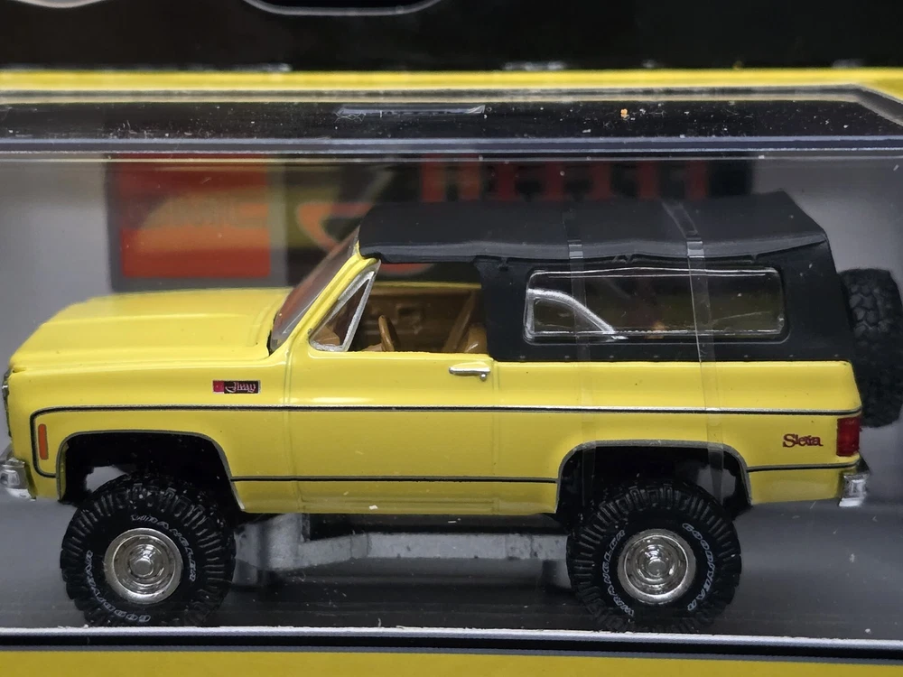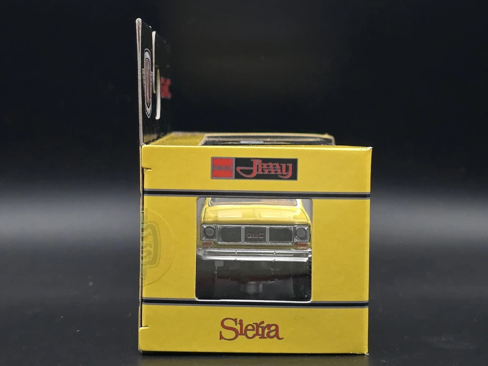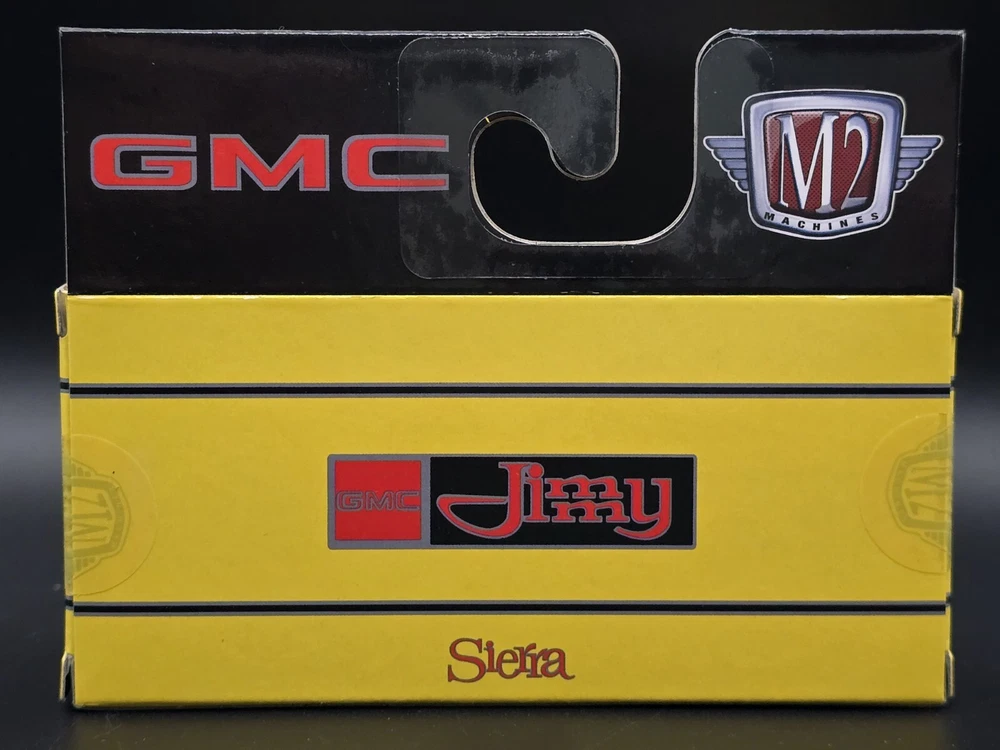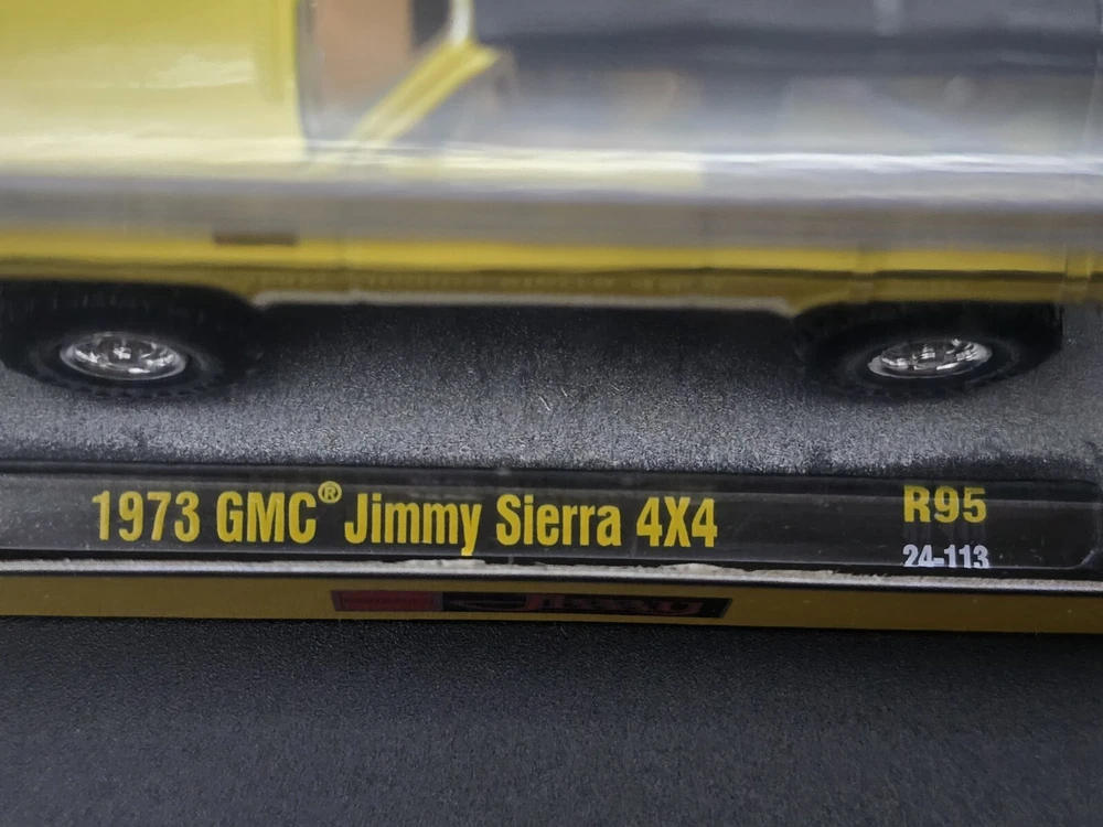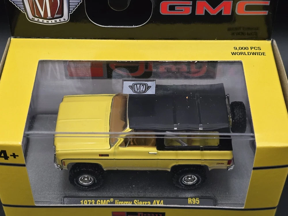The M2 Machines Auto-Thentics Yellow 1973 GMC Jimmy Sierra 4X4 Pickup R95 24-113 is a 1:64 scale diecast truck model manufactured by M2 Machines in 2024. It is part of the R95 series and features a special edition design with a stand and case. The model represents a 1973 GMC Jimmy Sierra 4x4 in yellow color, themed around GMC vehicles.