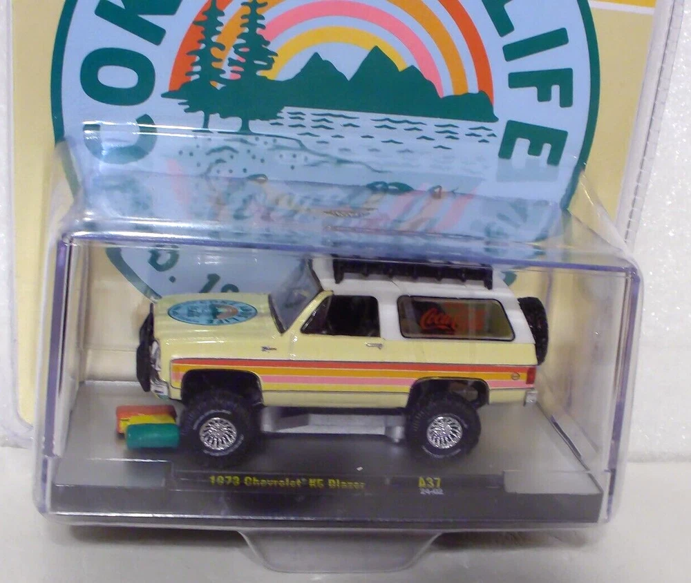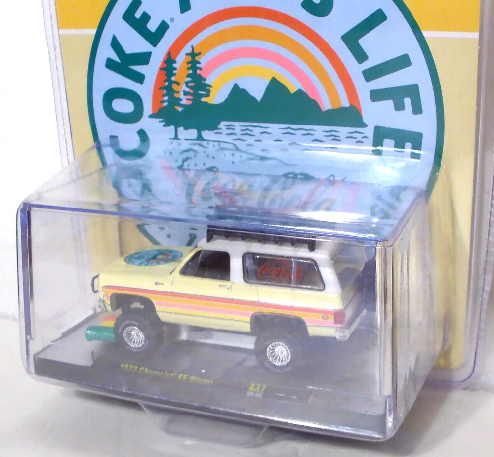 M2 Machines Coca Cola 1973 Chevrolet K5 Blazer 1:64 Diecast. Car is new in a sealed package. Package is a plastic clamshell. Clamshell has a small crack in the lower left front corner, Luggage off of the roof rack is loose in the package and can be easily glued back onto the roof rack. Includes an acrylic display case.