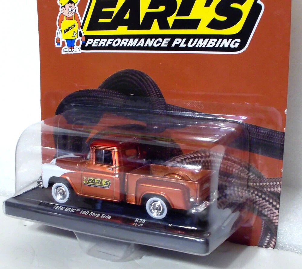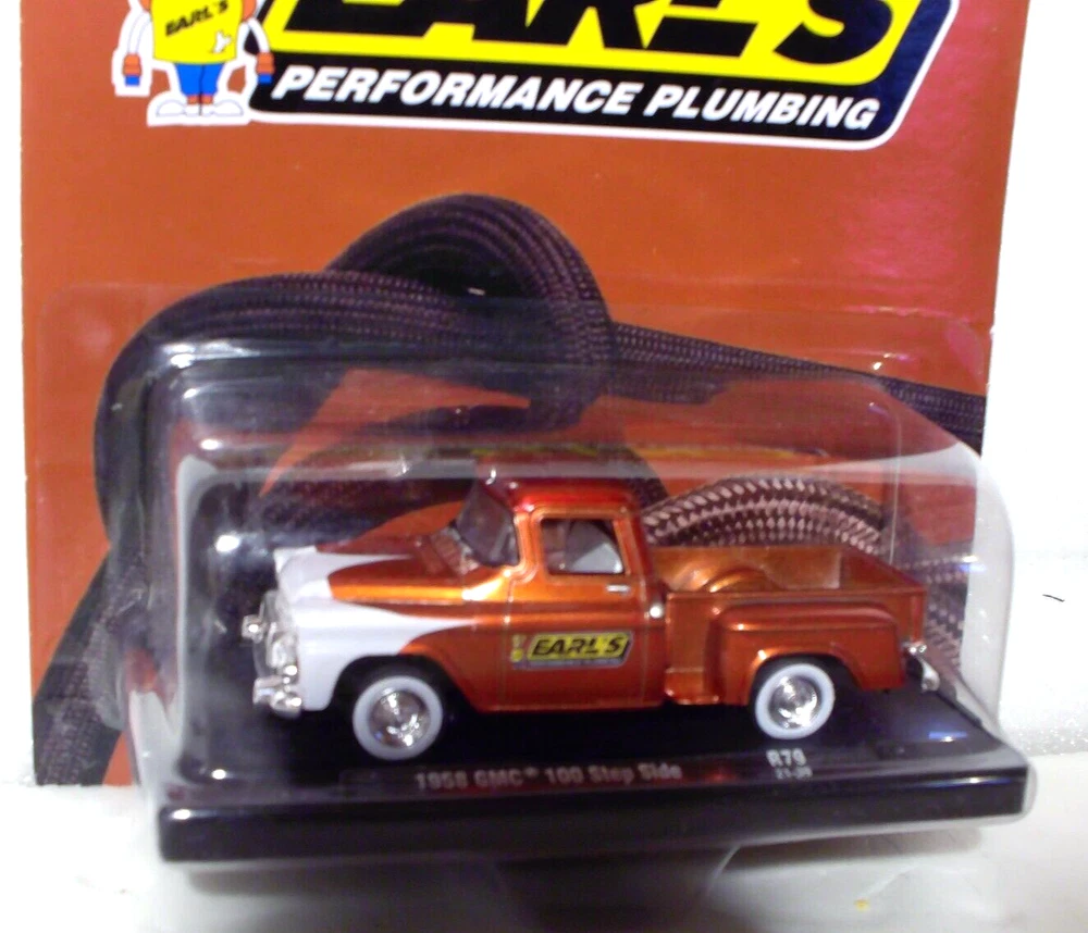 M2 Machines Earl's 1956 GMC 100 Stepside 1:64 Diecast. Car is new in a sealed package. Card has light edge and corner wear. Includes an open display stand. Car appears orange in the photos but to the naked eye it is actually a deep red metallic hue,