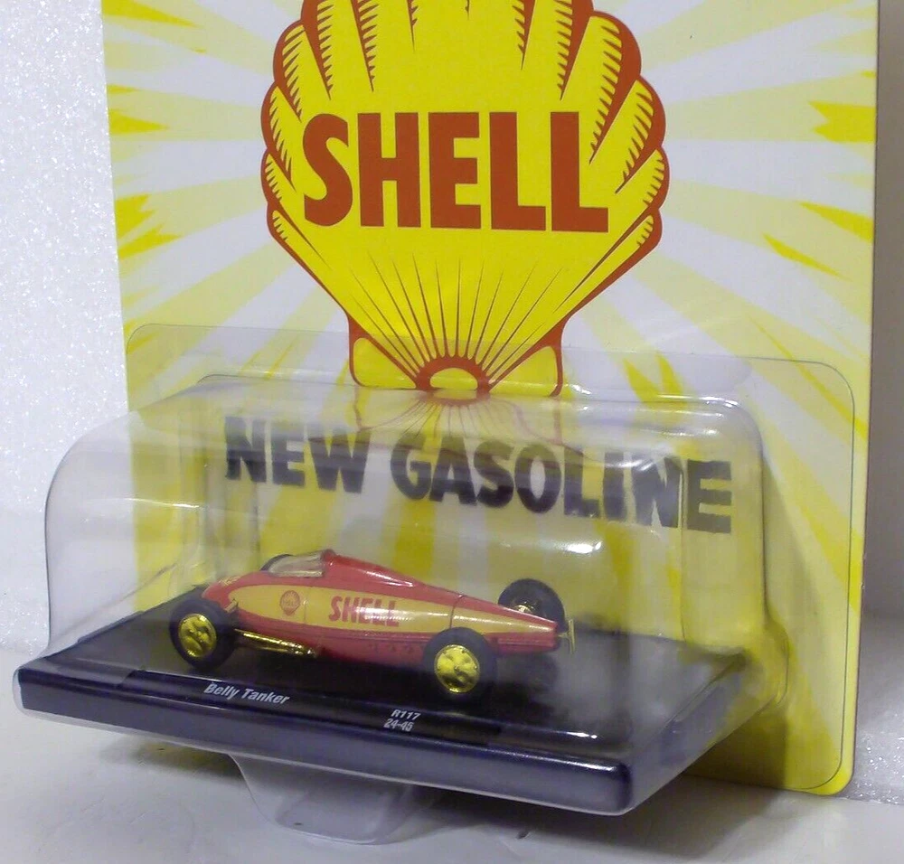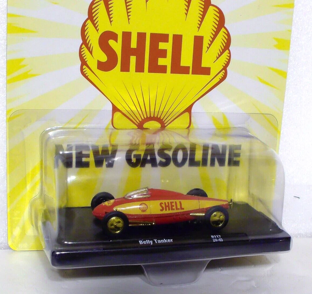 M2 Machines Gold Chase Shell Belly Tanker 1:64 Diecast 1/750 Limited Edition. Car is new in a sealed package. Card is in new condition. Includes an open display stand.