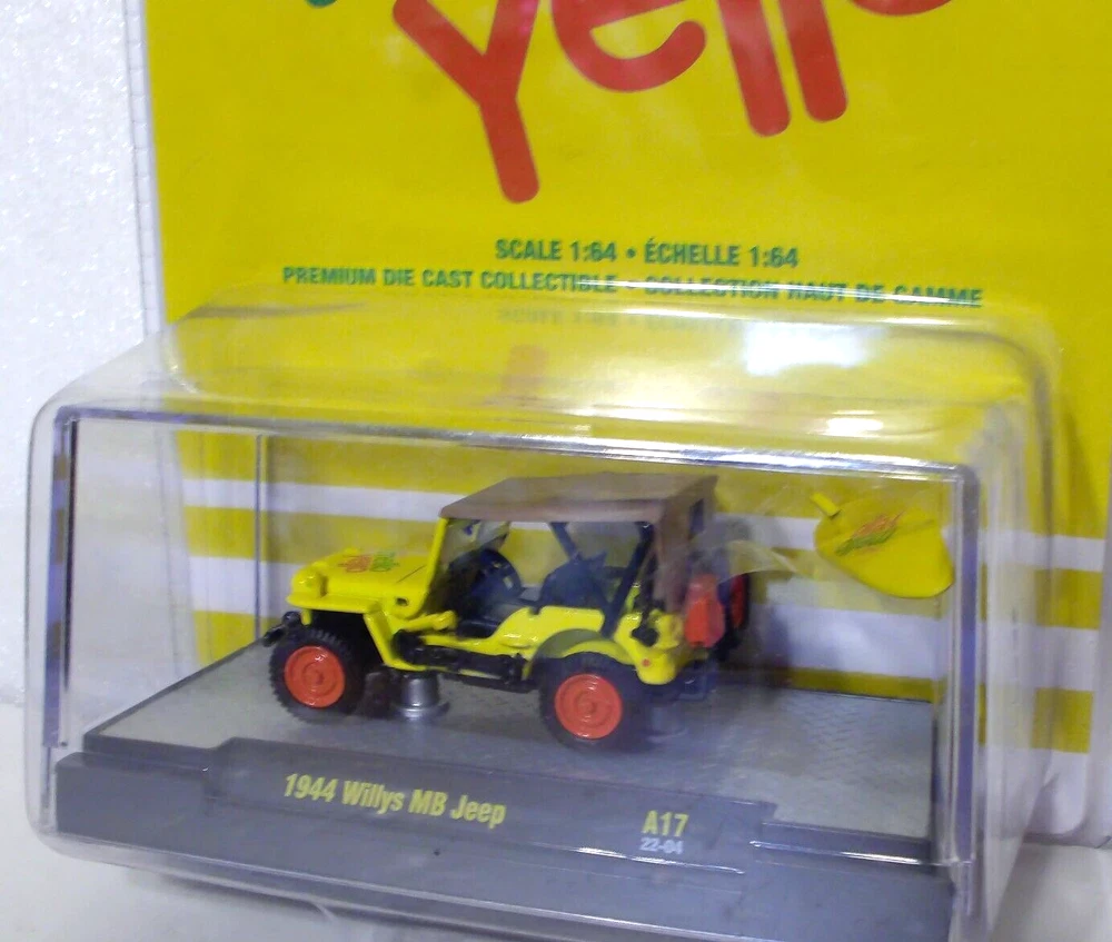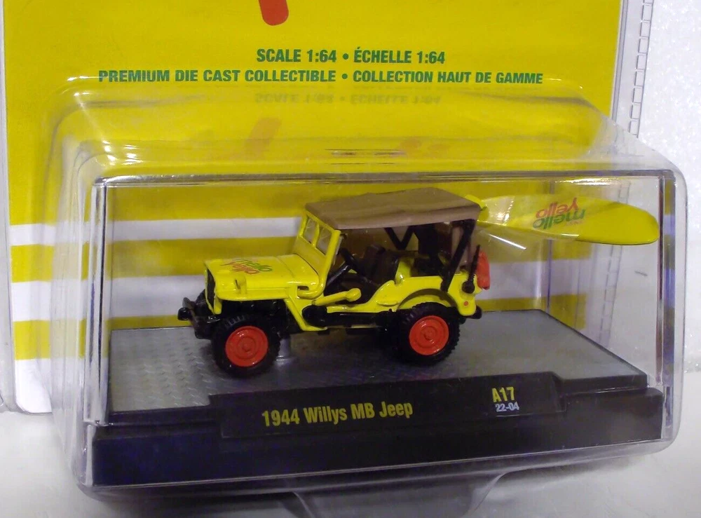 M2 Machines Mello Yello 1944 Willys MB Jeep 1:64 Diecast. Car is new in a sealed package. Package is a plastic clamshell. Car comes with a surfboard which has detached inside the package, it can be easily attached back onto the roof if desired. Includes an acrylic display case.