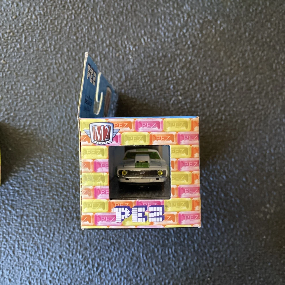 The M2 Machines Pez 1969 Chevrolet Camaro is a 1:64 scale diecast model in white and green colors. This limited edition Walmart Exclusive release from 2019 features a Chevrolet Camaro COPO design, complete with a protective case and unopened box. The model is part of the Pez character family collection, showcasing detailed craftsmanship and design specific to this toy line. Possible minor wear from storage on box. Packaging may not be perfect please look at the pictures for condition.