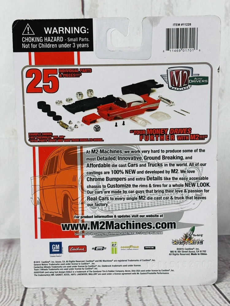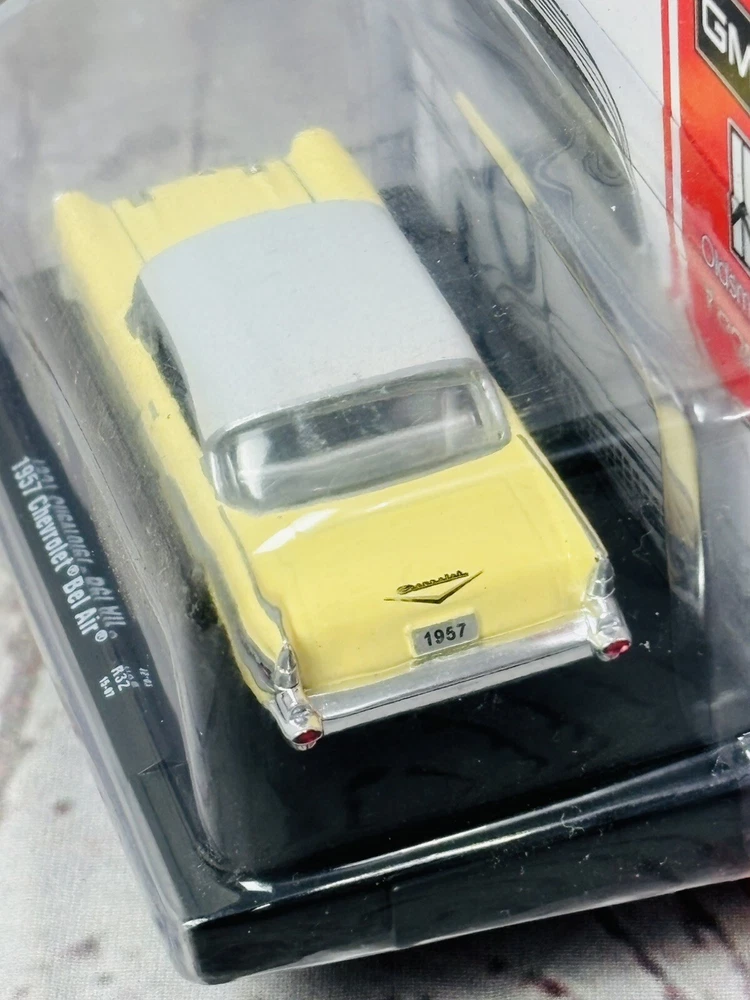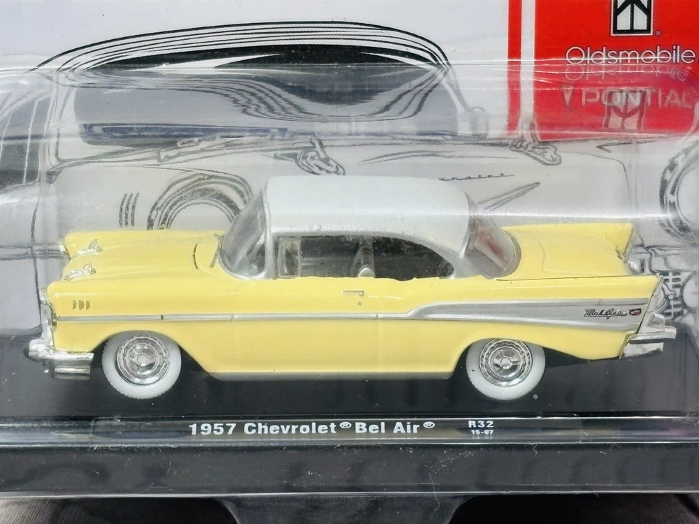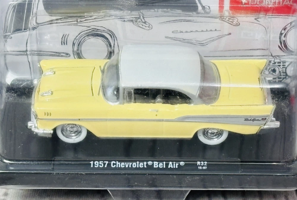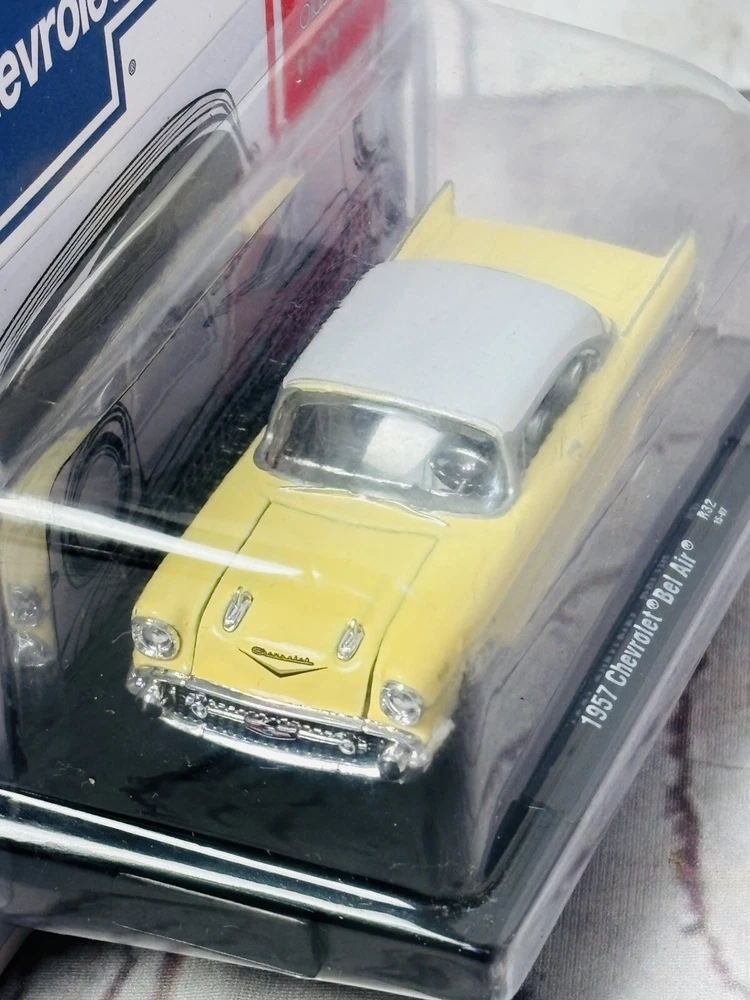 M2 Machines 1957 Chevrolet Bel Air diecast model, 1:64 scale. Features include a die-cast body, real chrome bumpers, rubber tires, and a removable plastic chassis. Includes a display base. Packaging has minor edge wear (see photos). Perfect for collectors or as a gift for classic car enthusiasts.