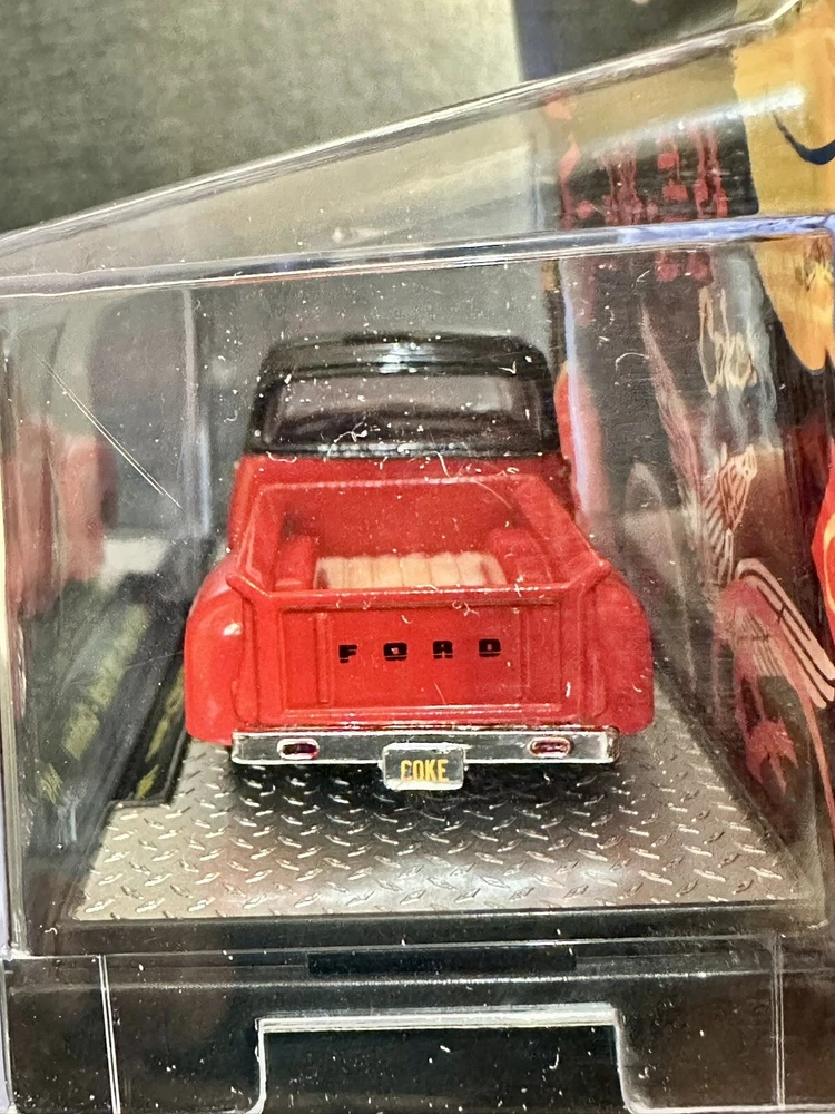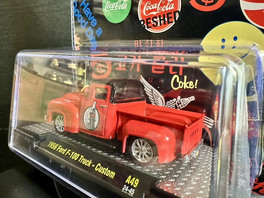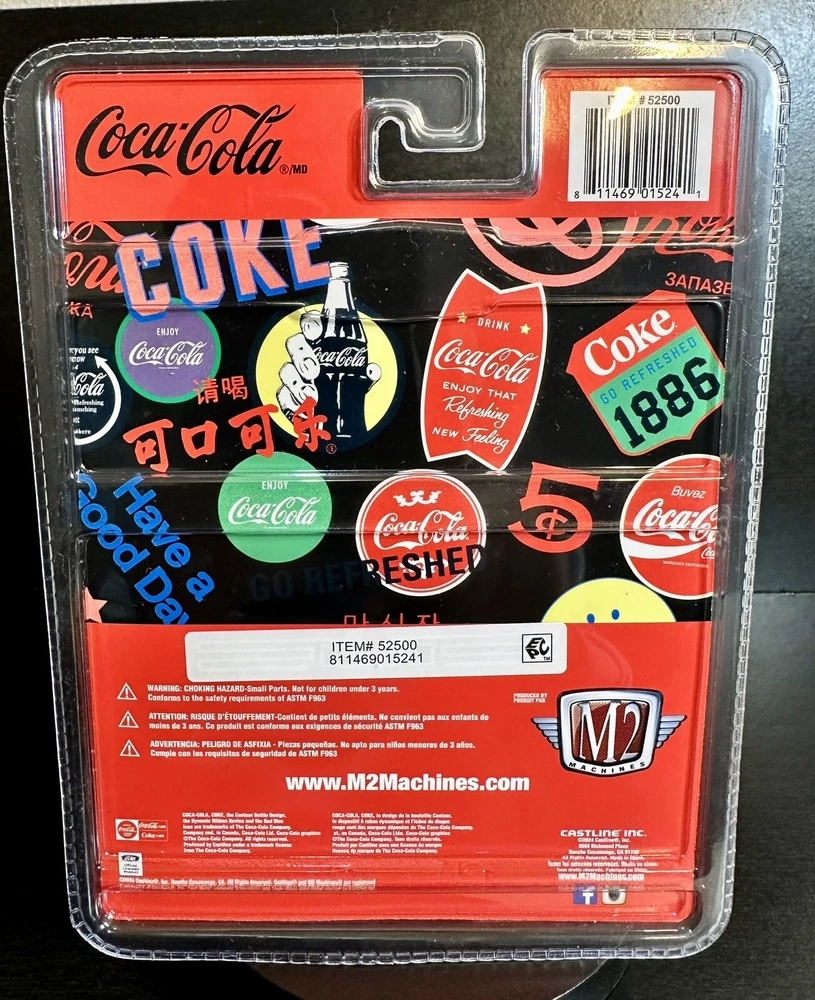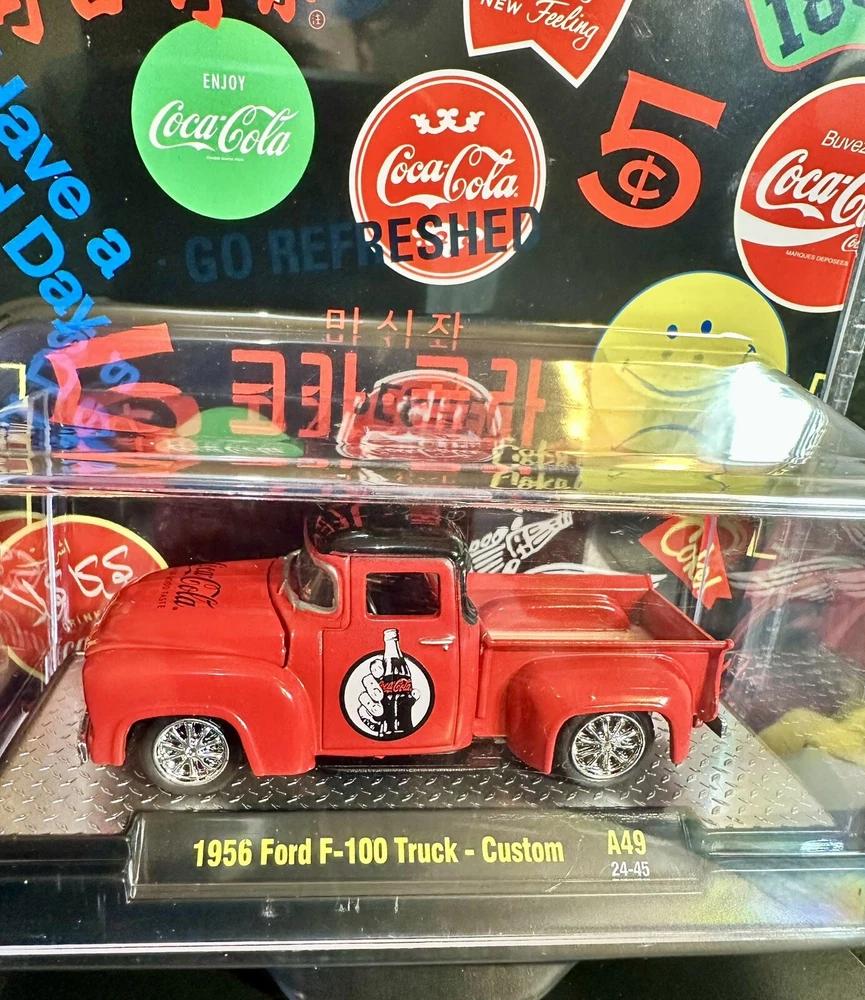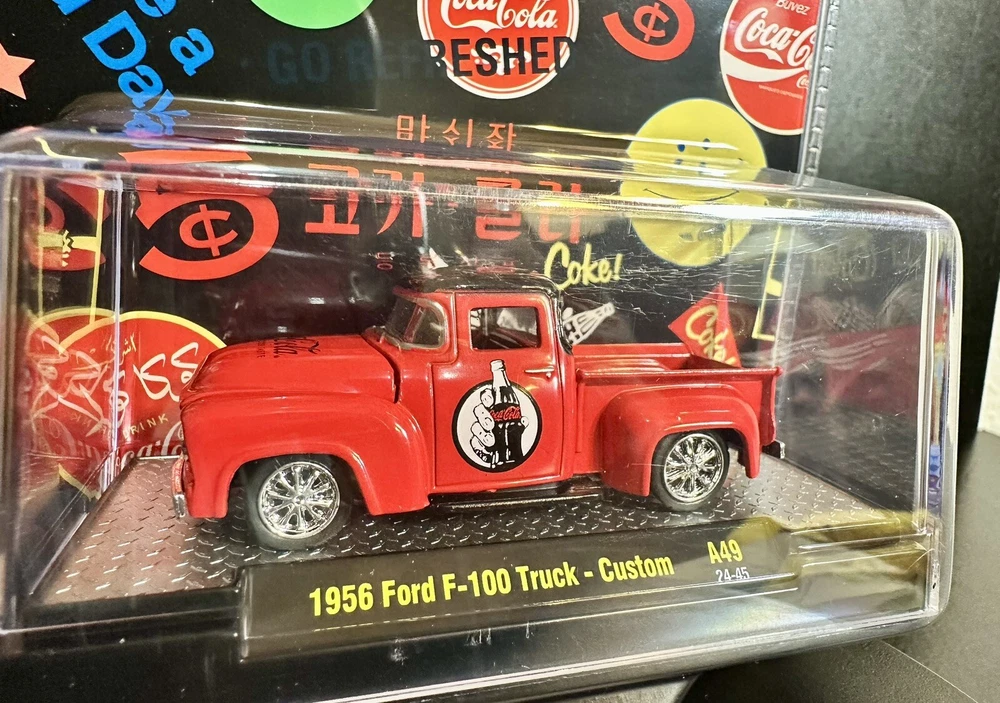 The M2 Machines Coca-Cola Branded 1956 Ford F-100 Truck Custom toy is a 1:64 scale diecast model in red color. This special edition truck comes with a case and is part of a limited edition series. The vintage looking Ford F-100 features Coca-Cola branding, making it a unique and collectible piece for both boys and girls. Perfect for fans of Coca-Cola memorabilia and vintage trucks, this unopened box toy is a must-have for any diecast vehicle collector. Limited to 9,250 pcs worldwide .
