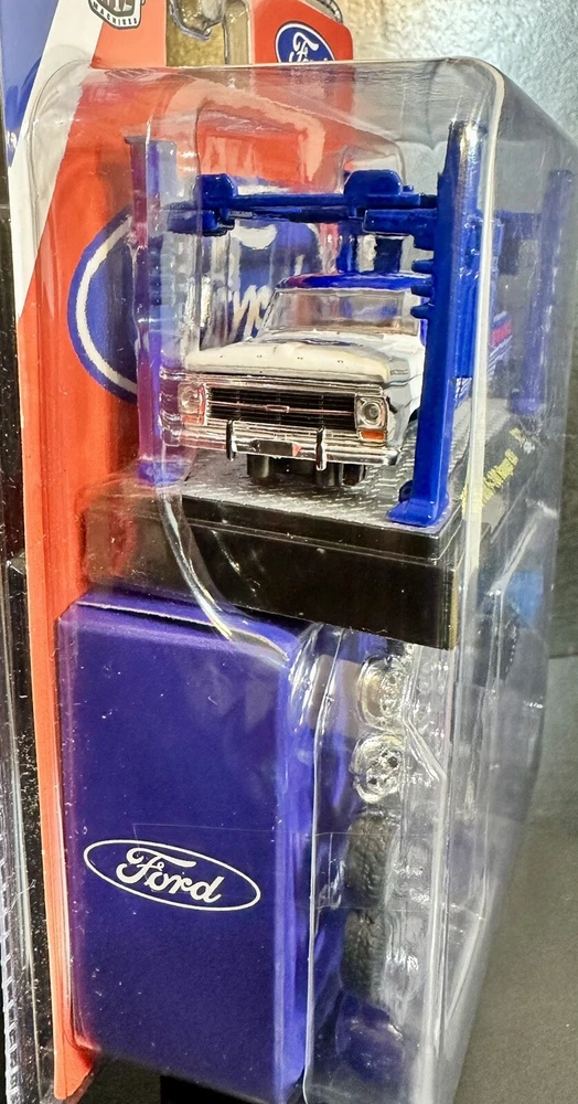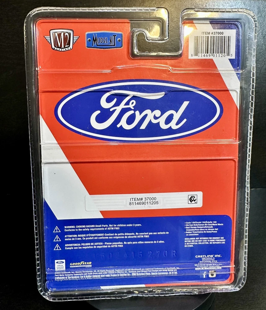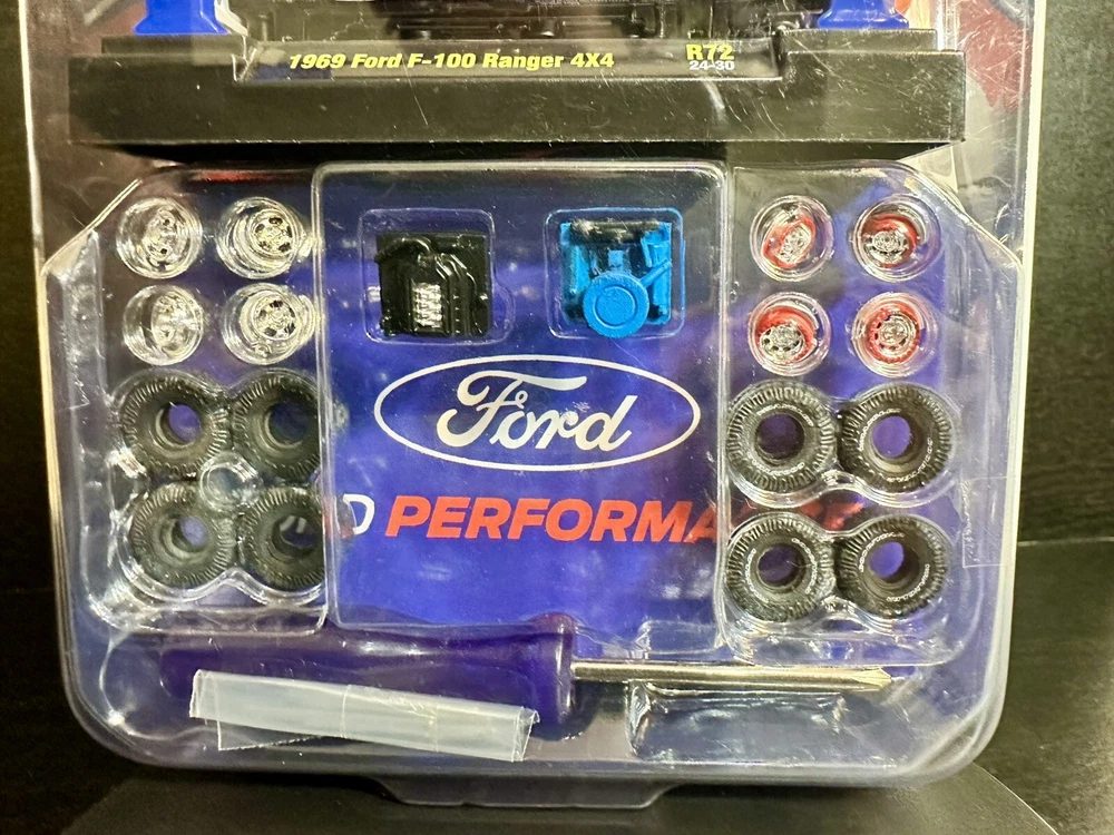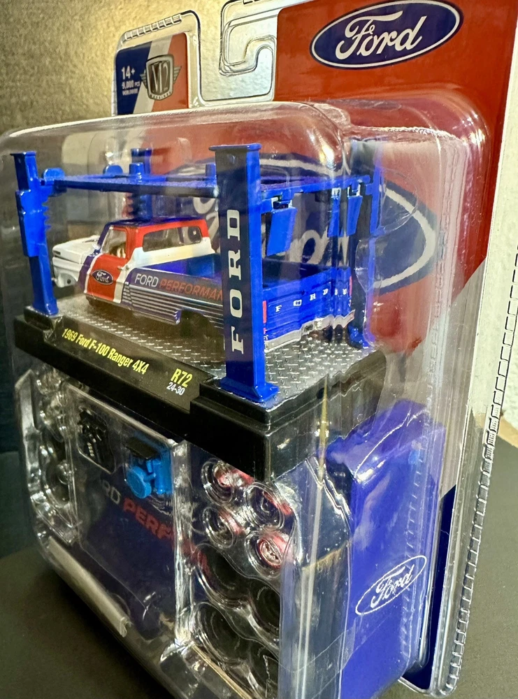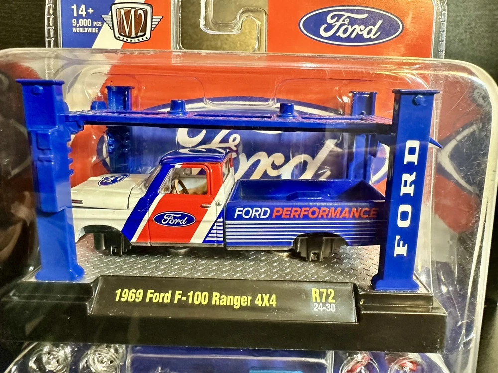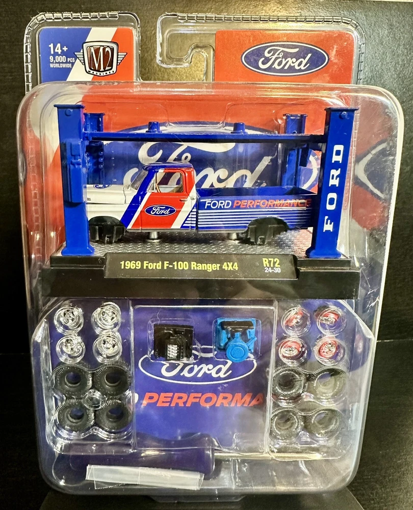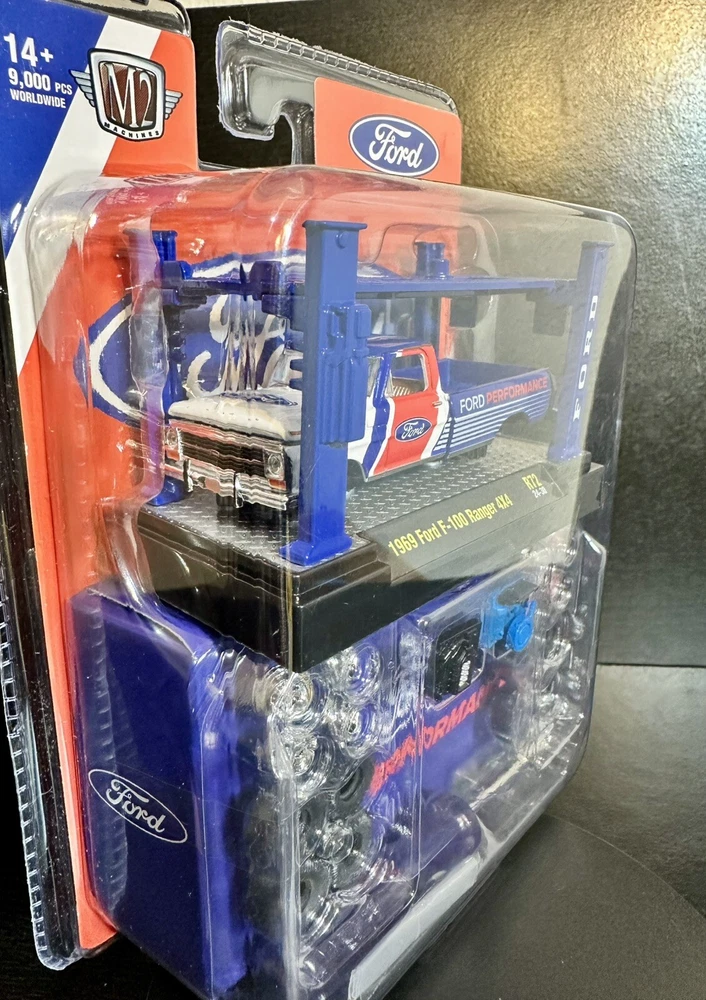 The M2 Machines Model Kit features a 1969 Ford F-100 pickup truck in a patriotic red, white, and blue color scheme. This 1:64 scale diecast vehicle is part of the Ford Performance series and comes with a case, making it a special and limited edition collectible. It is a 4x4 Ford Ranger F-100 model from 2024, suitable for children aged 17 and up. The unopened box adds to the appeal for collectors and fans of the M2 machines character family. 9,000 pcs worldwide!!!!