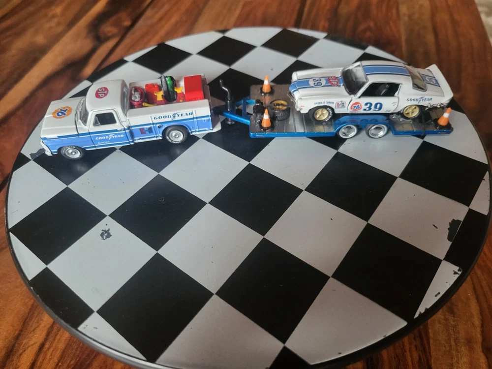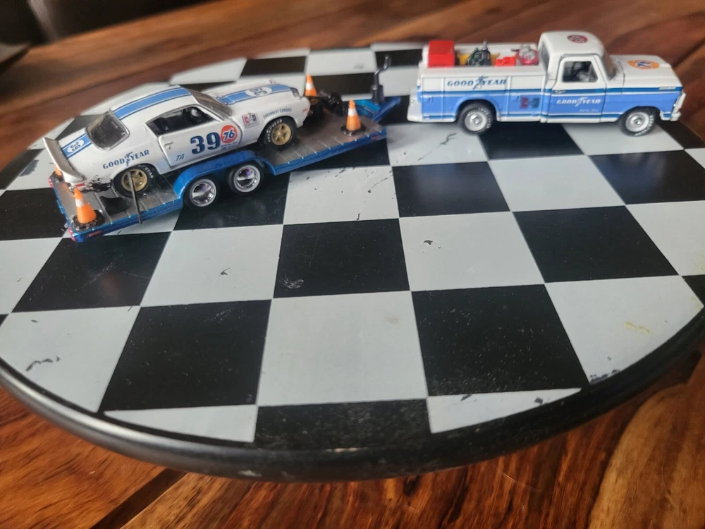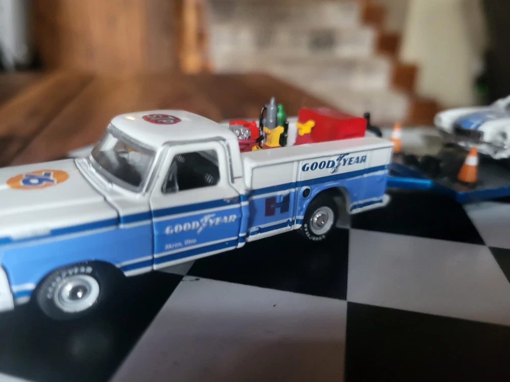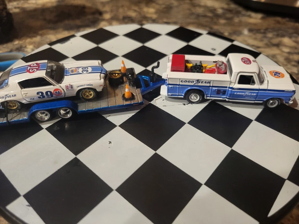 This M2 Machines Customized diecast Set is a utility Goodyear truck in blue-white is a 1:64 scale model of a 1967 Ford F-100 with a custom cab and Goodyear theme. Add-on's to it is Air Compressor With Air Hose,Tool Box,1-Gas can,Jack and 2 Jack stands, Torch set w/stand,plus Racing Decals, With Goodyear 1972 Camino Z/28 Add-on's toit Racing Decals Plus a Blue Diecast Car Hauler,Add-on's to it are 1 Spare Racing Tire and wheel, 4 Safety Cones, 2 Cable looking car tie downs,With All this Gives it a Cool one of a Kind look that is a Must have for any Diecast collectors Shelf! Makes it With It features a Chase design and was manufactured in 2019 in China. The truck is perfect for collectors and enthusiasts aged 17 years and up, and is suitable for both boys and girls.Is a Awesome Customized vehicle Goodyear model Set, is part of the Chase series. The truck also includes a trailer and is customized with the Goodyear brand. PLEASE see all photos and contact me with any questions please,The Set is a Loose set but is wrapped up good for shipping,Thanks again for looking at my Item