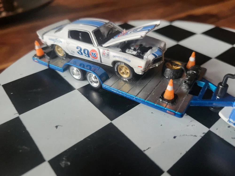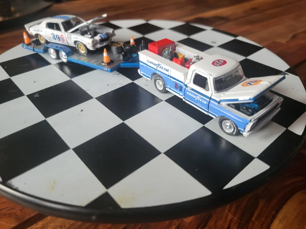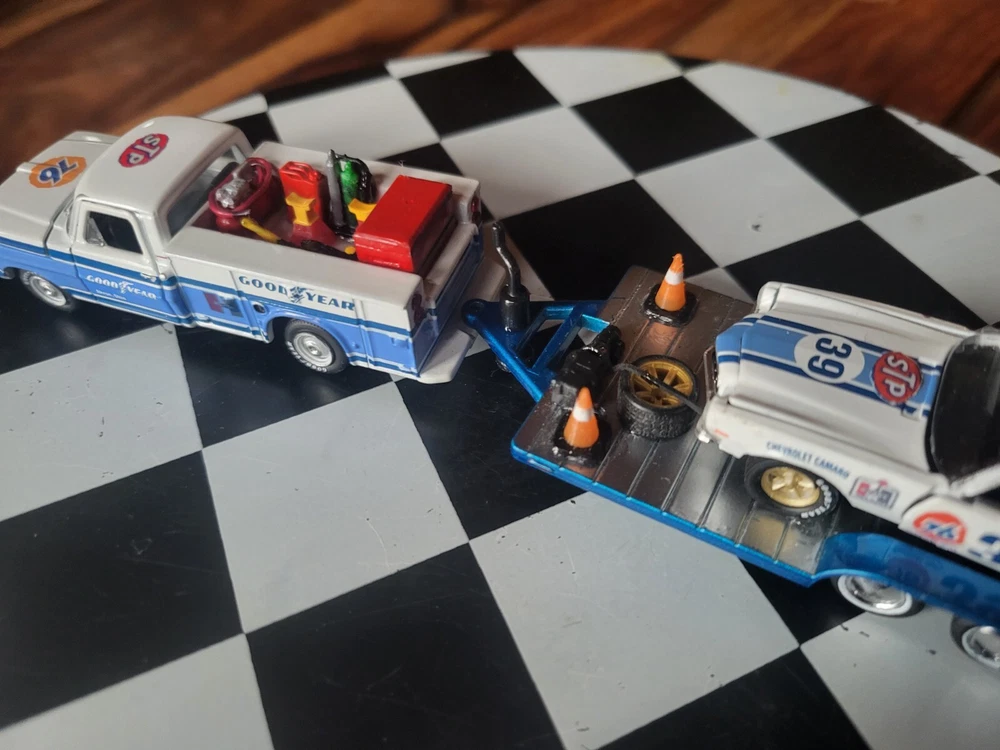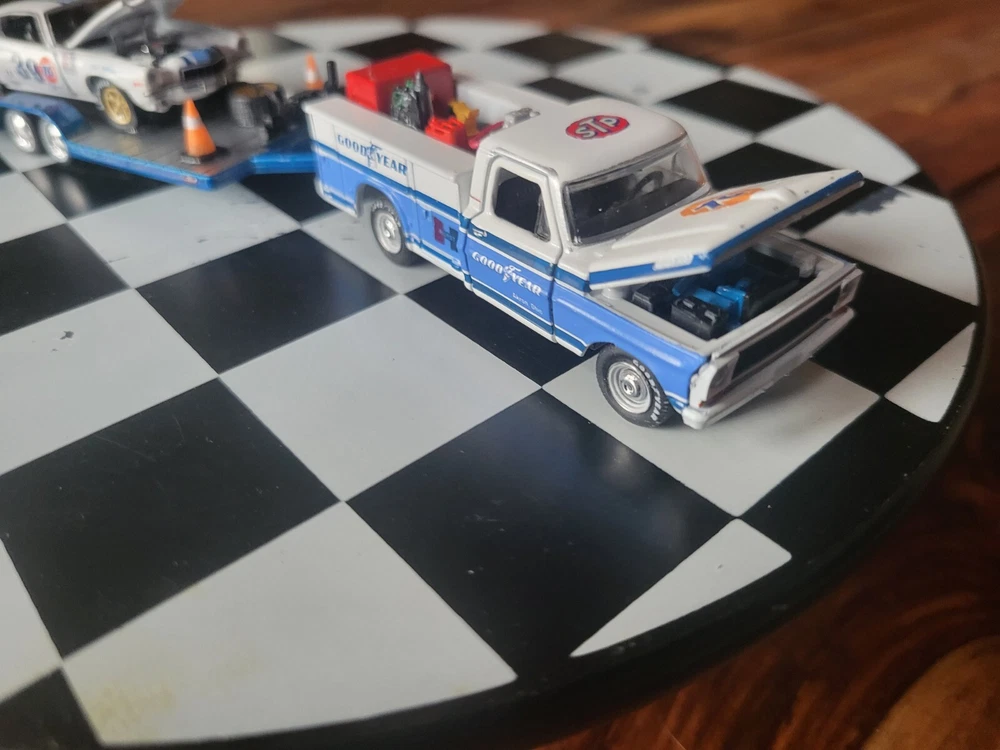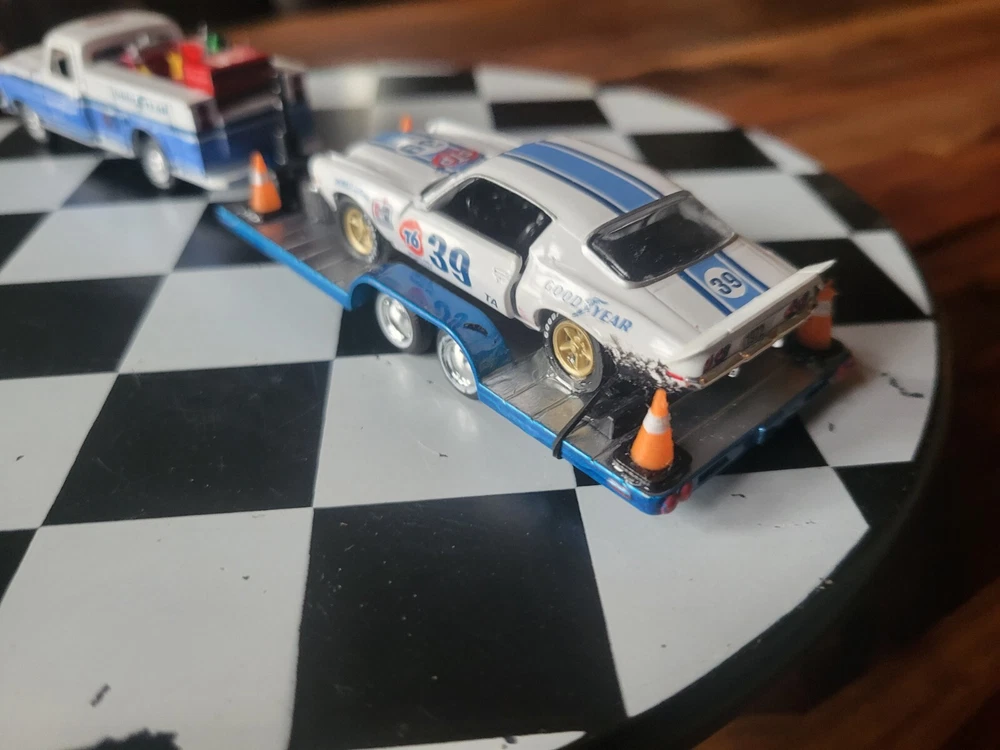 This M2 Machines Customized diecast Set is a utility Goodyear truck in blue-white is a 1:64 scale model of a 1967 Ford F-100 with a custom cab and Goodyear theme. Add-on's to it is Air Compressor With Air Hose,Tool Box,1-Gas can,Jack and 2 Jack stands, Torch set w/stand,plus Racing Decals, With Goodyear 1972 Camino Z/28 Add-on's toit Racing Decals Plus a Blue Diecast Car Hauler,Add-on's to it are 1 Spare Racing Tire and wheel, 4 Safety Cones, 2 Cable looking car tie downs,With All this Gives it a Cool one of a Kind look that is a Must have for any Diecast collectors Shelf! Makes it With It features a Chase design and was manufactured in 2019 in China. The truck is perfect for collectors and enthusiasts aged 17 years and up, and is suitable for both boys and girls.Is a Awesome Customized vehicle Goodyear model Set, is part of the Chase series. The truck also includes a trailer and is customized with the Goodyear brand. PLEASE see all photos and contact me with any questions please,The Set is a Loose set but is wrapped up good for shipping,Thanks again for looking at my Item
