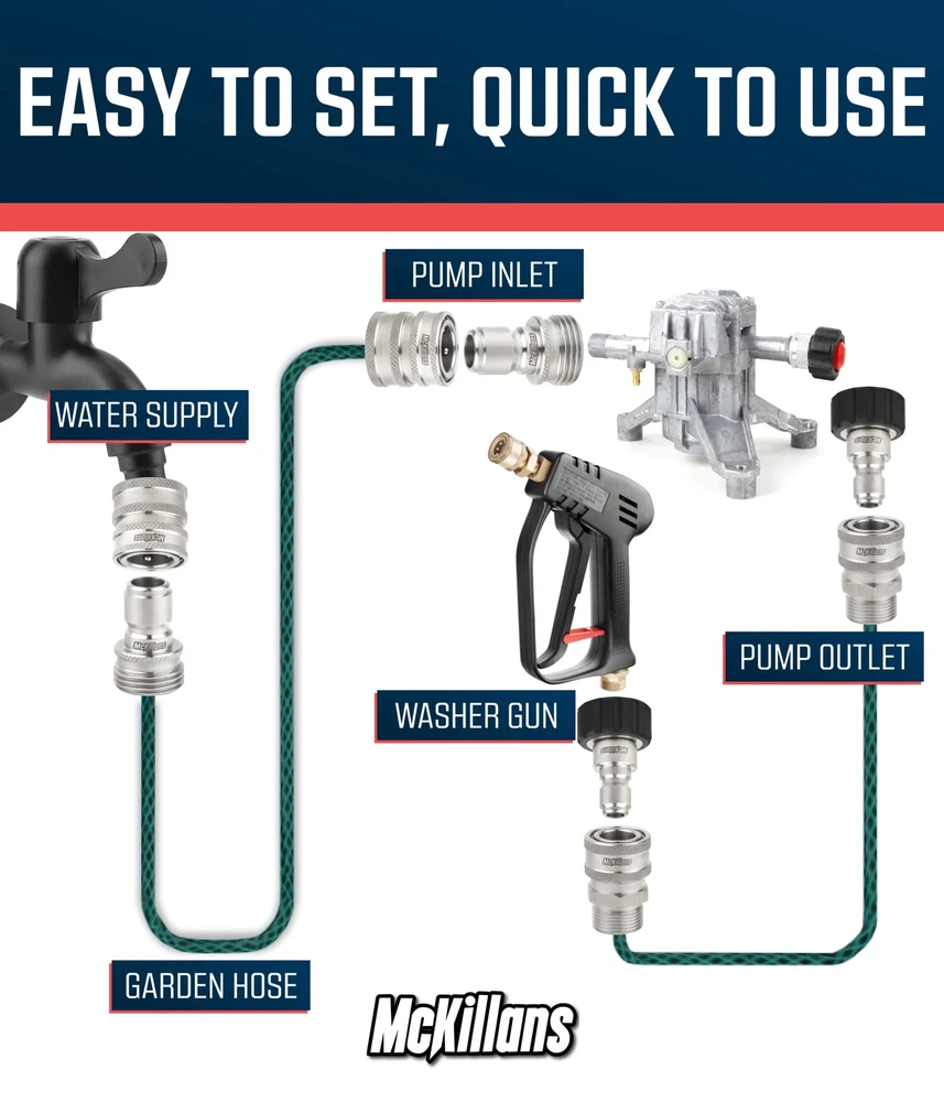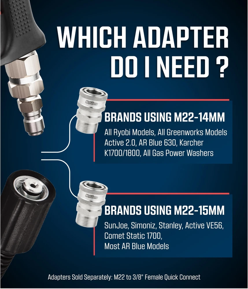 **READ** Please verify you have an M22-14mm hose prior to purchasing. The male adapters have a plug with a diameter of 14mm, not 15mm. Therefore, it is not compatible with electric pressure washers from: Sun Joe, AR Blue, Simoniz and more. If your washer requires a 15mm fitting, using this fitting will cause leaks. Compatible with all gas powered pressure washers with M22 connectors ✅ The Complete Solution: Every connector and adapter you need to convert all your connects on your pressure washer to full stainless quick connects, in one kit. ✅ Smooth Operation: The corrosion resistant stainless steel helps ensure smooth operation of the connects. ✅ Machined in Stainless Steel: Every connector is made out of 304 medical grade stainless steel, which does not rust or tarnish. ✅ Upgraded O-Rings: Made from Viton, a temperature and chemical resistant rubber compound, and much more robust than traditional o-ring materials. ✅ What's included: - M22-14mm male plugs (QTY 2) - M22-14mm female (QTY 2) - 2 male garden hose plugs (QTY 2) - 2 female garden hose QC (QTY 2) ✅ Compatibility: All gas pressure washers use standard M22-14mm hoses. Some electric pressure washers like SunJoe, AR Blue, and Active VE52 use M22-15mm hoses which will not work with this kit.