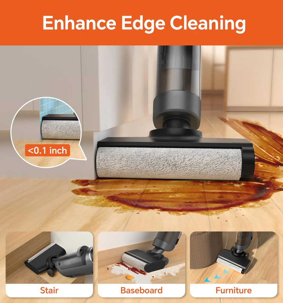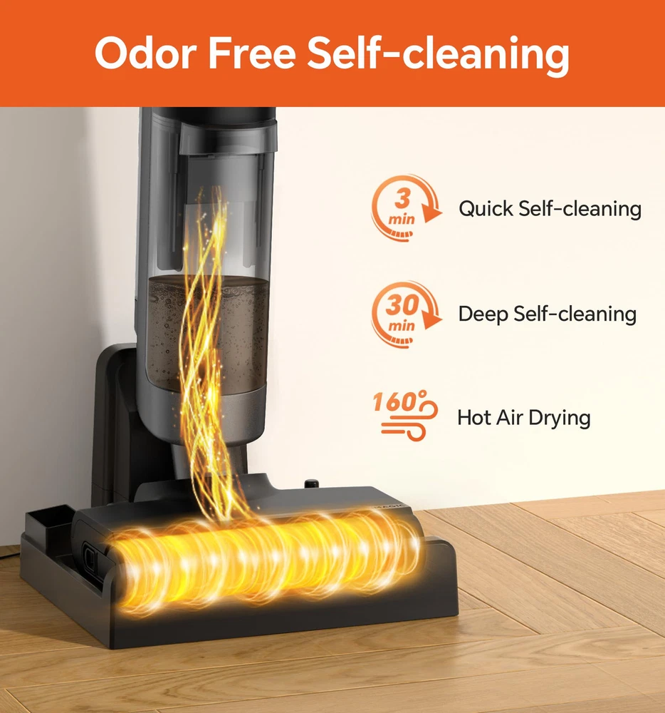 Vacuum and Mop in One Step: Effortlessly clean wet or dry messes and tackle sticky spills on hard floors at the same time. Suitable for sealed hard floors including hardwood, tile, marble, laminate, vinyl 160°F Hot Air Drying: Activate the deep or quick self-cleaning cycle to clean the brush and tubes. The enhanced Deep Self-Cleaning Mode uses 160°F hot air drying to keep the mop vacuum cleaner dry, fresh and odorless Fresh Water Cleaning: The wet dry vacuum cleaner ensuring completely dry and streakless floors in minutes with a water recovery rate of over 92%. Dual-tank design ensures you always clean with fresh water Edge Cleaning & Self-Propelled: The exclusive brush roller allows for precise cleaning of baseboards and corners. The cordless vacuum mop effortlessly moves around your home and stairs with its lightweight and self-propelled design 2.5 Hours Fast Charging: This vacuum mop all in one features the latest fast charging technology, fully charging in just 2.5 hours for 35 minutes of uninterrupted cleaning. Integrated LED screen and voice prompts for a guided cleaning experience
