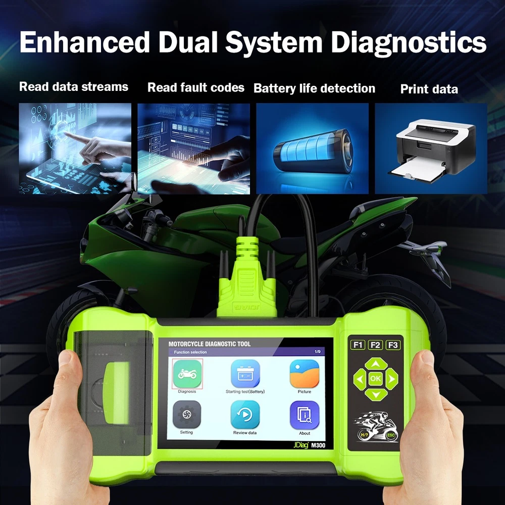 Description: 1. The motorcycle was left idle in the garage for a few months during business trips and travel, and could not be started when it was in use. 2. Forget to turn off the lights when leaving the car battery drain too much power can not start. 3. Winter temperature is too low, the vehicle battery capacity is not enough, serious power loss can not start normally. 4. Motorcycle circuit failure, resulting in failure to start, long repair time. 2023 New Arrival JDiag M300 Motorcycle Diagnostic Scanner Helps the technician to diagnose problems and make repairs faster JDiag M300 Moto Scanner is the new generation handheld Motorcycle Diagnostic tool in 2023 year, it covers virtually all major manufacturers' diagnostic function. It helps the technician to diagnose problems and make repairs faster;many common procedures are written into the tool so the technician can follow them (injectors, ignition, coils, fuel pump, etc.). and after diagnostic, can print the diagnosis report. M300 Funtion: 1. Read system information 2. Read data streams 3. Read fault codes 4. Clear fault codes 5. Freeze fault code 6. Battery life detection 7. CO idle adjustment 8. Troubleshooting guide 9. Print test results 10. Upgrade online 11. ABS system test Support Multi-Languages: English Spanish German French Italian Portuguese Polish Chinese Japanese Korean Specifications: Display screen: 5.0 inches Operating Voltage: 9-18V Operating temperature: 0-60 degrees celsius Storage temperature: -40-70 degrees celsius