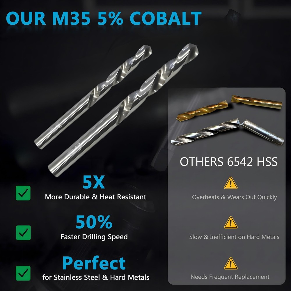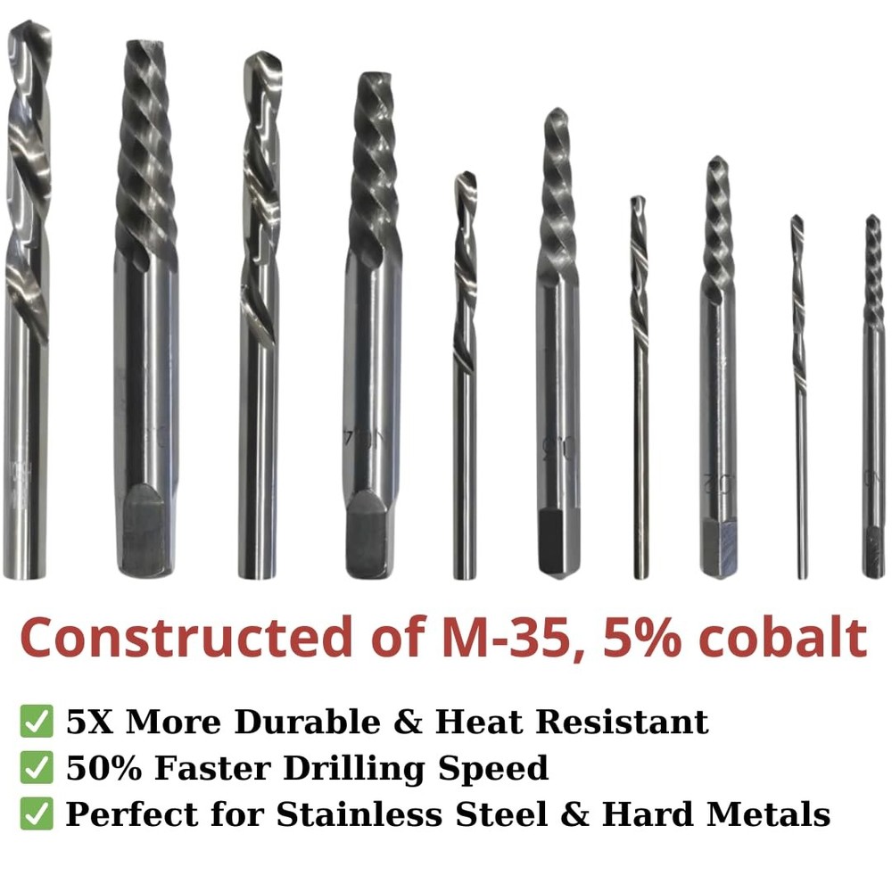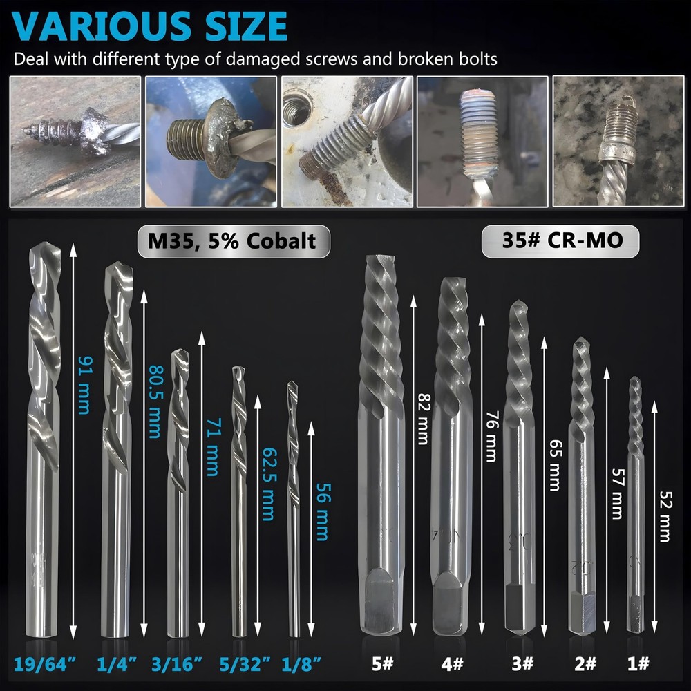 Tired of dealing with stripped, broken, or rusted fasteners? Our screw extractor set is the ultimate solution for removing damaged screws and bolts without the frustration. This complete broken bolt extractor kit includes 5 high-speed reverse drill bits and 5 extractors made for tackling the toughest jobs. Whether you're facing a snapped screw or a seized bolt, this easy out screw extractor set makes removal fast, precise, and hassle-free. Crafted with premium M35 5% cobalt steel, our left hand drill bit set delivers exceptional durability and heat resistance—ideal for repeated use. The 135° split point design improves drilling efficiency and reduces walking on surfaces. Combined with our high-torque bolt remover tools, this kit becomes your go-to stripped screw removal tool for every toolbox. Whether you're a DIYer or a professional mechanic, this stripped screw extractor is designed for all materials—wood, metal, or plastic. The screw remover and extractor set comes organized in a rugged storage case for portability and protection. Perfect as a screw extractor set small for tight spaces or heavy-duty tasks, this ez out bolt extractor set is built to deliver. Includes: 5pcs M35 reverse drill bit extractor set (1/8", 5/32", 3/16", 1/4", 19/64") 5pcs CR-MO broken screw extractor set (#1 to #5) Durable storage box From removing broken bolts to fixing damaged threads, this all-in-one extractor set is your trusted easy out set. Whether you're working on engines, furniture, or appliances, trust our damaged screw extractor set to get the job done. Great for home improvement, automotive repair, and industrial use, this screw extractor kit ensures you’ll never be stuck again. Works as an easy outs extractor sets Reliable extractor kit for international users Includes all tools in one compact extractor kit Don’t waste hours struggling with stuck hardware—upgrade to the best easy out bolt extractor set and make extractions smooth and stress-free. ✅ PREMIUM DURABILITY – M35 COBALT HSS: Made from M35 cobalt-reinforced high-speed steel (HSS), these left-hand drill bits provide superior strength and wear resistance for extended use. ✅ SAVE TIME & EFFORT – EASY BOLT REMOVAL: Quickly extract stuck, stripped, or broken screws and bolts with this professional screw extractor kit. A must-have for home repairs, automotive work, and industrial maintenance. ✅ 135° CUTTING ANGLE – IMPROVED PRECISION: The EZ Out bolt extractor set features a 135° split point tip, allowing faster drilling with reduced resistance. This design ensures a cleaner cut without damaging surrounding materials. ✅ VERSATILE USE FOR WOOD & METAL: Designed for multiple applications, this drill extractor works on wood, metal, and plastic. Ideal for DIY projects, home improvement, automotive repairs, and professional workshops. ✅ 10-PIECE SET WITH STORAGE CASE: Includes 5 left-hand drill bits & 5 bolt extractors. Screw Extractors: #1, #2, #3, #4, #5. Left-Hand Drill Bits: 5/64", 7/64", 5/32", 1/4", 19/64". Compact storage case keeps tools organized and protected.