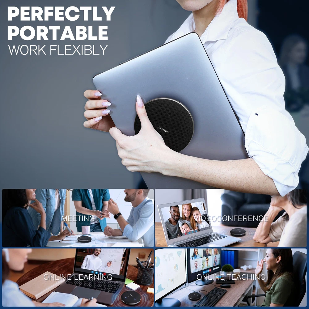 【AI Transcription】Use with the "notta" app, it can provide you AI transcription for real-time speech-to-text conversio. It includes real-time recording transcription, transcription of audio files, AI-generated full-text summaries, AI-assisted writing, remote meeting recording, real-time subtitle interpretation and more. Cater a wide range of office needs across multiple scenarios, devices, and formats. Enhance efficiency and intelligentize your meeting experience. 【360° Omnidirectional Voice Pickup】The M4 conference speaker features a 360°omnidirectional Voice Pickup function that is equipped with 4x microphones array and intelligent Hi-Fi speakers. It can pick up clear audio up to 16ft range and amplify sound, providing a richer and fuller sound compared to regular speakers. This ensures that all 5-6 participants sitting in various corners of a large conference room can hear every single word without missing any details. 【AI-Powered Noise Reduction】Say goodbye to noisy conference calls with our M4 speakerphone! This M4 bluetooth speakerphone is equipped with advanced AI technology that has been trained on thousands of hours of real-world conference call data. By intelligently differentiating between human voices and ambient noises, common background noises in the workplace, such as mouse or keyboard clicks, loud conversations and other noise, can be effectively reduced. Ideal for office or home working. 【Full-Duplex Communication】What’s the Difference Between Half-Duplex and Full-Duplex? A full-duplex speakerphone setup allows multiple users to communicate simultaneously, a half-duplex system only allows one party to speak at any given time. Just like a walkie-talkie. Introducing M4 speakerphone with AI-powered voice enhancement technology, ensuring seamless full-duplex communication. Say goodbye to the chaos of shouting and crowded conversations during conference calls. 【Stable Connection】 M4 conference speakerphone is plug-and-play via USB and pairs easily with Bluetooth or NFC. No drivers are needed for this computer/laptop/mobile speaker with microphone, making it compatible with popular conferencing platforms such as Zoom, Skype, Teams, WebEx and more. Lightweight and portable, our conference speakerphone provides up to 10 hours of battery life on one charge.
