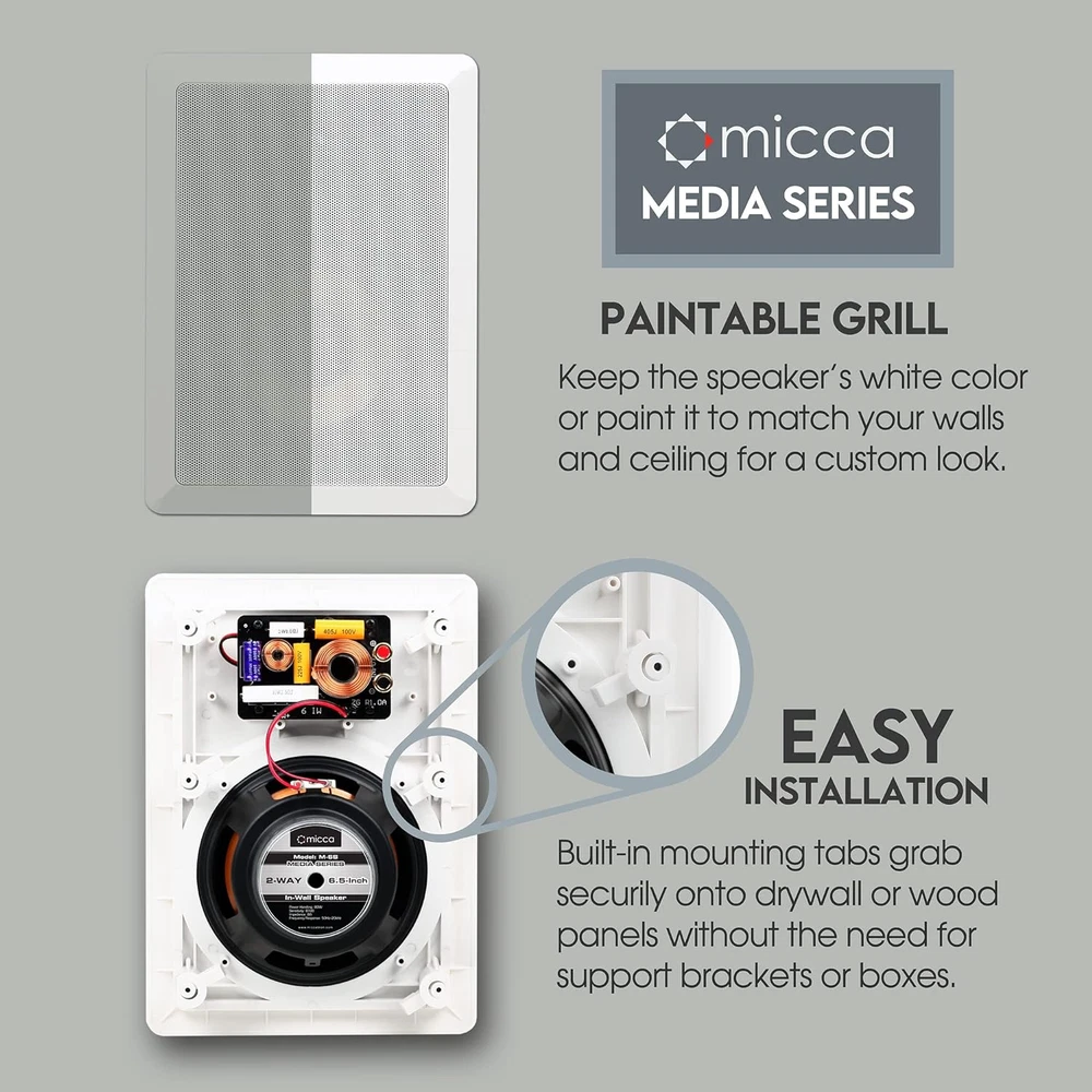 Store New Arrivals Add to Favorite View Feedback Contact M-6S 2-Way In-Wall Speaker, 7.3"(W) by 10.7"(H) Cutout, Home Theater, Whole House Audio, Indoor or Covered Outdoor, 6.5" Woofer, 1" Tweeter, White, Paintable, Each Description Item model number M-6S Style 6.5-Inch In-Wall Number of Items 1 Power Source Corded Electric Control Method App Warranty Type Limited Tweeter Diameter 1 Inches Woofer Diameter 6.5 Inches Controller Type Corded electric Unit Count 1.0 Count Speaker Size 6.5 Material Composite Includes MP3 player? No Model Name Media ICW Impedance 8 Ohm Recommended Uses For Product Surround Sound, Whole House Audio, Home Theater Is Discontinued By Manufacturer No Specific Uses For Product Home Theater, Whole House Audio, Indoor or Covered Outdoor Included Components User Manual, Installation Template, Speaker Subwoofer Diameter 6.5 Inches Country of Origin China Speaker Maximum Output Power 80 Watts Connectivity Protocol NA - Wired connection Item Weight 3.15 pounds Connectivity Technology wired Special Feature Bass Boost Mounting Type Ceiling ; Wall-mount Color White Surround Sound Channel Configuration 2.0 Compatible Devices Projector, MP3 Player, Laptop, Desktop, Television, Tablet, Smartphone Speaker Type Subwoofer Global Trade Identification Number 00741360330856 Is Waterproof FALSE Audio Output Mode Surround Product Dimensions 3.4"D x 8.7"W x 12.1"H UNCOMPROMISING AUDIO QUALITY - Micca Media Series in-wall speakers are designed for optimal performance in a wide variety of home audio applications, from relaxing background music to high-impact home theater systems. Their smooth and natural sound signature with robust bass output deliver an engaging listening experience. EASY TO INSTALL - The built-in mounting tabs grab securely onto drywall or wood panels with no need for additional brackets or boxes. With durable construction and materials, Micca in-wall speakers are great for family rooms, living rooms, bedrooms, kitchens, bathrooms, and covered outdoor porches, providing years of lasting enjoyment. MODERN AND ELEGANT - Using a rimed grill design, the Micca Media Series in-wall speakers protrude minimally from the wall and blend unobtrusively into any decor. When painted to match the wall color, they become virtually invisible, giving you great sound without taking up valuable space. ENGINEERED FOR GREAT SOUND - The M-6S utilizes a high excursion 6.5-inch poly woofer and a pivoting 1-inch silk dome tweeter that can be aimed to project a spacious sound stage. Perfect integration between the tweeter and woofer is achieved through a 12dB crossover network that ensures coherent transition in the critical upper midrange region. SPECIFICATIONS - Frequency Response: 50Hz-20kHz; Impedance: 8 Ohms; Sensitivity: 87dB 1W/1M; Power Handling: 80 Watts (Each); Outer Dimension: 8.7” (W) x 12.1” (H); Cutout Dimension: 7.3” (W) x 10.7” (H); Mounting Depth: 2.9” NOTE: This listing is for one speaker, buy as many as needed! The Micca M-Series of in-wall and in-ceiling speakers have been designed for optimal performance in a wide variety of home entertainment applications, from providing relaxed background music to a high-impact 7-channel home theater system. Built with high-quality components and rigorously tested design, M-Series speakers deliver exceptional value and are well reviewed by owners and critics. Dynamic and Balanced The M-6S is a 2-way in-wall speaker with a high excursion 6.5" poly woofer and a 1" soft dome tweeter. This combination provides great flexibility in terms of application and suitability to different music tastes. In addition to smooth and natural vocals, the 6.5" woofer is capable of excellent bass output, delivering impactful performance and ensuring seamless integration if a subwoofer is used. Imaging and Clarity The 1" soft dome tweeter provides abundant detail and clarity, generating solid and focused imaging for all sound sources in a spacious sound stage. Designed for a broadened listening sweet spot, the tweeter employs a diffuser to assist with the off-axis response as well as a pivoting mechanism to achieve proper aiming. Perfect integration between the tweeter and woofer is achieved through a 12dB crossover network. Once installed and set up, the M-6S projects a realistic sound stage with excellent resolution. Specifications - Woofer: 6.5" Mica-Poly Cone, Butyl Rubber Surround - Tweeter: 1" Pivoting Silk Dome, Ferrofluid Cooled - Crossover: 12dB/Octave - Frequency Response: 50Hz-20kHz - Impedance: 8 Ohms - Sensitivity: 87dB 1W/1M - Power Handling: 80 Watts (Each) - Outer Dimension: 8.7" (W) x 12.1" (H) - Cutout Dimension: 7.3" (W) x 10.7" (H) - Mounting Depth: 2.9" ABOUT US We offer the best prices around on high quality products. Our E-store includes media such as books, movies, music and games while offering electronics, toys, sporting apparel, clothing, tools, general home, garden items and more. SHIPPING We are always working hard to ensure your package arrives as soon as possible. Please understand that some factors like weather, high postal traffic, and the performance of shipping companies are outside of our control. We offer free shipping to the lower 48 states and ship within 2 business days of payment, usually sooner. We do not accept P.O. Boxes. Please provide a physical address. For shipping outside of the continental USA, we only use eBay's Global Shipping Program.The item is shipped to KY and then sent to the rest of the world. International customers are responsible for all duties and taxes. Continue to check out in order to calculate costs for shipping the item to your country. Messages regarding eBay's Global Shipping Program MUST be directed at eBay EXCLUSIVELY. RETURNS We offer a 30-Day Return Policy on items which you are not completely satisfied with. You have the option for a full-refund or an exchange of the item. No returns are available on items shipped outside of the USA. PAYMENT We accept PayPal. CONTACT US This page 