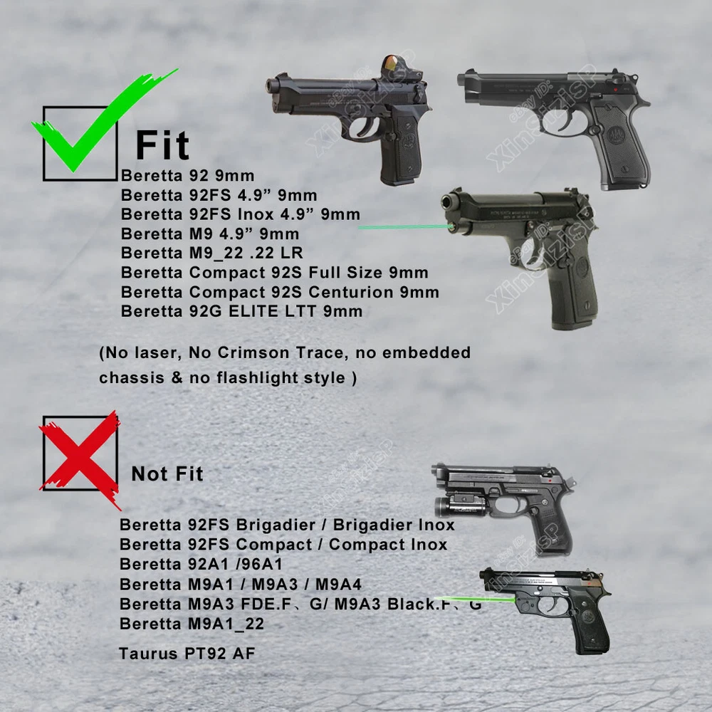 High Quality Military & Police Grade Polymer OWB Holster Specially Designed For Fast Draw During Duty Or Shooting Competition. Item Description: Tactical Outside Waistband Holster for. Holster fit Beretta Beretta 92 9mm Luger Beretta 92FS 4.9” 9mm Luger Beretta 92FS Inox 4.9” 9mm Luger Beretta M9 4.9” 9mm Luger Beretta M9_22 .22 LR Beretta Compact 92S Full Size 9mm Luger Beretta Compact 92S Centurion 9mm Luger Beretta 92G ELITE LTT 9mm Luger Holster fit Taurus PT92 9mm Luger Does not fit: Taurus PT92 AF-D / AF-S (due to the rail being blocked). Beretta 92FS Brigadier / Brigadier Inox / Compact / Compact Inox, 92A1, 96A1, M9A1, M9A3, M9A4, M9A1_22. (It perfect fit the gun with Optic Mount Mini Sight above on the end of the barrel, But without laser and no embedded chassis, and no flashlight style ) Materials & Durable Made of durable high-tech polymer materials - Stronger than leather will wear out, the polymer holster will not wear out and get flimsy.Adapt to every environment High S afety I ndex-finger release for quick release button (Level II retention) An audible click lock system ensures knowing when your weapon is securely holstered A djustable E asily set your paddle /belt cant 0-60 degrees according to your preference with the Allen key Ease And Comfort Easy on / Easy off- No need to undo your belt every time you wear your holster.Sweat-proof- Protect your weapon from salty perspiration and not absorb sweat. In the Package: · 1*Holster with Paddle Attachment · 1*Allen Key Shipping: Ships same day or next except Sundays and Holidays ! Free shipping! Ship by USPS First Class Package. 100% MONEY BACK GUARANTEE. Any question please be free to contact with us .Thanks!