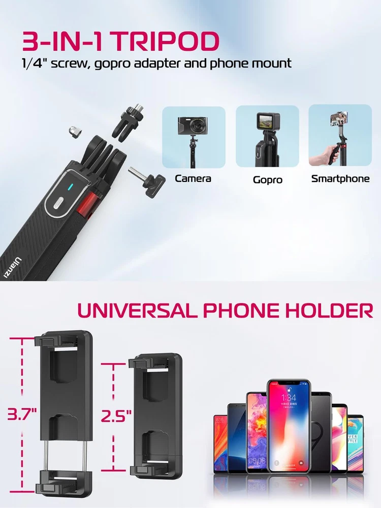 MA09 Extendable Phone Tripod, 71" Selfie Stick Phone Vlog Tripod Stand Quadrapod with All in 1 Phone Clip, Travel Tripod Phone Holder w Rechargeable Remote for iPhone Sony Canon Action Camera ▶【Universal Phone & Camera & Action Camera Tripod with 3 in 1 Integrated Design】Featuring in upgraded and integrated design, MA09 tripod expands itself in the usage of other smart devices other than phone. The adjustable clip on the top can be expanded to universal phone clip to 2.5"-3.7"/65-95 mm which is compatible with most of smart phone, and can be gathered to storage camera through the 1/4" screw thread ▶【360° Rotating Balance Handle】Achieve 360° panoramic shooting, 180° up and down shooting, our phone & camera & Action Camera tripod can adjust various angles for Horizontal & Vertical Shooting, allowing you to capture the perfect shot. You can also attach an action camera or ring light, which makes it not only a phone tripod stand but also a sport camera/ ring light stands ▶【Telescopic Design】The 8-section ABS-made tripod enables fast and fumble-free set-up, making it to easy extend from 18"/460mm to 71"/1800mm which is longer than similar tripod on the market. No need to twist or lock to extend at a certain height where you want to meet your different shooting needs ▶【Type-c USB Rechargeable Wireless Remote Shutter】Free your hands and enjoy the fun of taking pictures remotely with the selfie stick tripod with remote control. Maintains a stable connection over long distances up to 40ft/12m and is compatible with most smartphones such as Android and iPhone. And it supports Type-C charging, no need to replace the battery. ▶【Wide Compatibility】The extendable tripod can works as handle grip or selfie stick or Action Camera tripod, mini and lightweight. Benefiting by the adjustable holder and standard adapter 1/4" screw thread, the vlog tripod is fully compatible with DSLR Camera Nikon Canon G7 Fujifilm Sony RX Panasonic Nikon D610, the photography tripods also works well with iPhone 16/15/14/13/12/11/11 pro/11 pro max/xs/xs max/8, Samsung, Huawei Shipping We offer FREE shipping on all orders! We ship within Three business days of payment, usually sooner. We use a selection of shipping services such as UPS, FedEx, USPS etc. We only ship to the lower 48 states, no APO/FPO addresses or PO Boxes allowed. Local pickups and combined shipping options are not provided at this time. Return You can return a product for up to 30 days from the date you purchased it. Any product you return must be in the same condition you received it and in the original packaging. Please keep the receipt. Payment We accept payment by any of the following methods: PayPal Please pay as soon as possible after winning an auction, as that will allow us to post your item to you sooner! Feedback Customer satisfaction is very important to us. If you have any problem with your order, please contact us and we will do our best to make you satisfied. Contact Us If you have any queries, please contact us via ebay. We usually respond within 24 hours on weekdays. Please visit our eBay store to check out other items for sale! Thank you for shopping at our store.